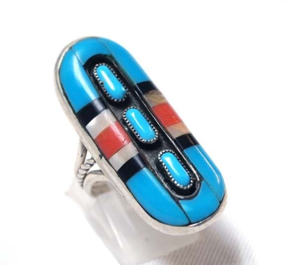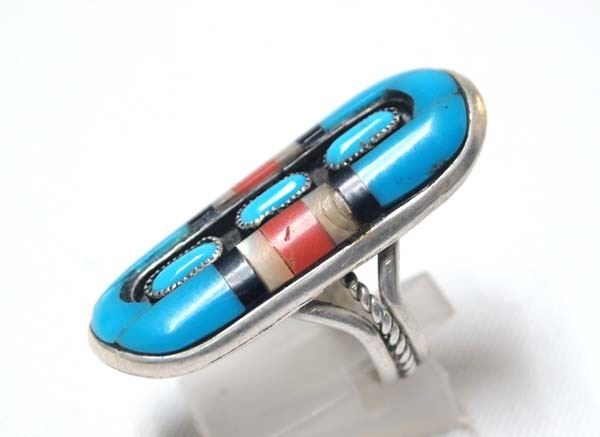 Vintage Native American Navajo Sterling Turquoise Inlay Ring, Size 8, measures 1.75'' x .75'', stones included are turquoise, red shell, jet, and mother of pearl, hallmarked EP (possibly Edward Platero), stunning piece and very flattering on, from the Little White Dove Trading Post in Albuquerque, NM