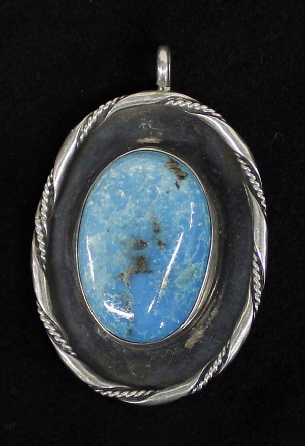 Vintage Native American Navajo Sterling Turquoise Pendant, bold and beautiful measuring 2.25'' x 1.5'', turquoise cab measures 1.25'' x 7/8'', ca. 1960s Little White Dove Trading, 20.82g in total wt.