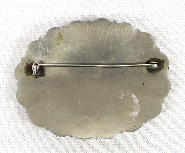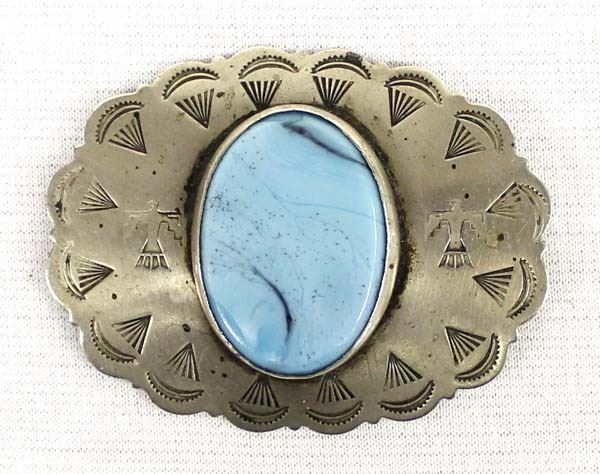 Vintage Native American Navajo Sterling Turquoise Pin, measures 1.5'' x 2.5'', hand stamped details including 2 thunderbirds