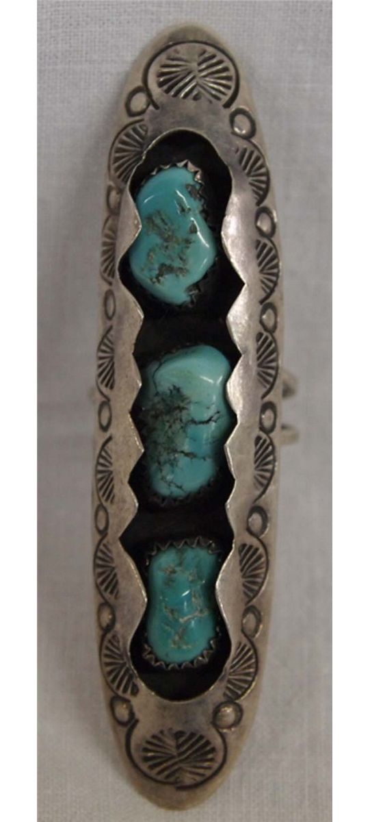 Vintage Navajo Sterling Shadowbox Turquoise Ring, hallmarked VW, Size 7, measures 2.75''L x .75''W, features 3 beautiful turquoise cabochons measuring .5''L x .25''W, double band shank, beautiful hand stamping around shadowbox area, sawtooth bezel set stones, 10.44g in total wt.