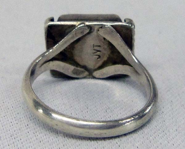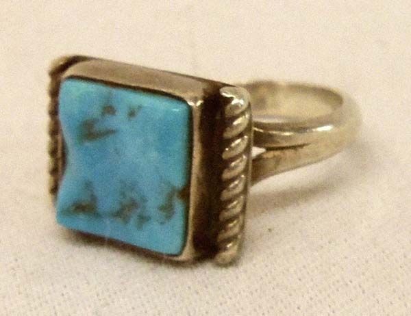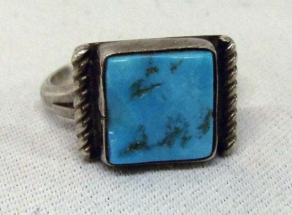 Vintage Native American Navajo Sterling Turquoise Ring, beautiful square nugget with black matrix, twisted silver side accents, stamped ''JVT'' by artist, size 7 and measures approx. .5'' x .5''.