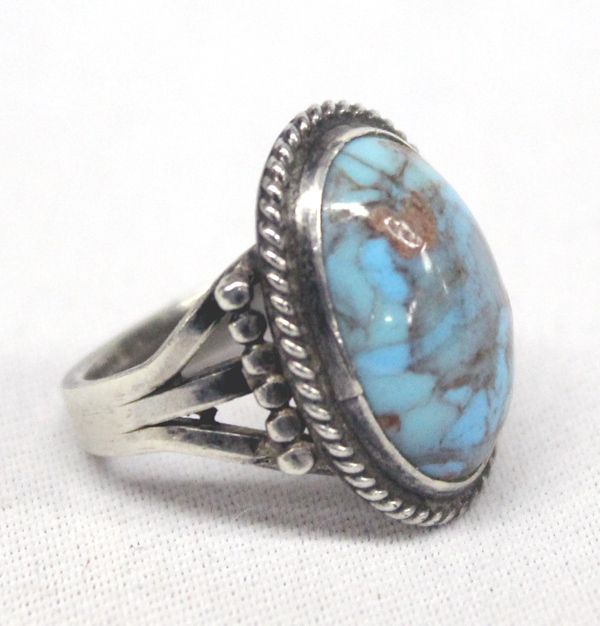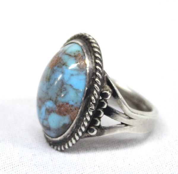 Vintage Native American Navajo Sterling Turquoise Ring, gorgeous cabochon with copper-colored matrix, twisted silver accent piece encompassing cabochon, unsigned, size 5.5 and measures .75'' x .5''.