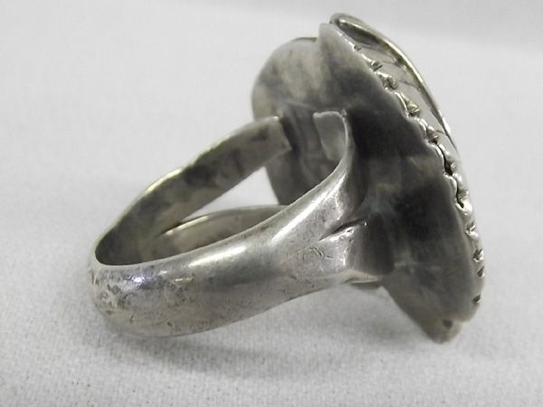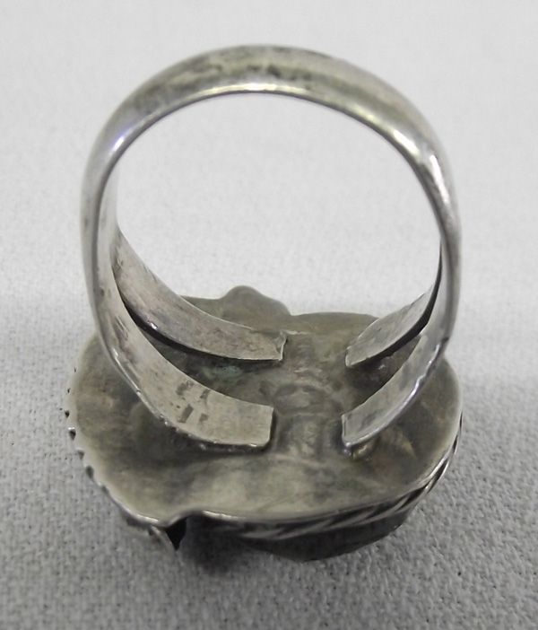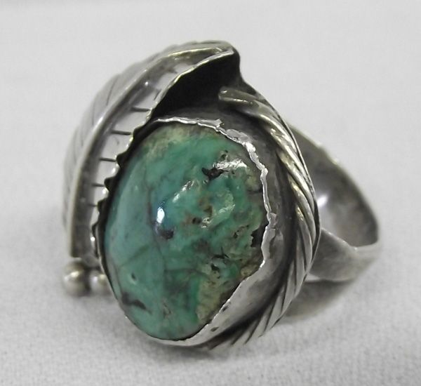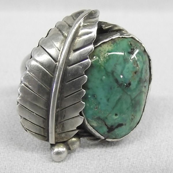 Vintage Navajo Sterling Turquoise Ring, size 11, measures 1''H x 1''W, cabochon measures .75'' x .5'', features traditional style setting of silver bead and leaf designs, double band shank which tapers down into a single band, black wispy matrix