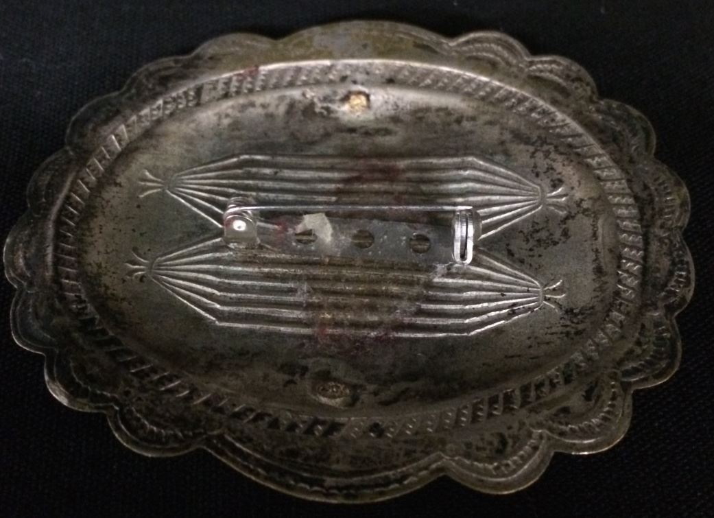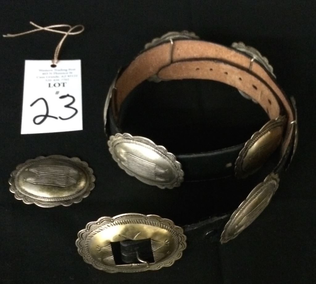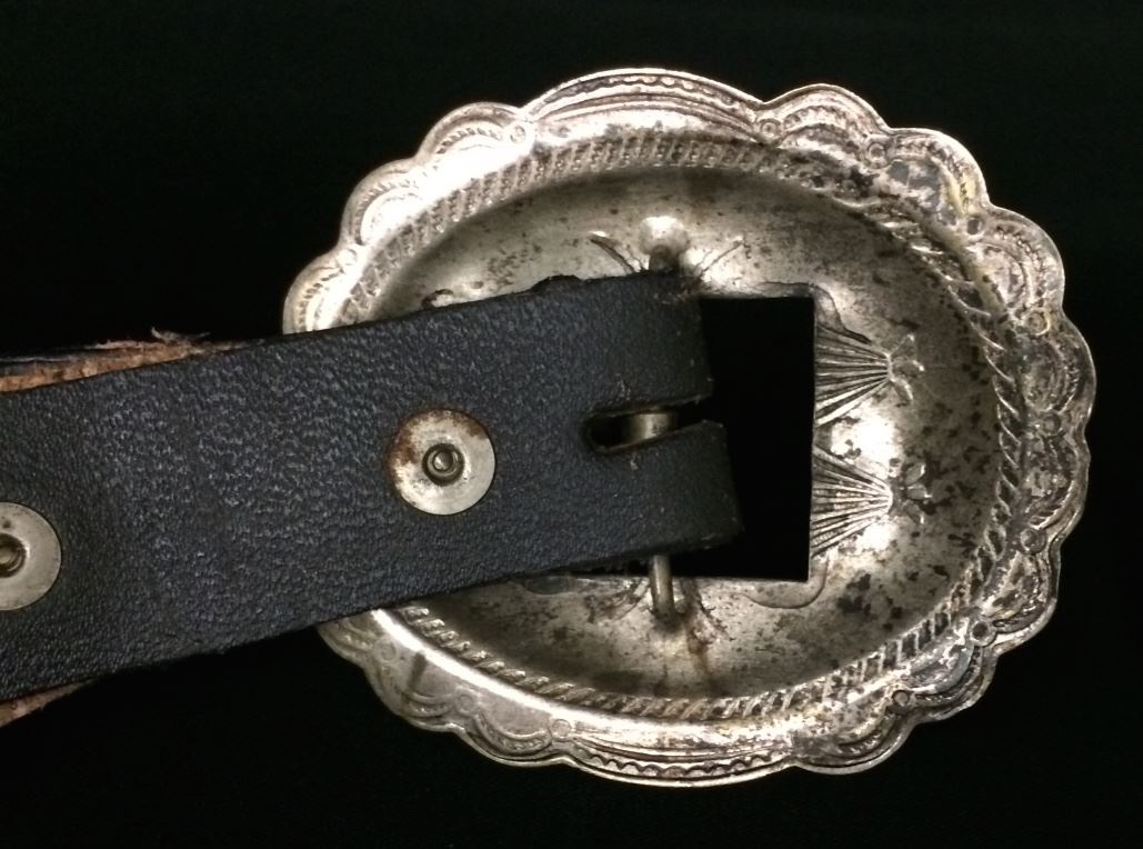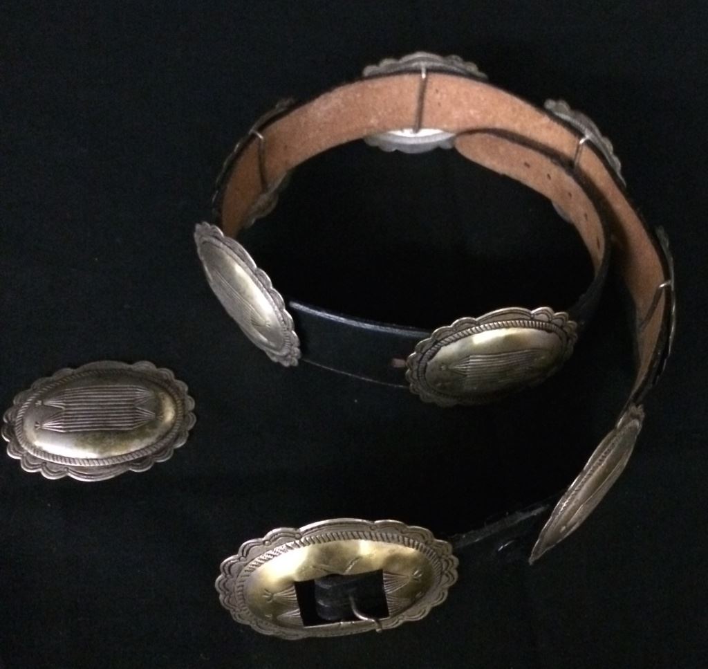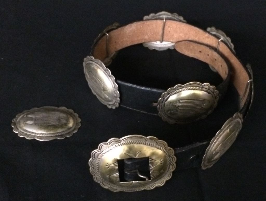 These conchos were recently remounted on new leather belt. At some point in the past, it was sized down and a brooch was made out of an extra concho, which is included. Not signed, but very much like the “tourist” belts being produced circa the 1950s. Belt measures 34” from end to end. German silver. Good vintage condition. Shipping: There will be a $5 handling / packaging fee for shipping this lot. The actual cost of postage will be added on top of that.
