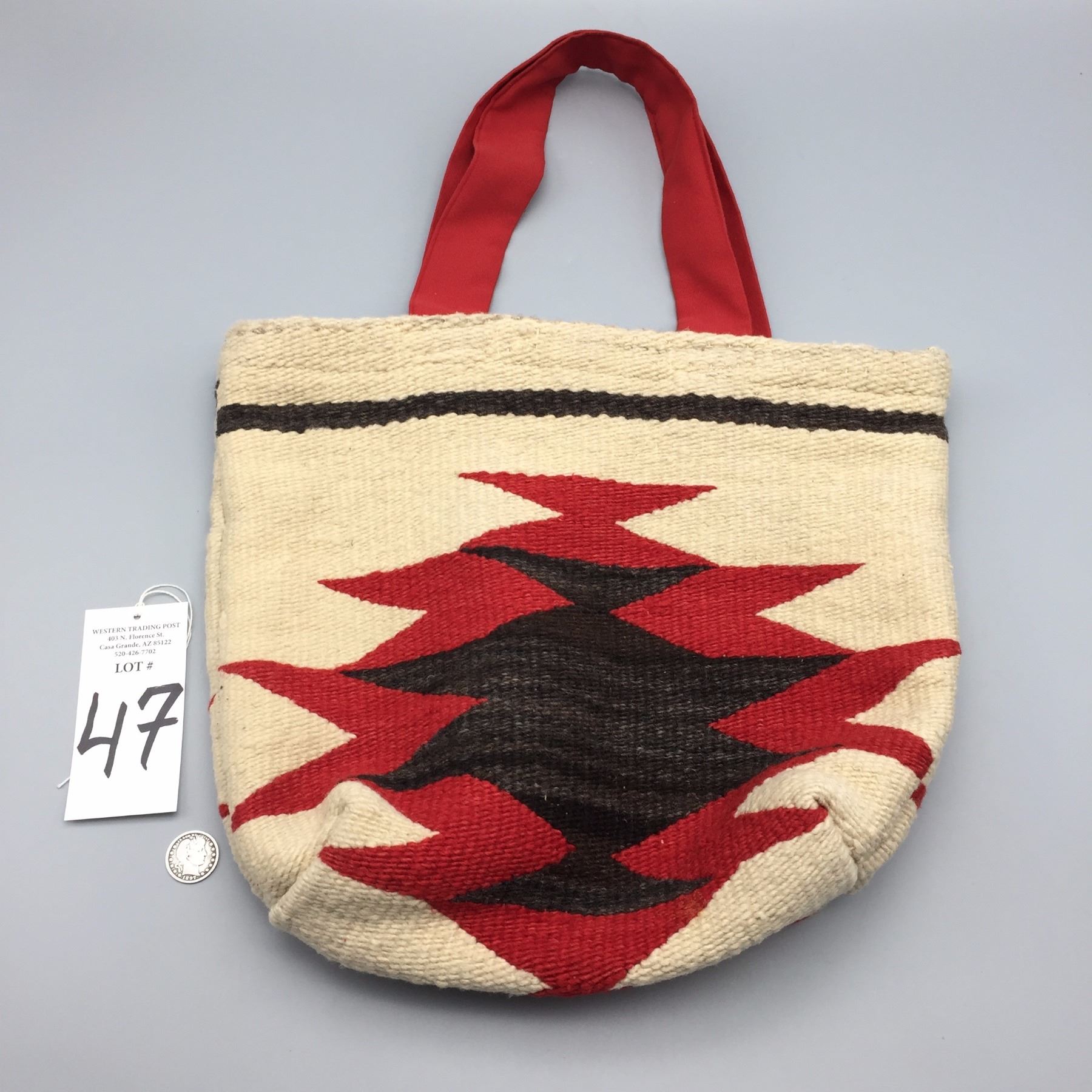 Maker: Unknown. Approx. Age: Vintage. Size: About 14” w x 12” h. Additional Info: Vintage Navajo textile bag. Condition: Good for it’s age, normal wear expected. Please look closely at the pictures - they are an important part of our description. Shipping: There will be a $5 handling / packaging fee for shipping this lot. The actual cost of postage will be added on top of that.