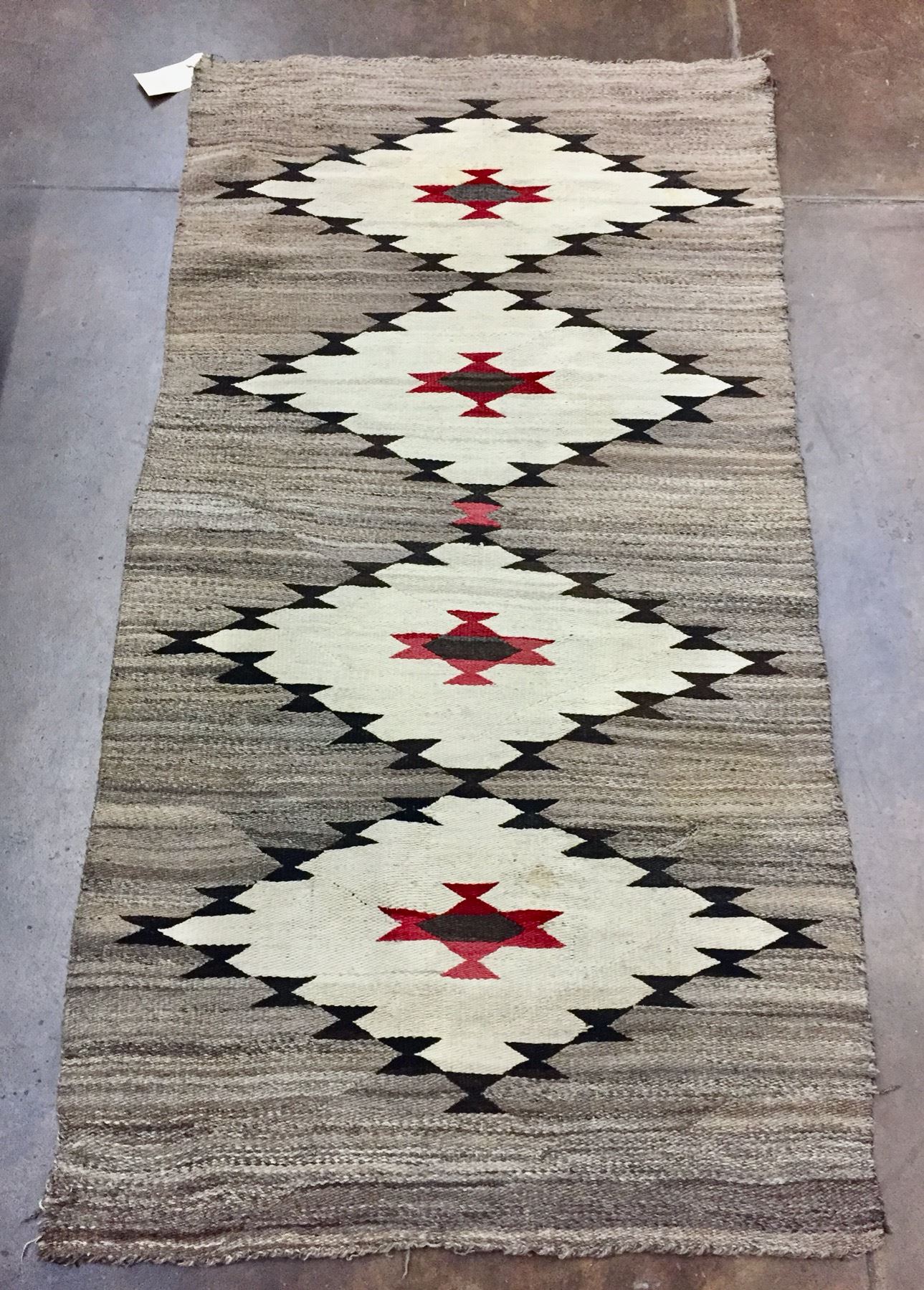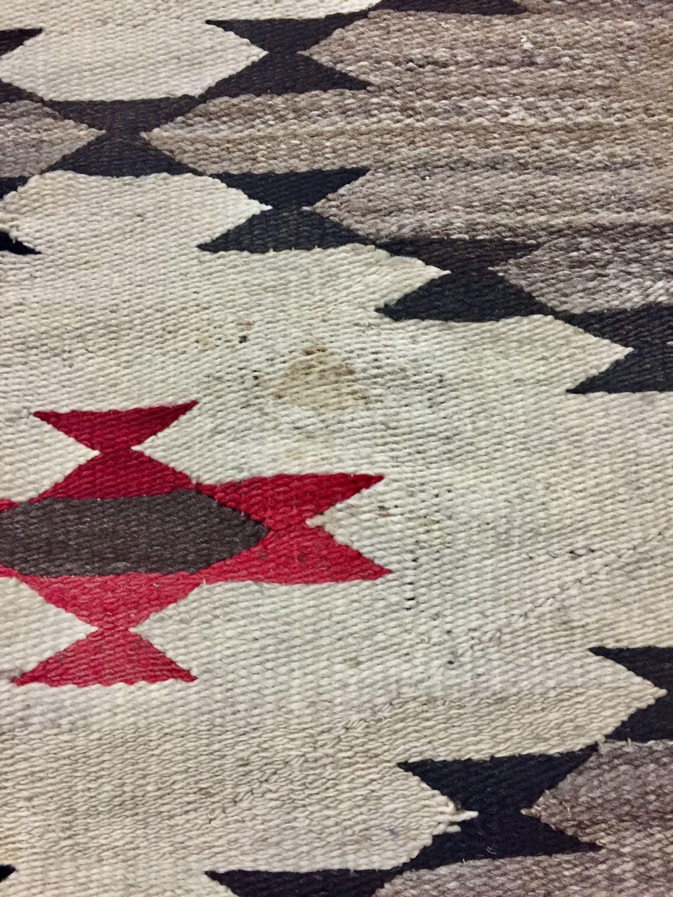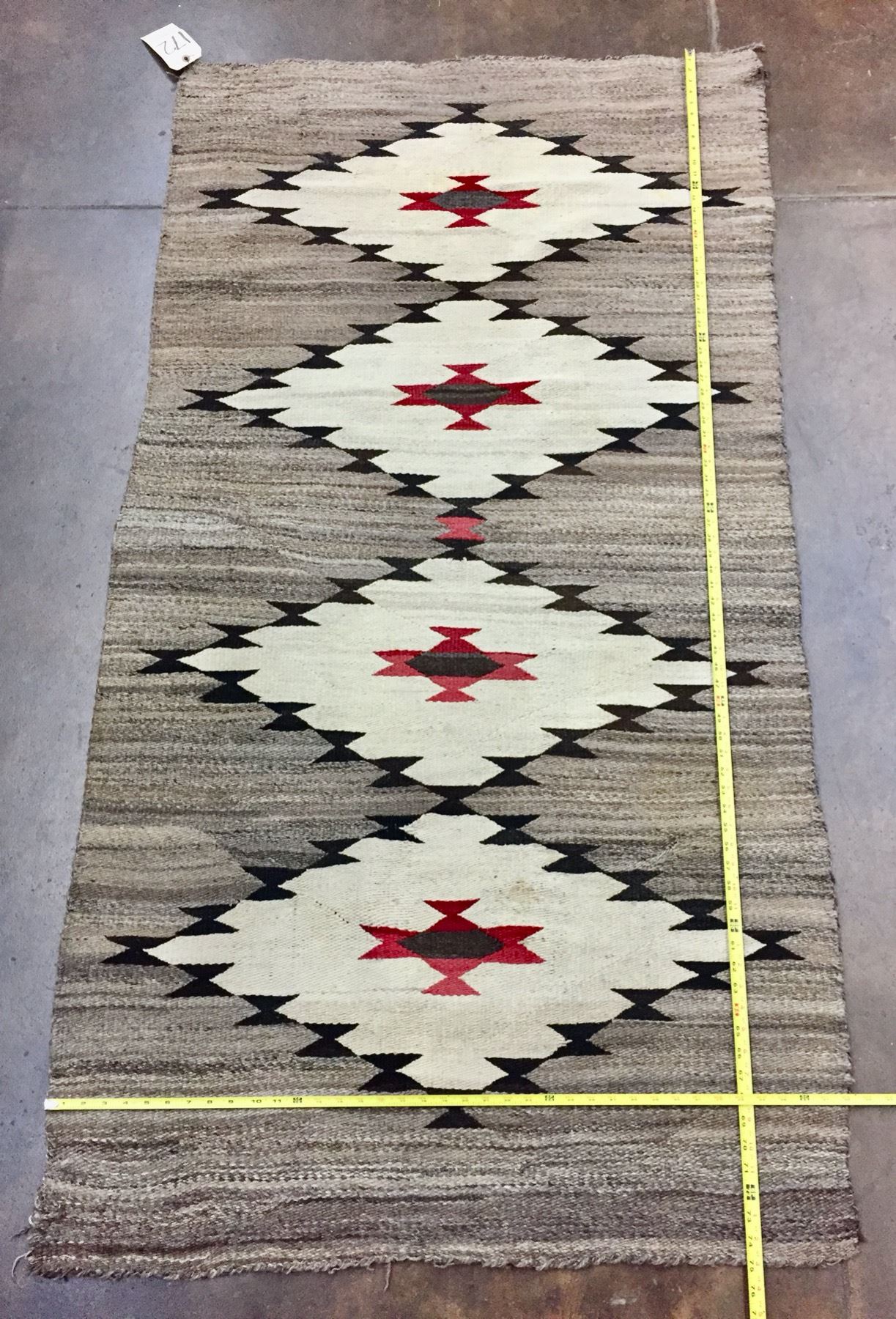 Description: Offered for sale in this lot is an older Navajo textile featuring hand spun wool in browns, whites, reds, and blacks which were hand dyed. Maker: Unknown Navajo weaver. Approx. Age: 1920s. Size:38 inches wide x 75 inches long. Condition: Fair for its age, wear expected and please note that this textile does have some damage. Please look closely at the pictures - they are an important part of our description. Shipping: There will be a $10 handling, packaging fee for shipping this lot. The actual cost of postage will be added on top of that.
