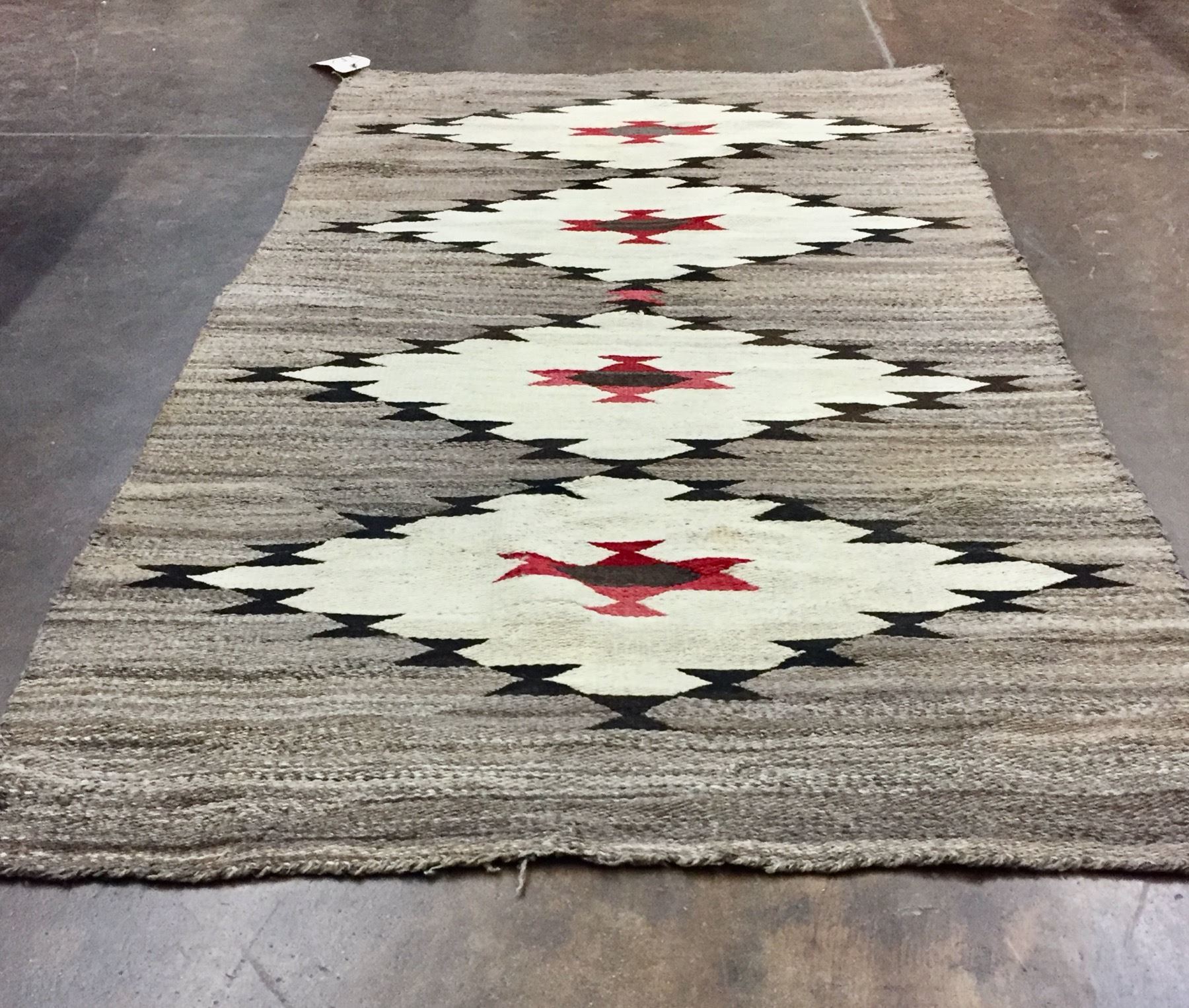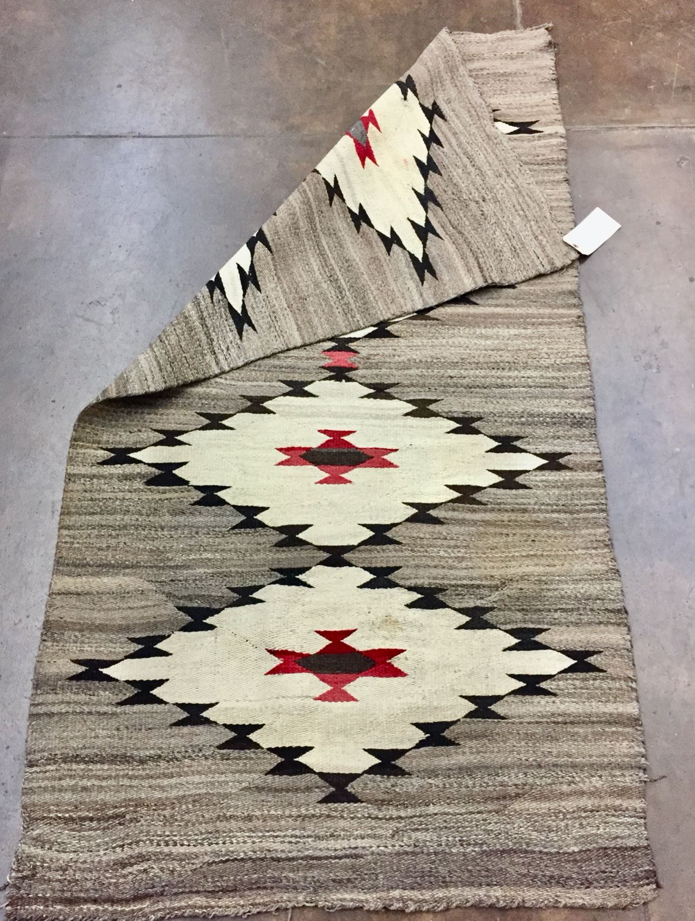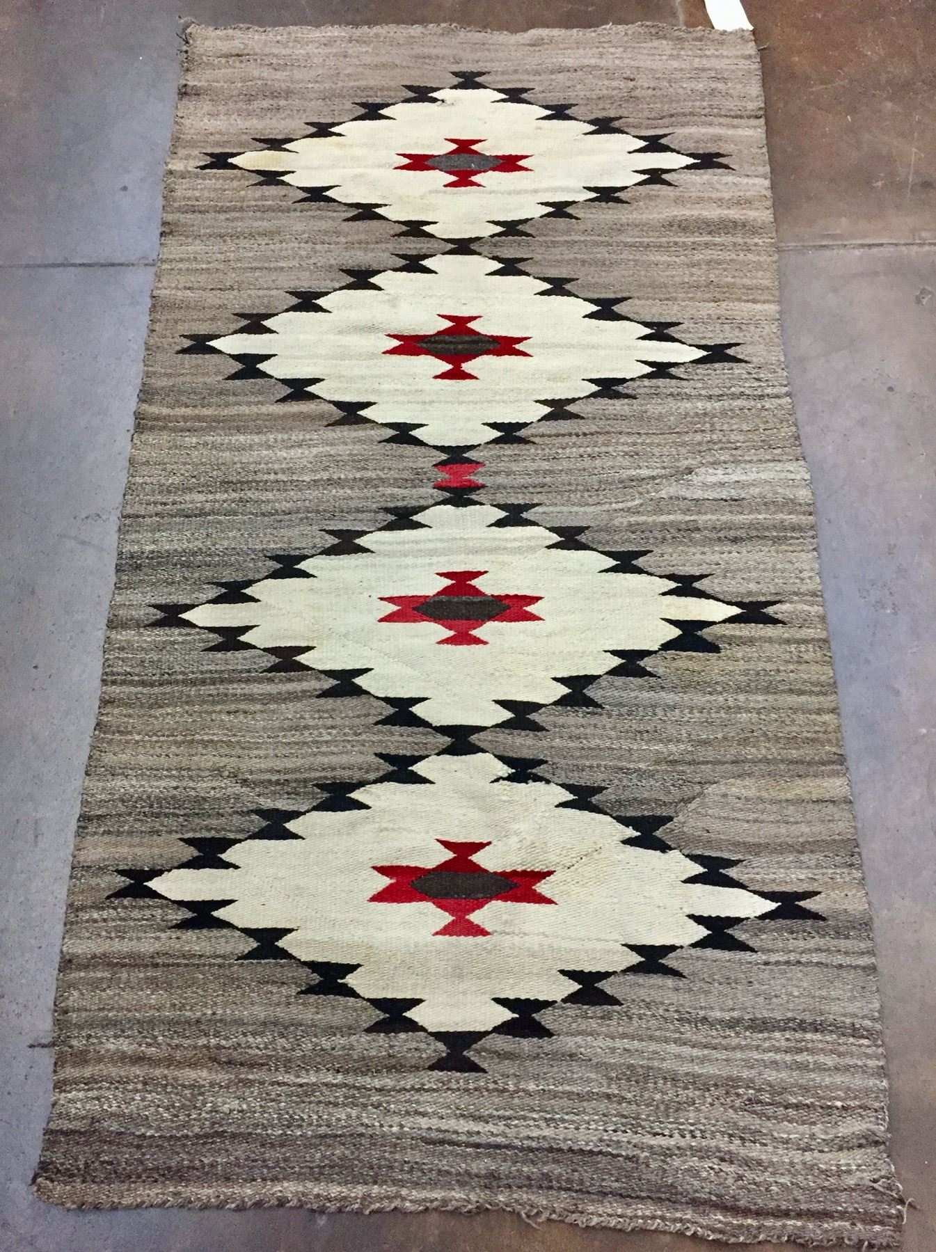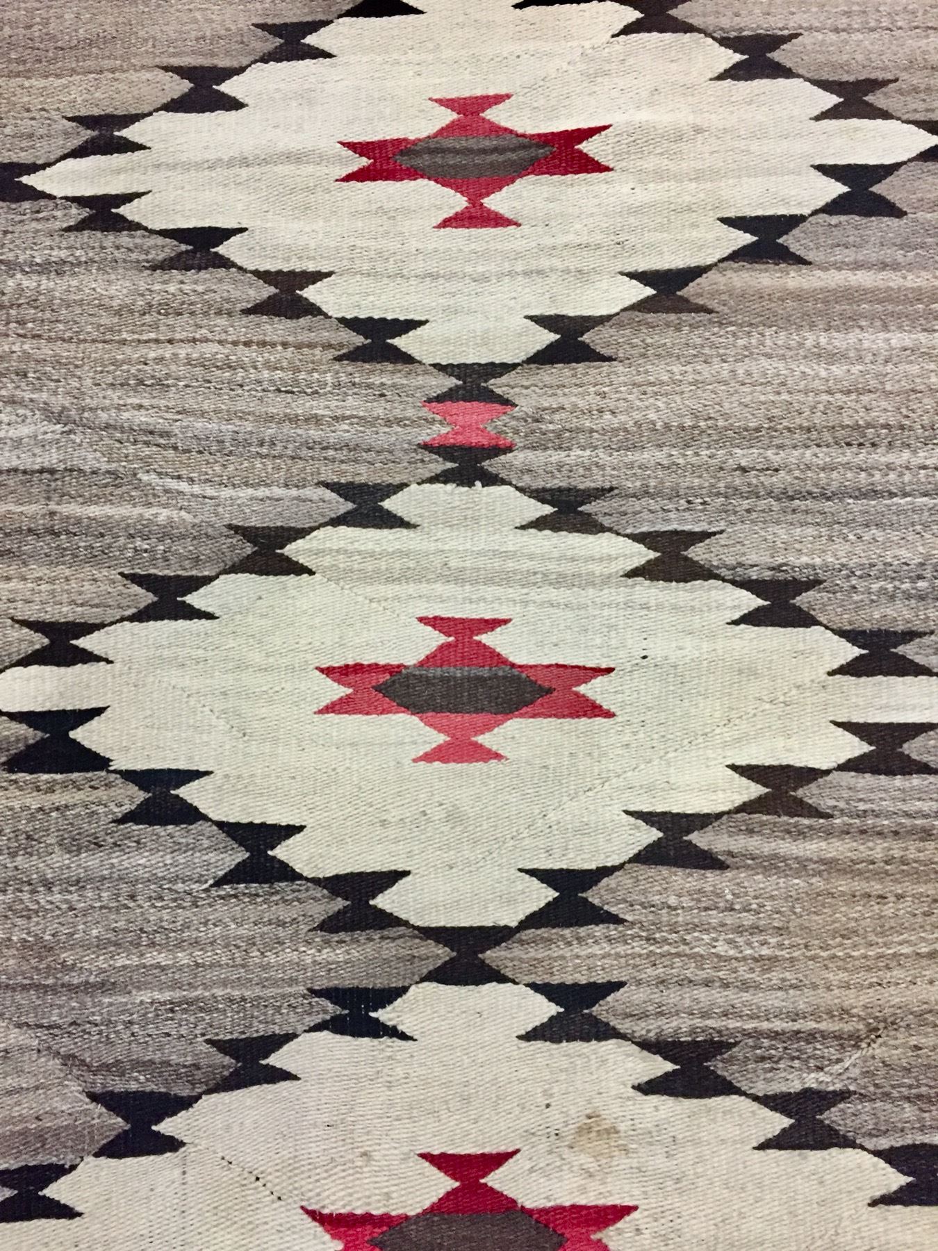 Description: Offered for sale in this lot is an older Navajo textile featuring hand spun wool in browns, whites, reds, and blacks which were hand dyed. Maker: Unknown Navajo weaver. Approx. Age: 1920s. Size:38 inches wide x 75 inches long. Condition: Fair for its age, wear expected and please note that this textile does have some damage. Please look closely at the pictures - they are an important part of our description. Shipping: There will be a $10 handling, packaging fee for shipping this lot. The actual cost of postage will be added on top of that.