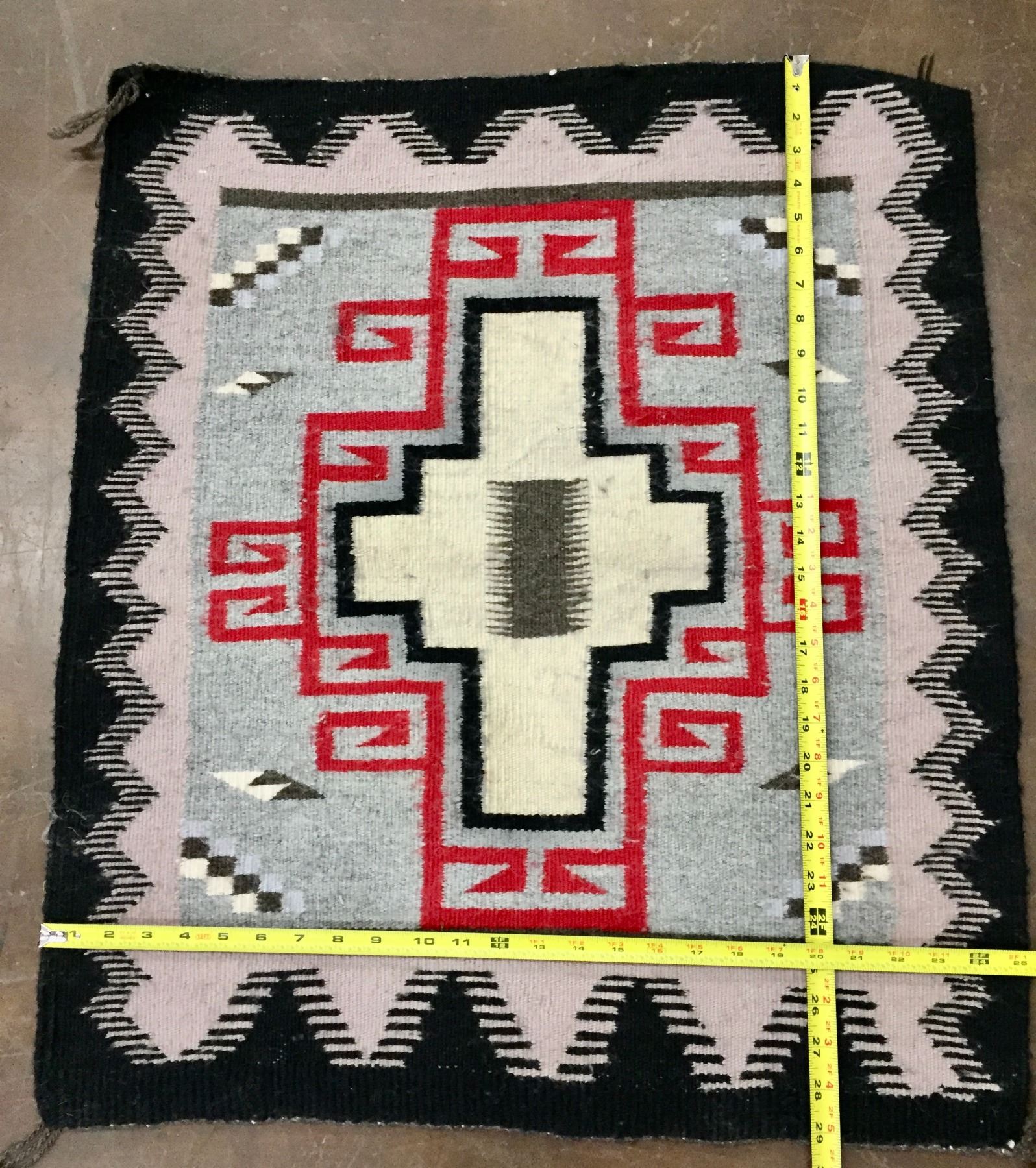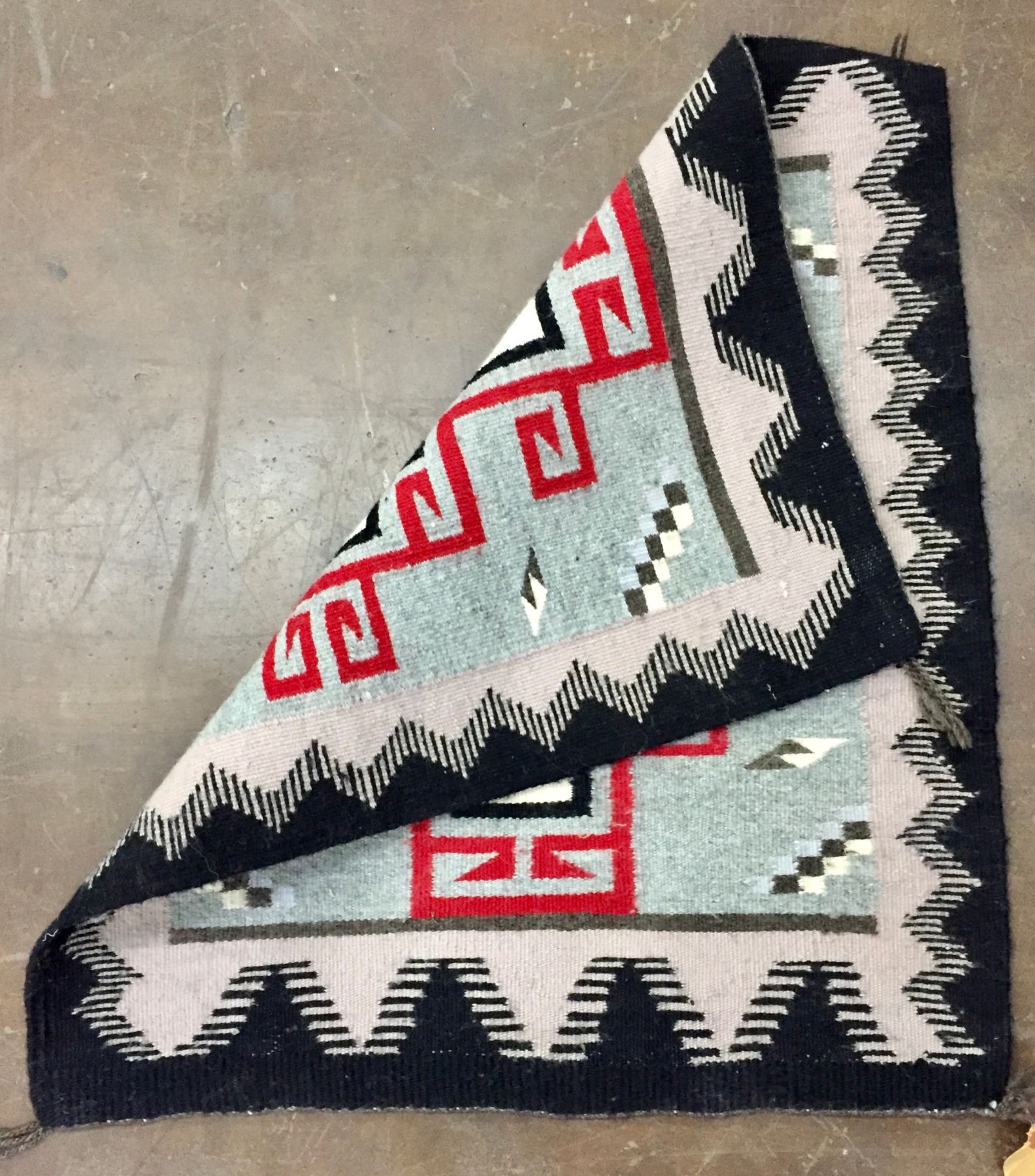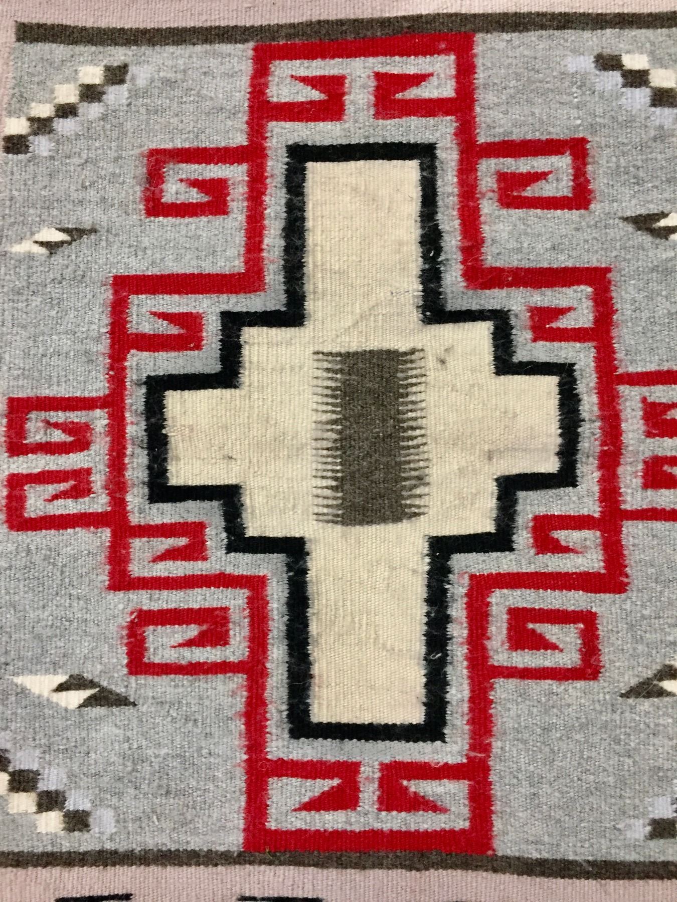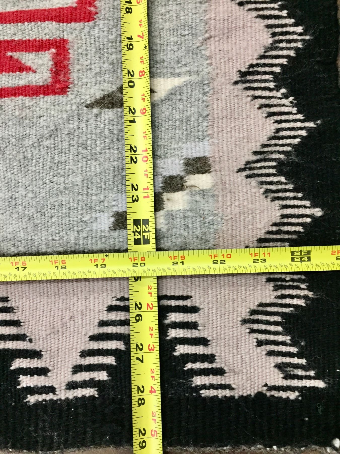 Description: Offered for you in this lot is a nice, vintage Navajo textile created by Louise Billie, featuring reds, grays, whites, and blacks.