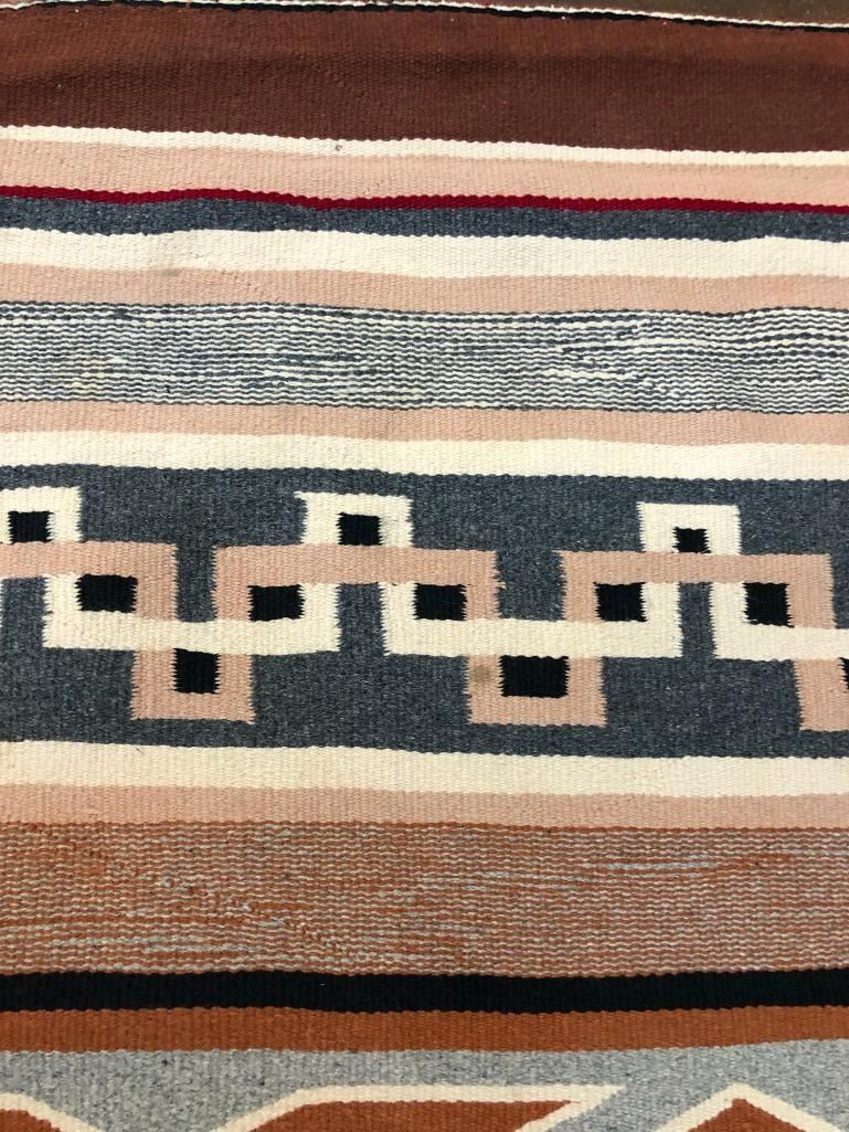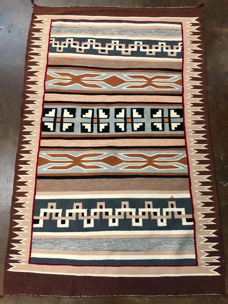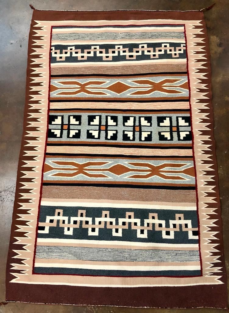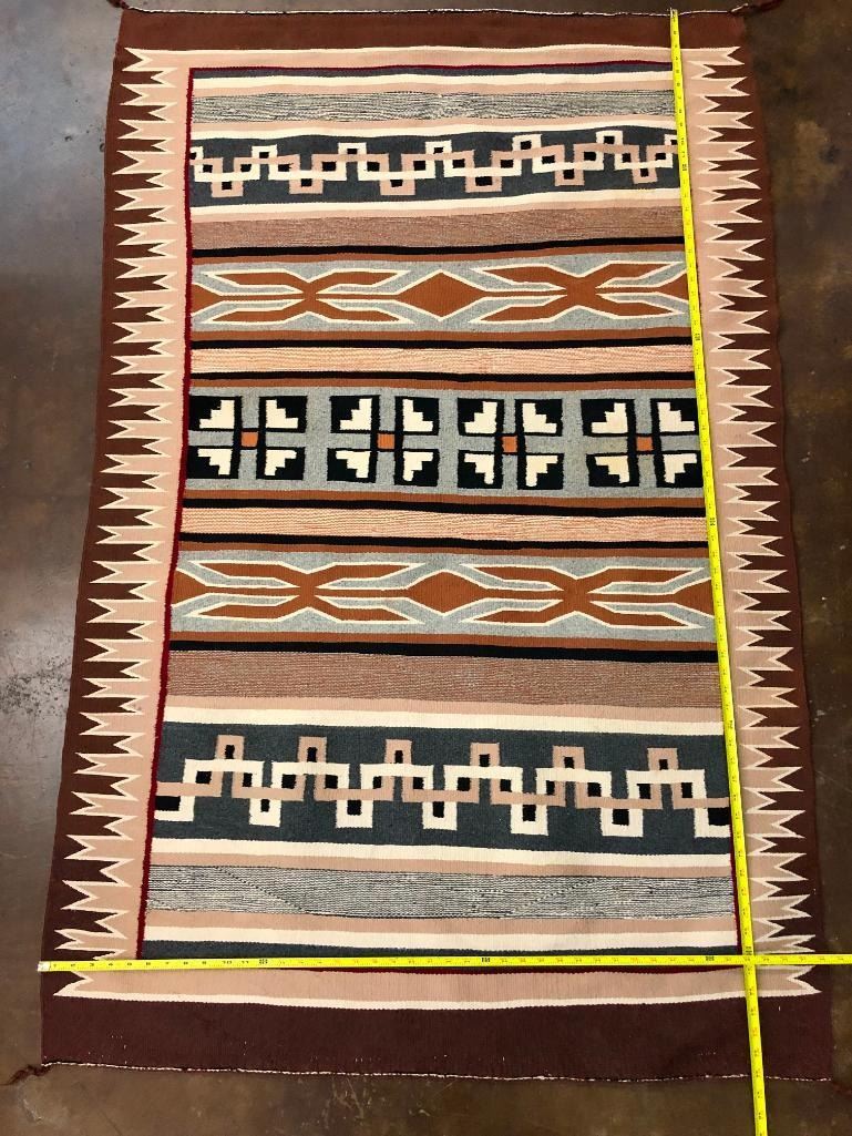Offered for sale in this lot is a vintage Navajo textile with busy and unique patterns. It was woven in browns, grays, whites, reds, and blacks by an expert weaver and is a good size for display. MAKER: Unknown Navajo weaver. APPROX AGE: Circa 1970s. SIZE: 42-1/2 inches wide x 66 inches long. CONDITION: Good for its age, normal wear expected. Please look closely at the pictures as they are an important part of our description and are hereby incorporated into the description, specifically with regards to condition. SHIPPING: There will be a $8 handling / packaging fee for shipping this lot. The actual cost of postage will be added on top of that. BUY IT NOW: If you would like to buy this item now, without waiting for the auction day to bid on it, we do offer this option (which is available up to 48 hours before the actual auction starts). The “Buy it Now†price is the high estimate of this lot (plus applicable fees and the Buyer's premium is discounted to 10% when using the Buy it Now option). If you would like to exercise this option, you must contact us by email (or phone as long as you talk to someone live). Reference this lot number and your intention to "Buy it Now."