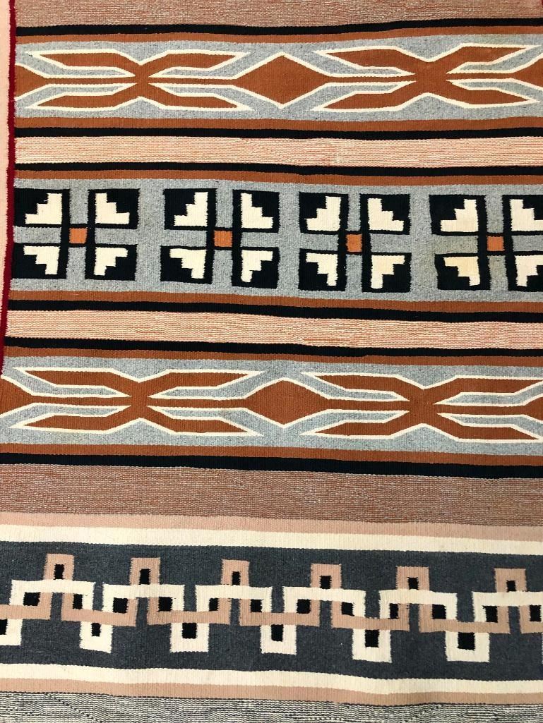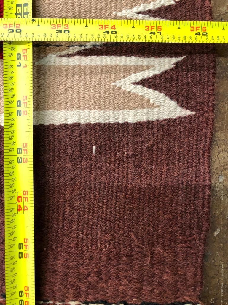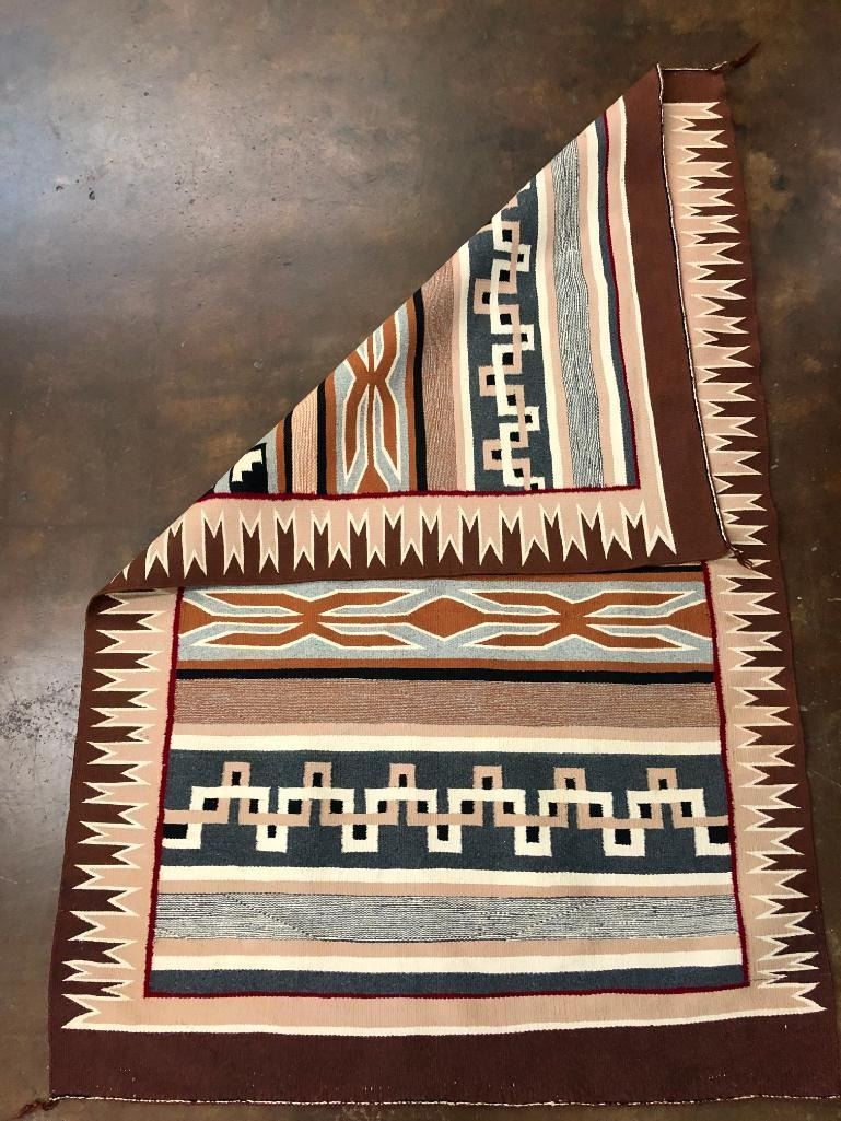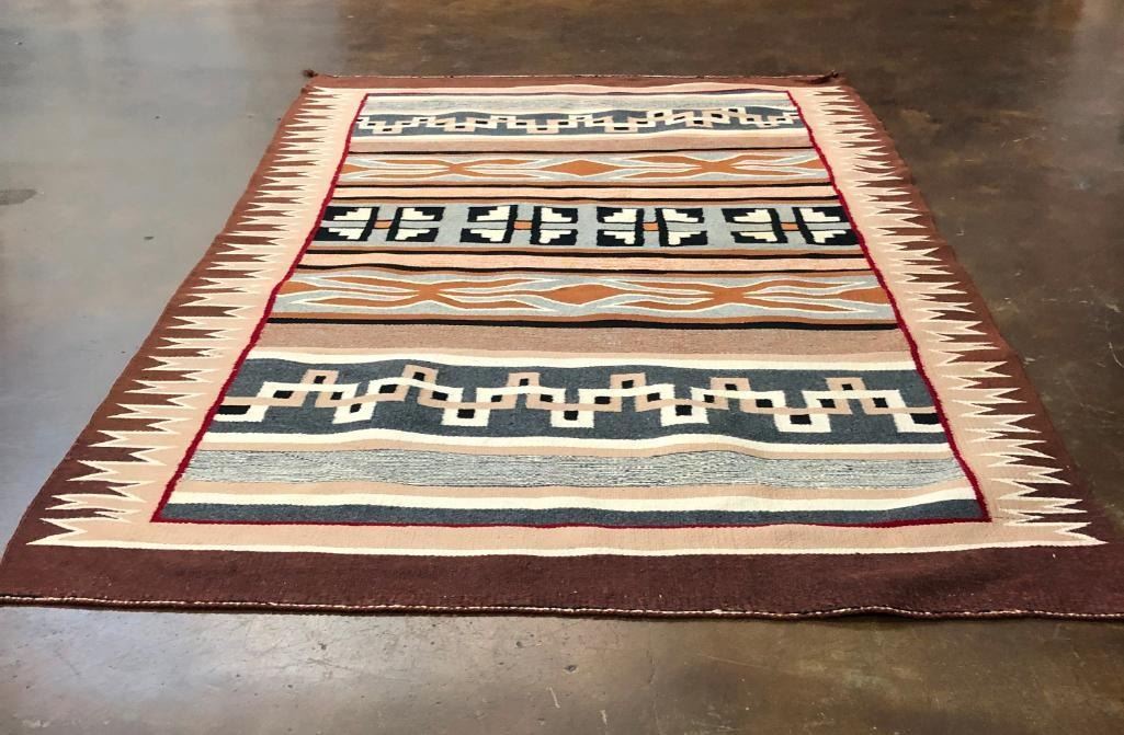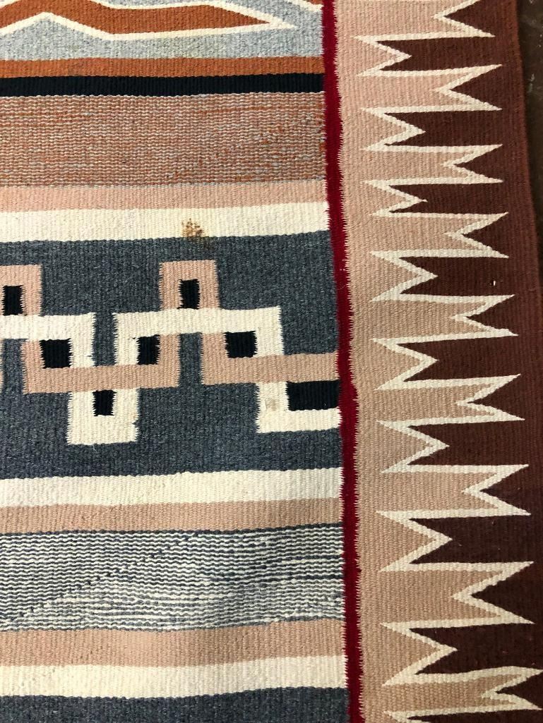 Offered for sale in this lot is a vintage Navajo textile with busy and unique patterns. It was woven in browns, grays, whites, reds, and blacks by an expert weaver and is a good size for display. MAKER: Unknown Navajo weaver. APPROX AGE: Circa 1970s. SIZE: 42-1/2 inches wide x 66 inches long. CONDITION: Good for its age, normal wear expected. Please look closely at the pictures as they are an important part of our description and are hereby incorporated into the description, specifically with regards to condition. SHIPPING: There will be a $8 handling / packaging fee for shipping this lot. The actual cost of postage will be added on top of that. BUY IT NOW: If you would like to buy this item now, without waiting for the auction day to bid on it, we do offer this option (which is available up to 48 hours before the actual auction starts). The “Buy it Now†price is the high estimate of this lot (plus applicable fees and the Buyer's premium is discounted to 10% when using the Buy it Now option). If you would like to exercise this option, you must contact us by email (or phone as long as you talk to someone live). Reference this lot number and your intention to "Buy it Now."