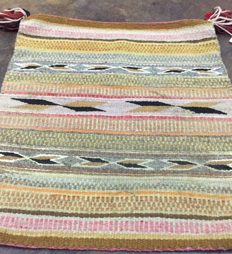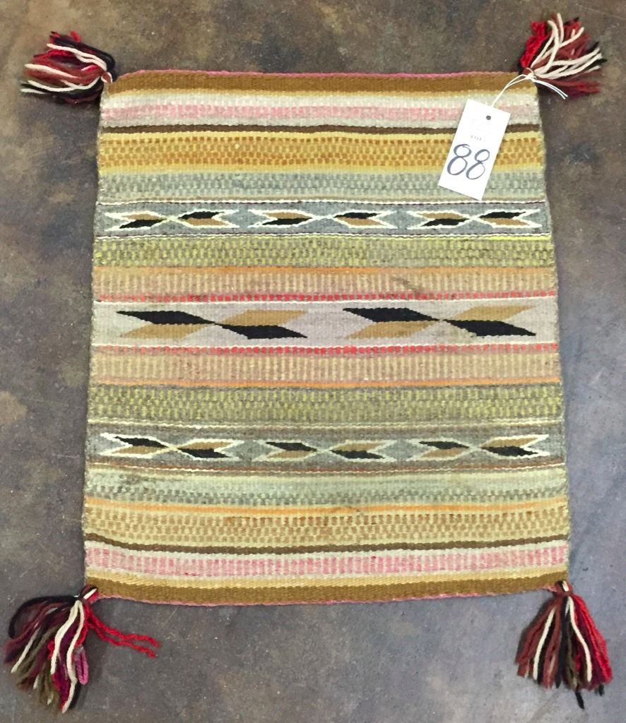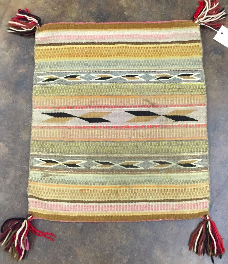 This vintage Navajo textile measures 20" x 23". Good vintage condition. Please look closely at the pics as they are an important part of our description. Shipping: There will be a $5 handling / packaging fee for shipping this lot. The actual cost of postage will be added on top of that.
