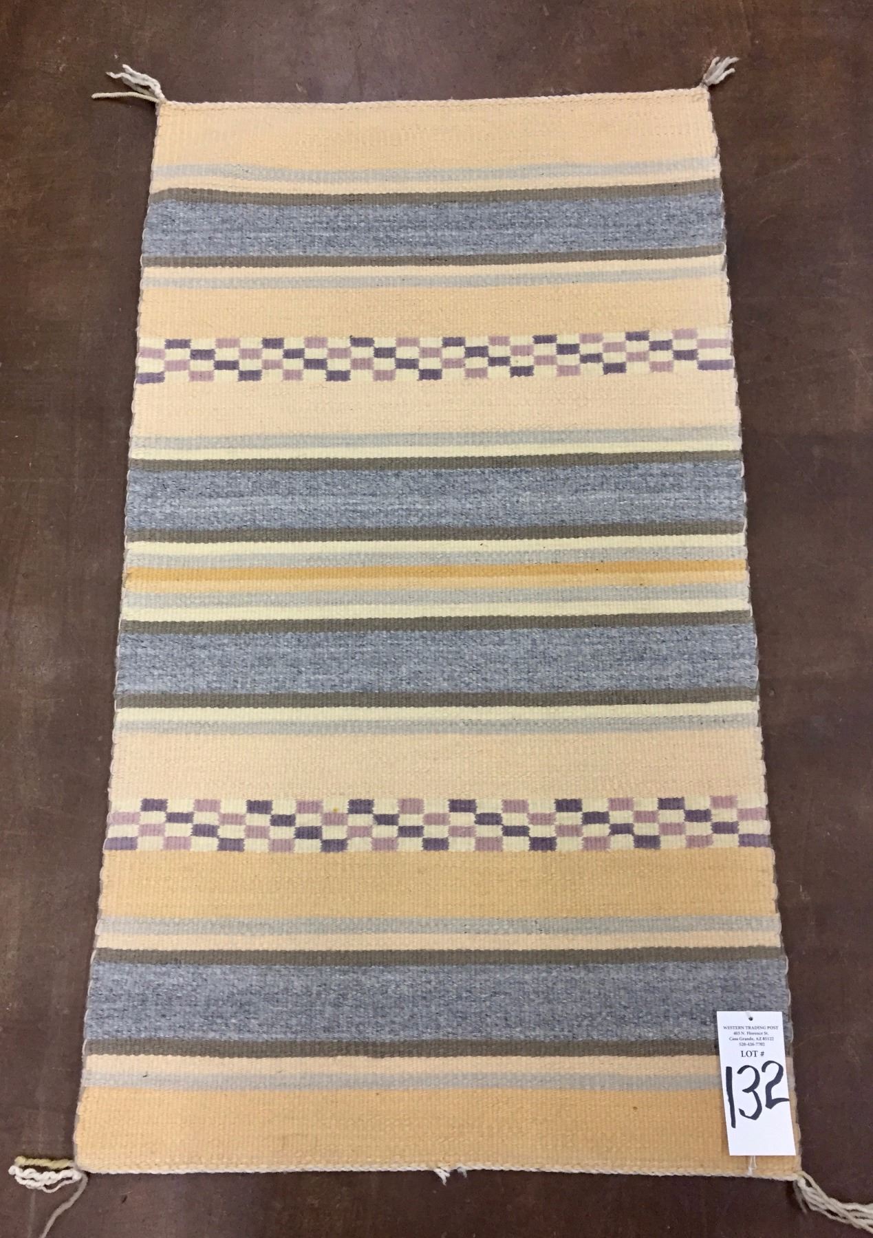Maker: Unknown Navajo weaver. Approx. Age: Circa 1970s. Size: Measures 23” x 39”. Additional Info: Banded and geometric patterns. Condition: Good for it’s age, normal wear expected. Please look closely at the pictures - they are an important part of our description. Shipping: There will be a $7 handling / packaging fee for shipping this lot. The actual cost of postage will be added on top of that.