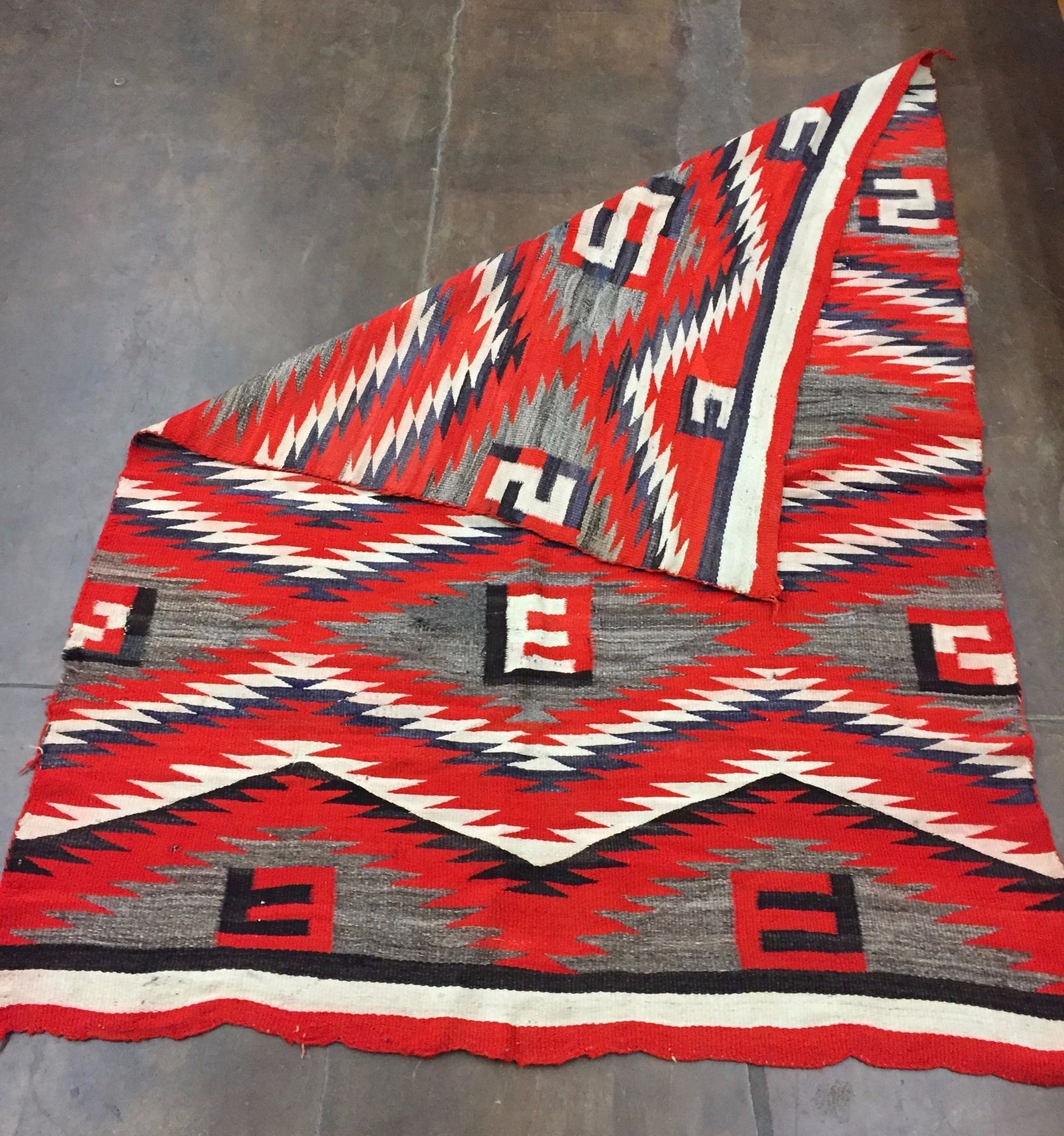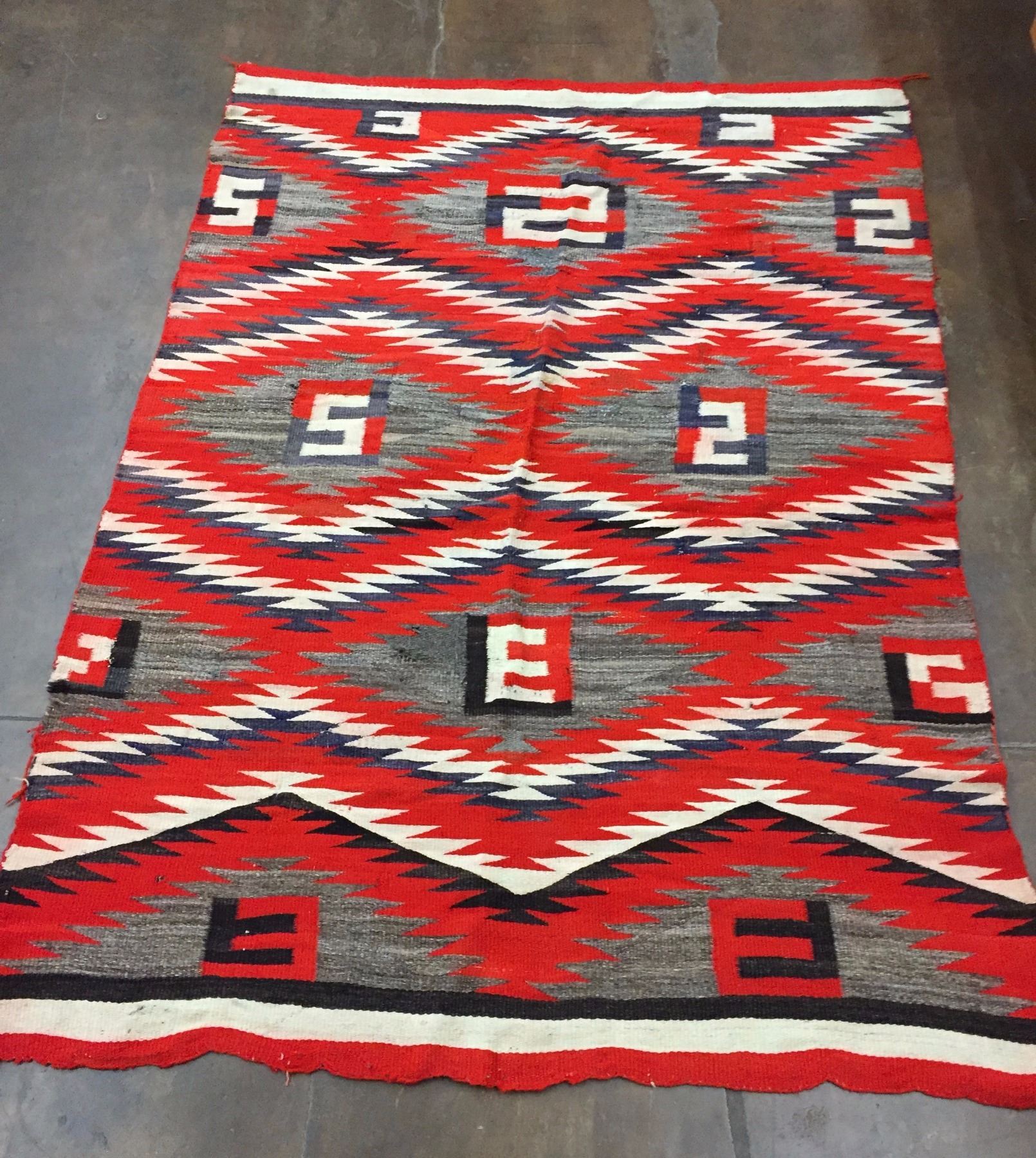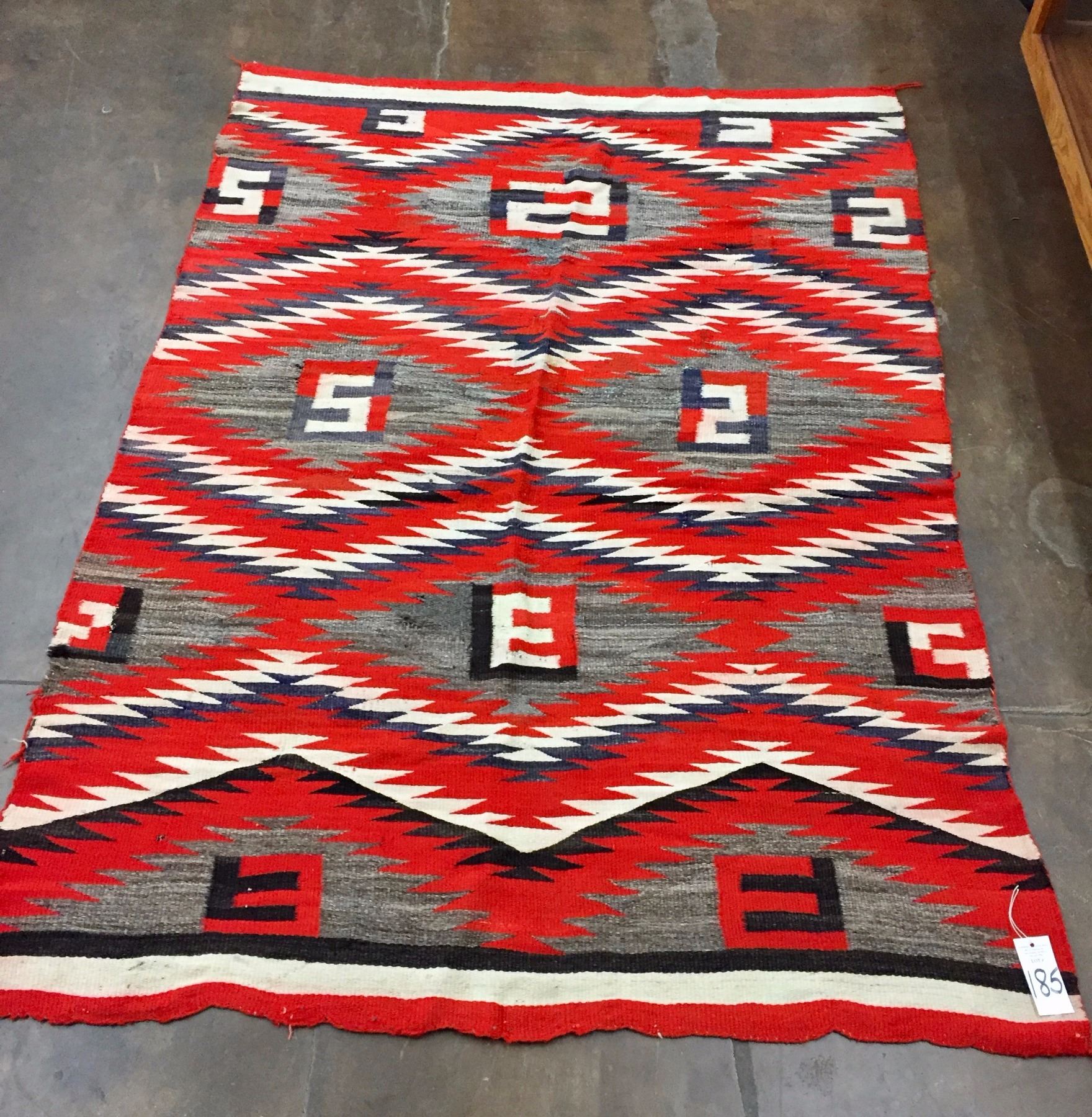 Description: Vintage Navajo textile. Maker: Unknown Navajo weaver. Approx. Age: Circa 1930s. Size: Approx. 32” x 62 1/2”. Condition: Fair for its age, wear expected. Please look closely at the pictures - they are an important part of our description. Shipping: There will be a $7 handling / packaging fee for shipping this lot. The actual cost of postage will be added on top of that.