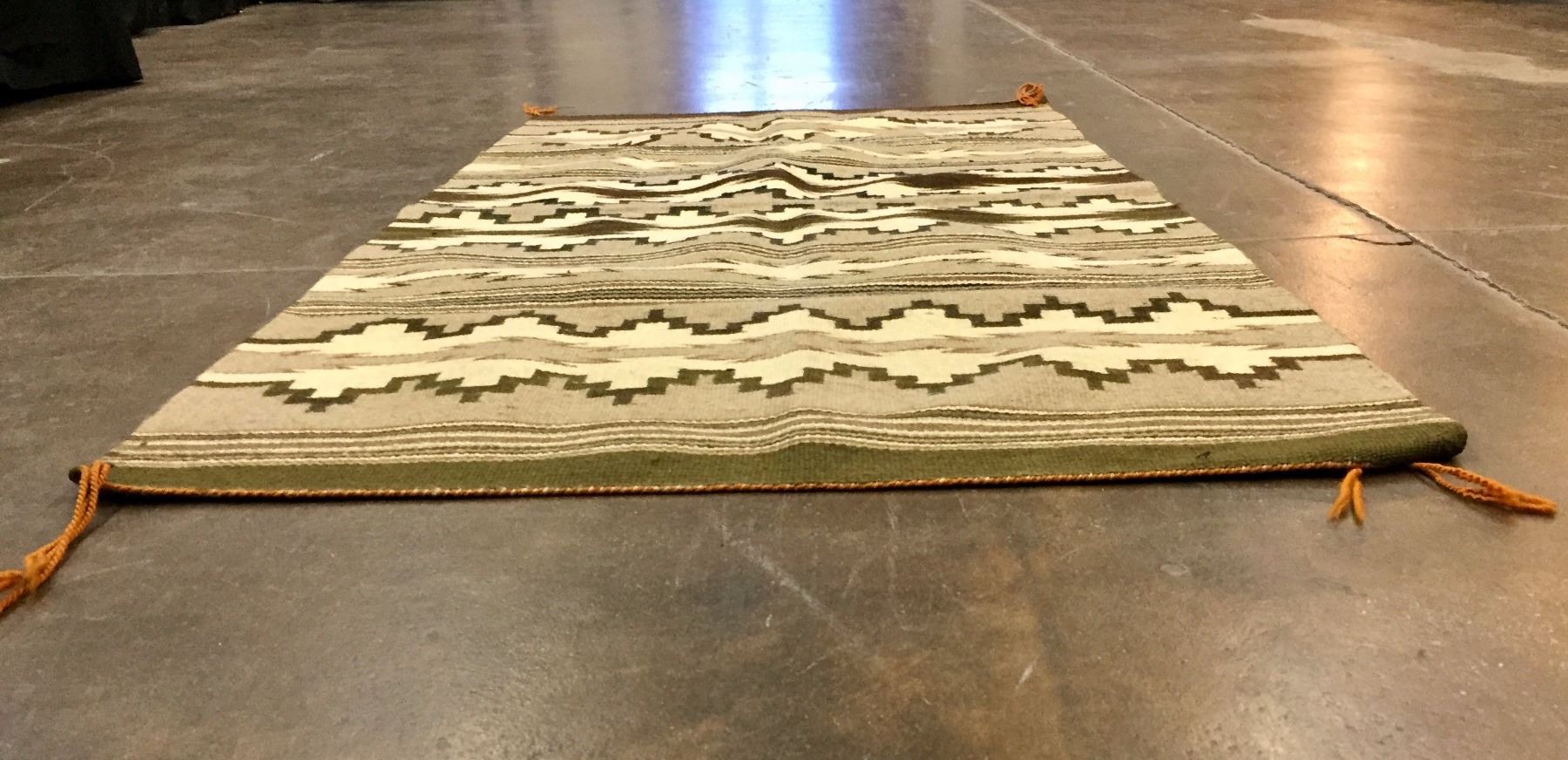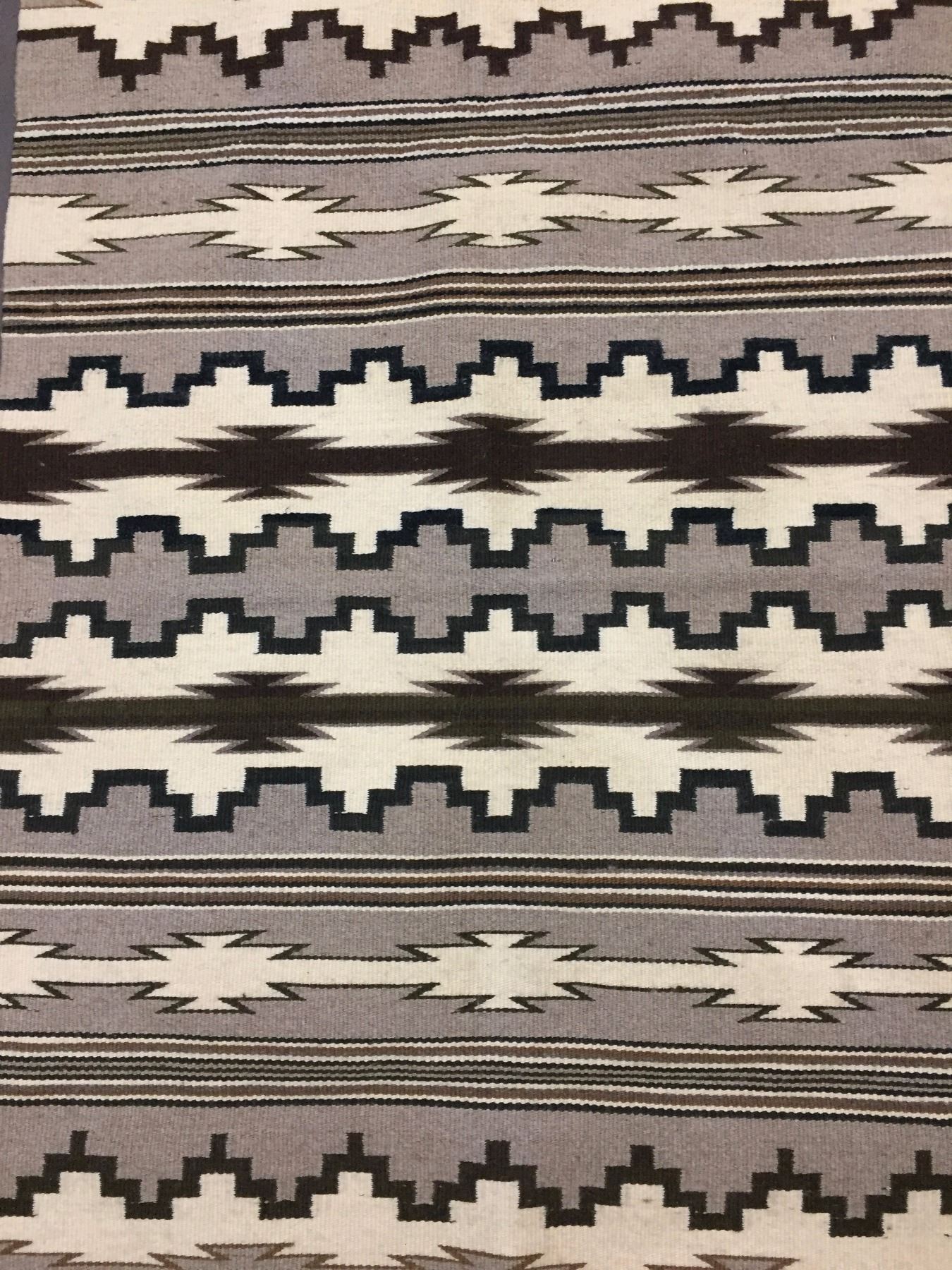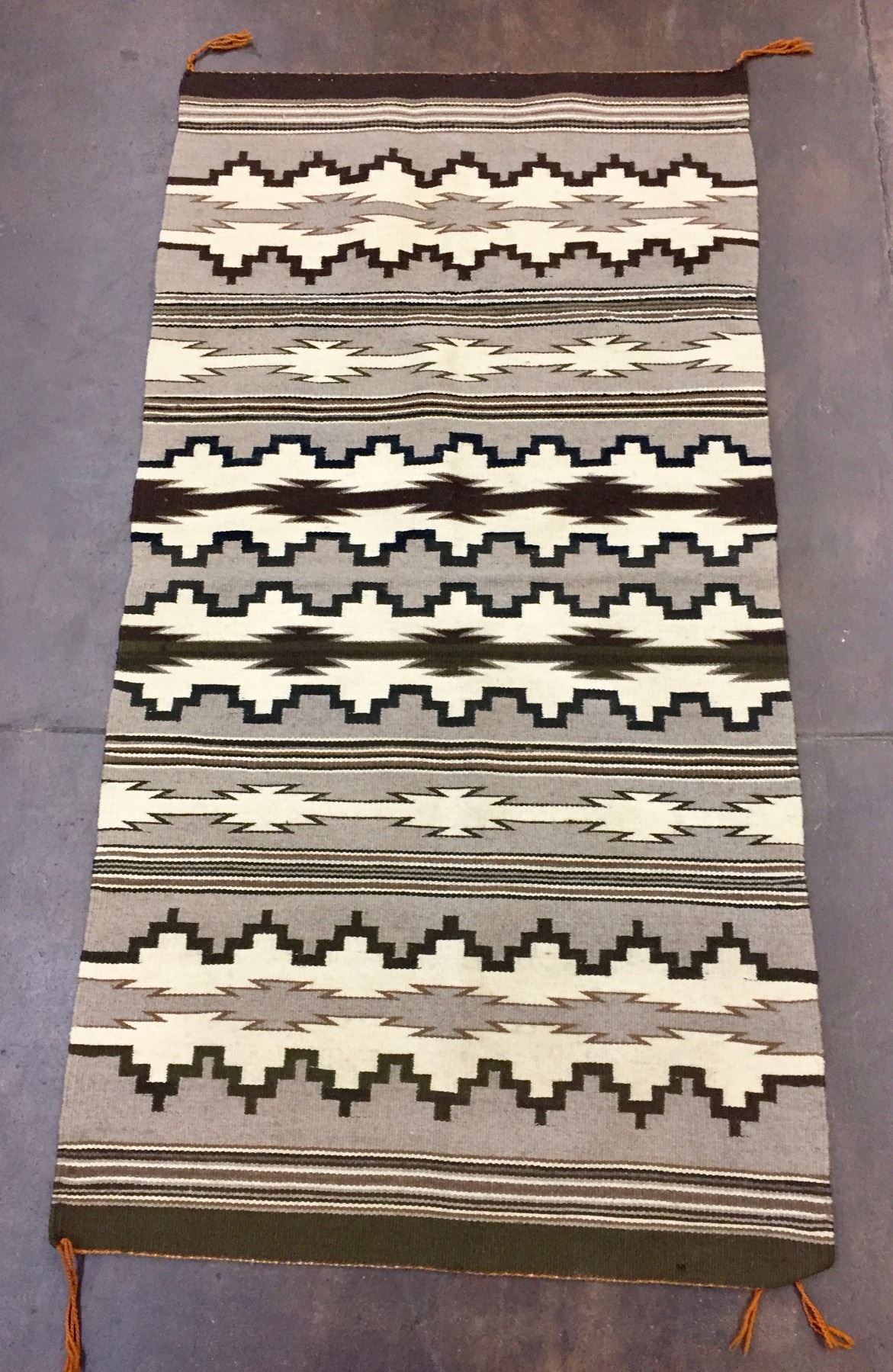 Description: A vintage Navajo textile with geometric and diamond patterns. Maker: Unknown Navajo weaver. Approx. Age: Circa 1970s. Size: 28”w x 53-1/2” long. Condition: Good for its age, normal wear expected. Please look closely at the pictures - they are an important part of our description. Shipping: There will be a $5 handling / packaging fee for shipping this lot. The actual cost of postage will be added on top of that.
