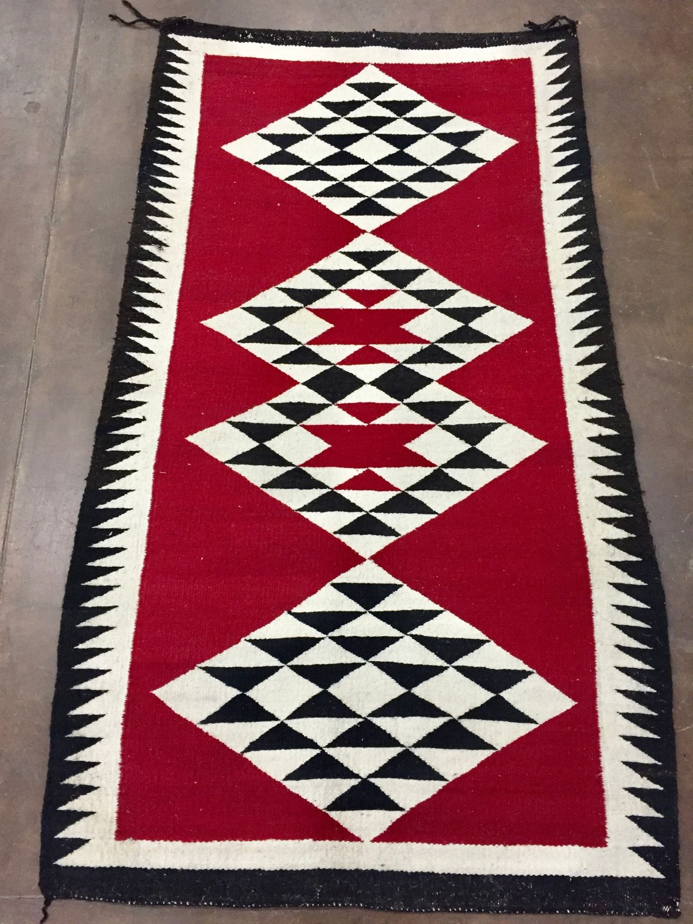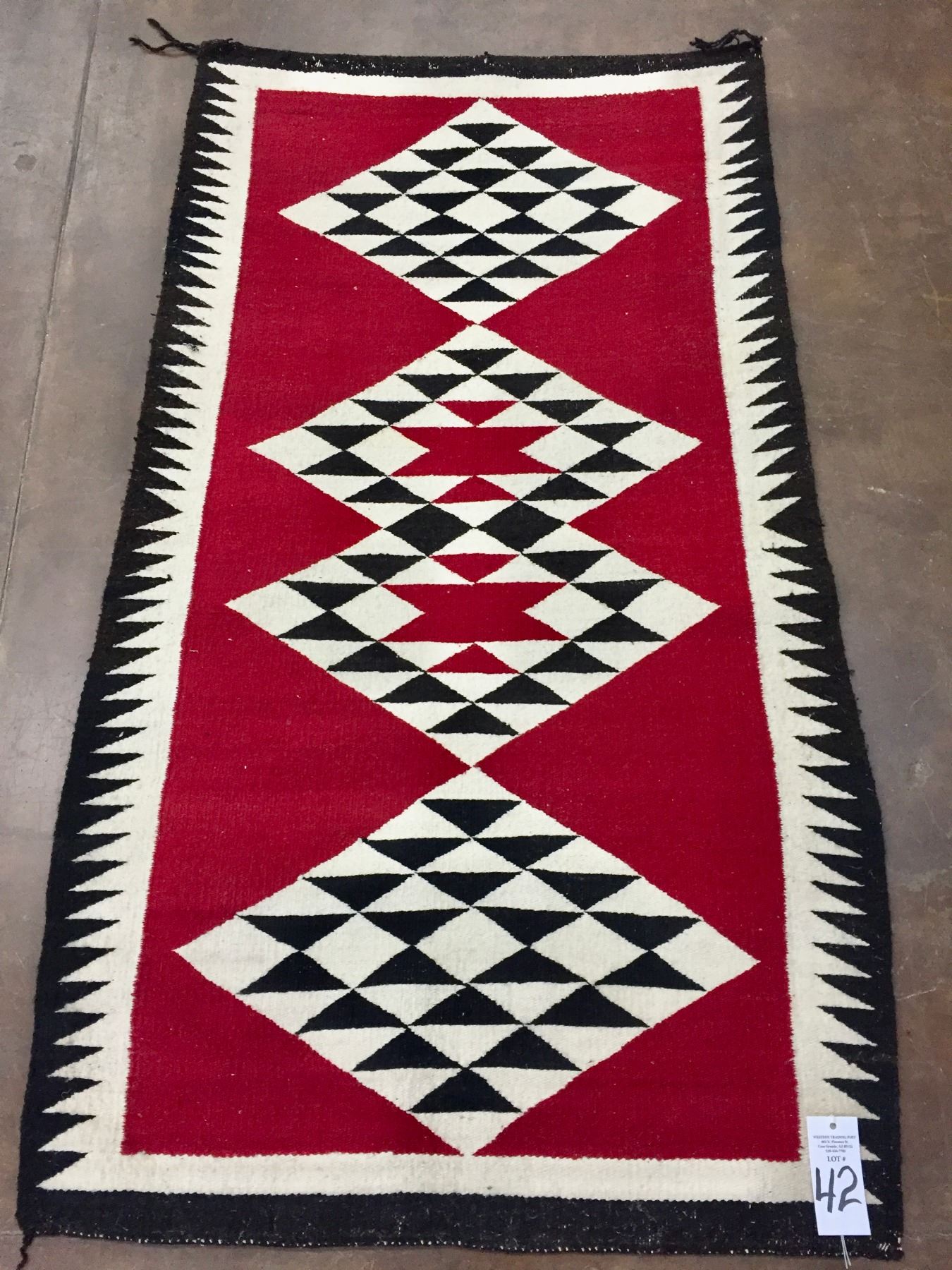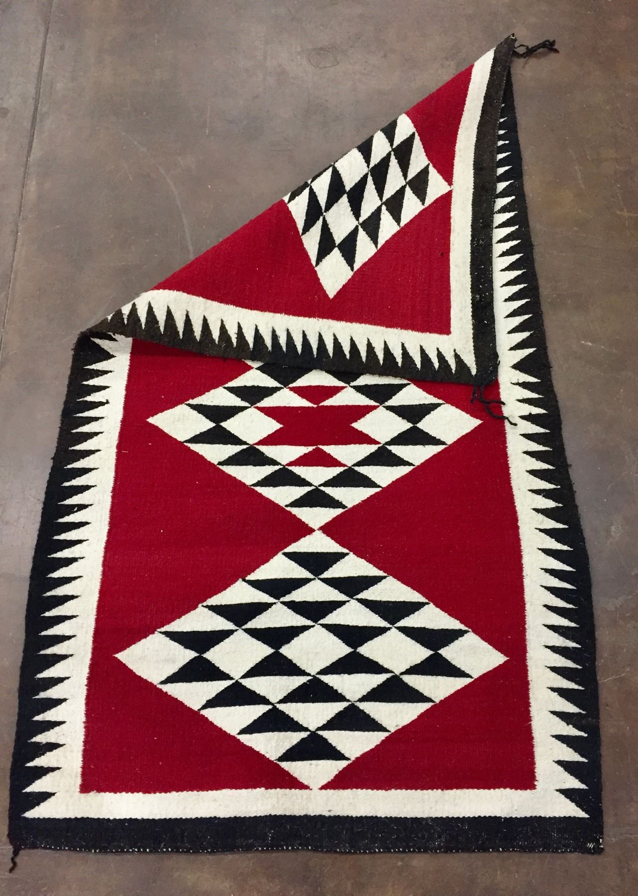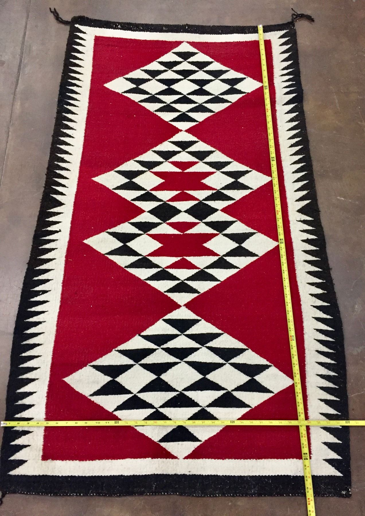 Description: Available for sale in this lot is a vintage Navajo Textile featuring reds, whites, and blacks with geometric designs.                                                                                                            Maker: Unknown Navajo Weaver.                                                                                                                  Approx. Age: Circa mid-century vintage.                                                                                                            Size: 36”w x 63-1/2” long.                                                                                                                                                                                                                                 Condition: Fair for its age, normal wear expected. Is worn in some areas.                                                                                                                Please look closely at the pictures - they are an important part of our description.                                Shipping: There will be a $7 handling / packaging fee for shipping this lot. The actual cost of postage will be added on top of that.