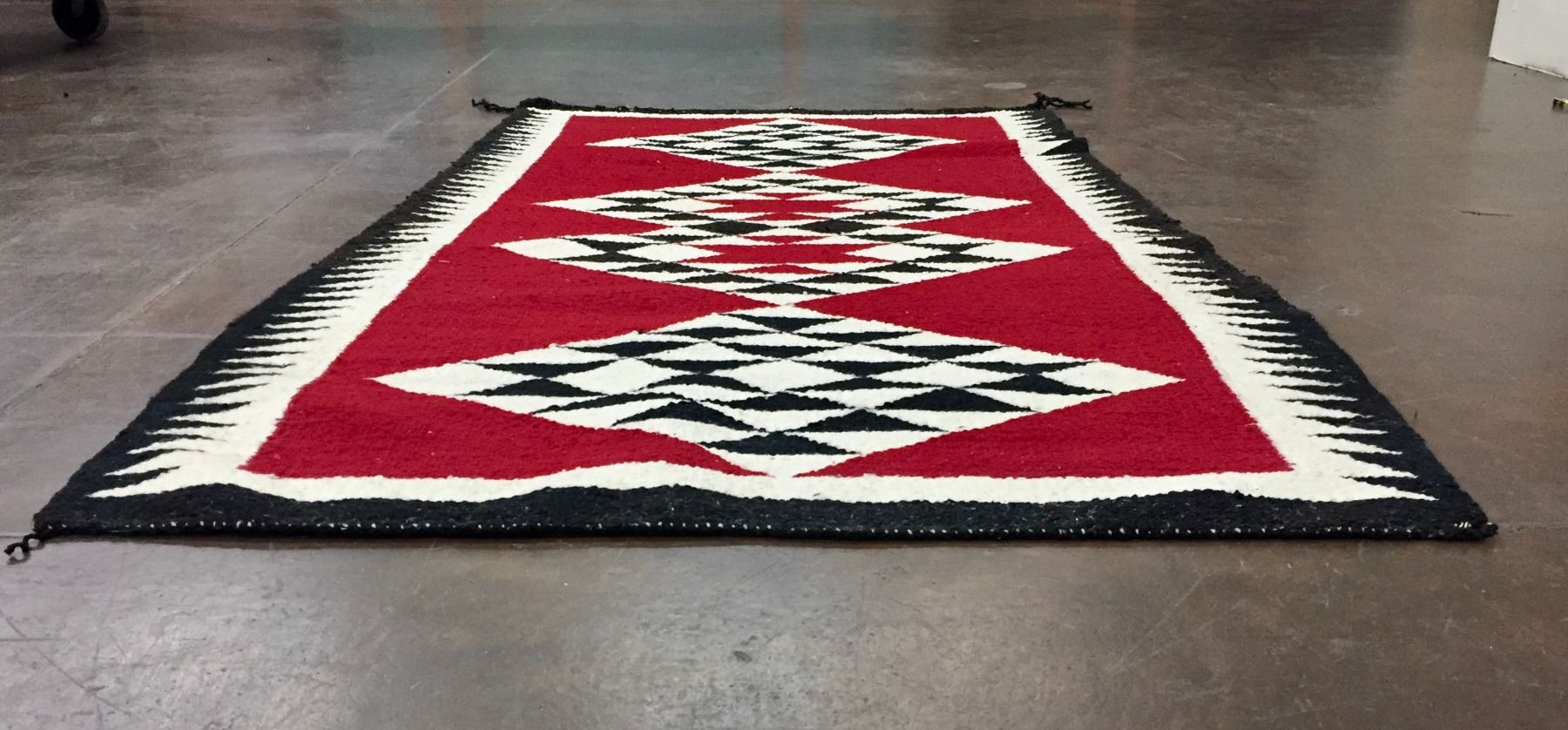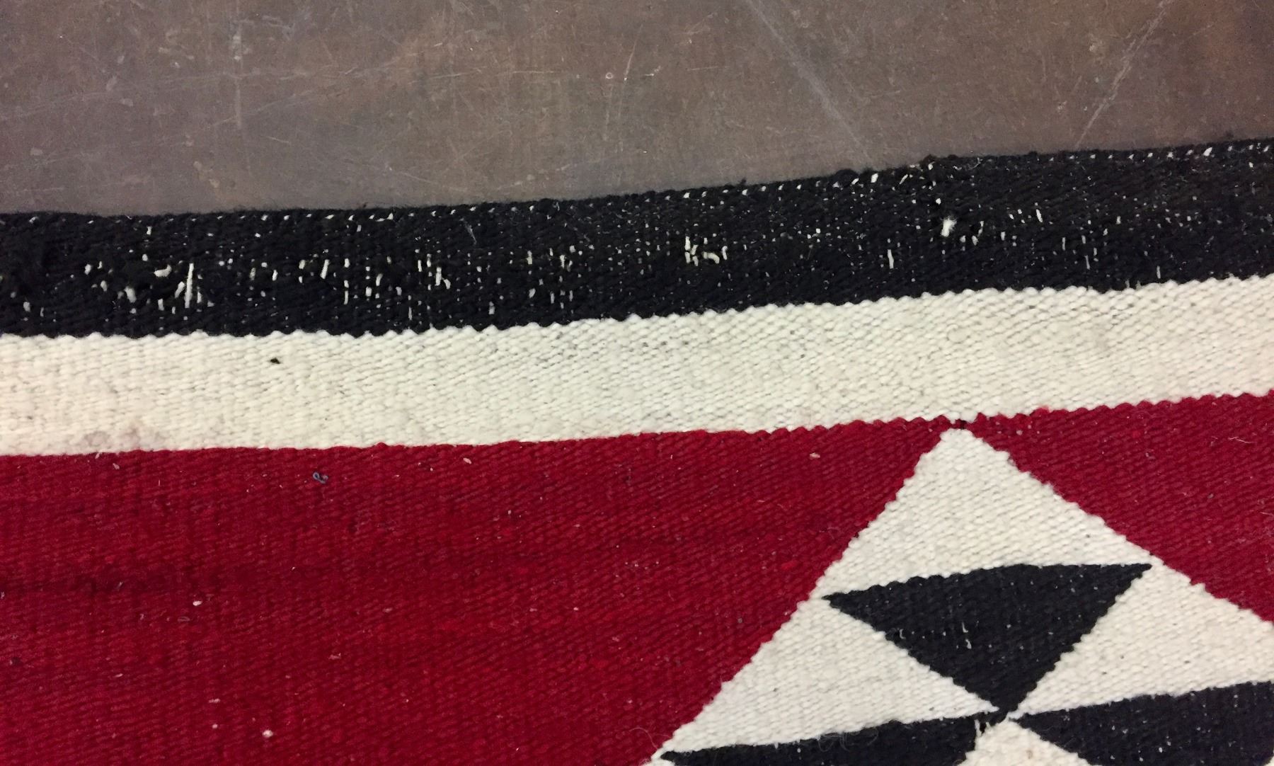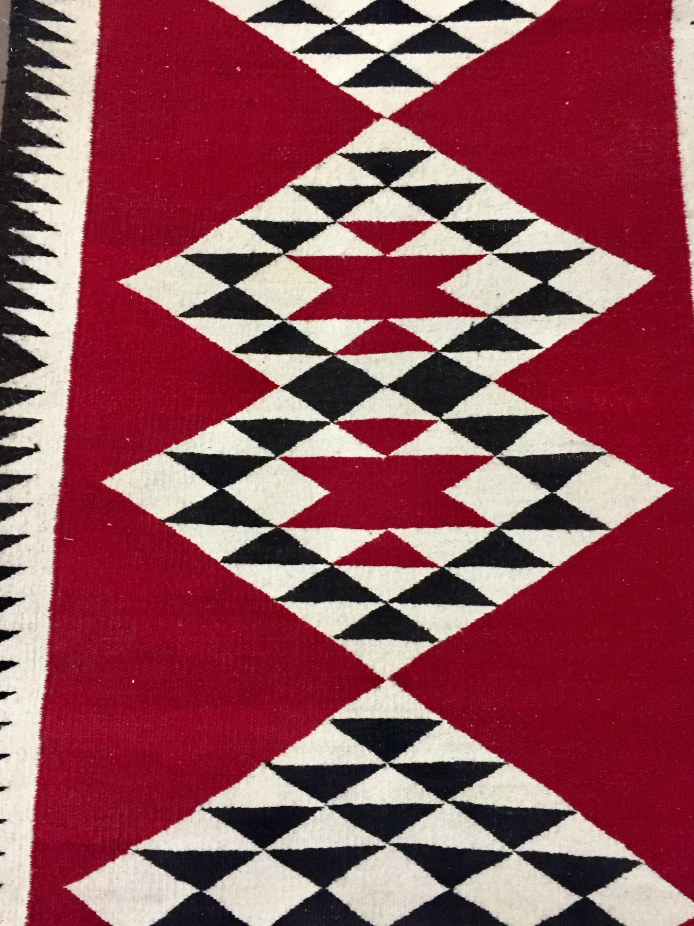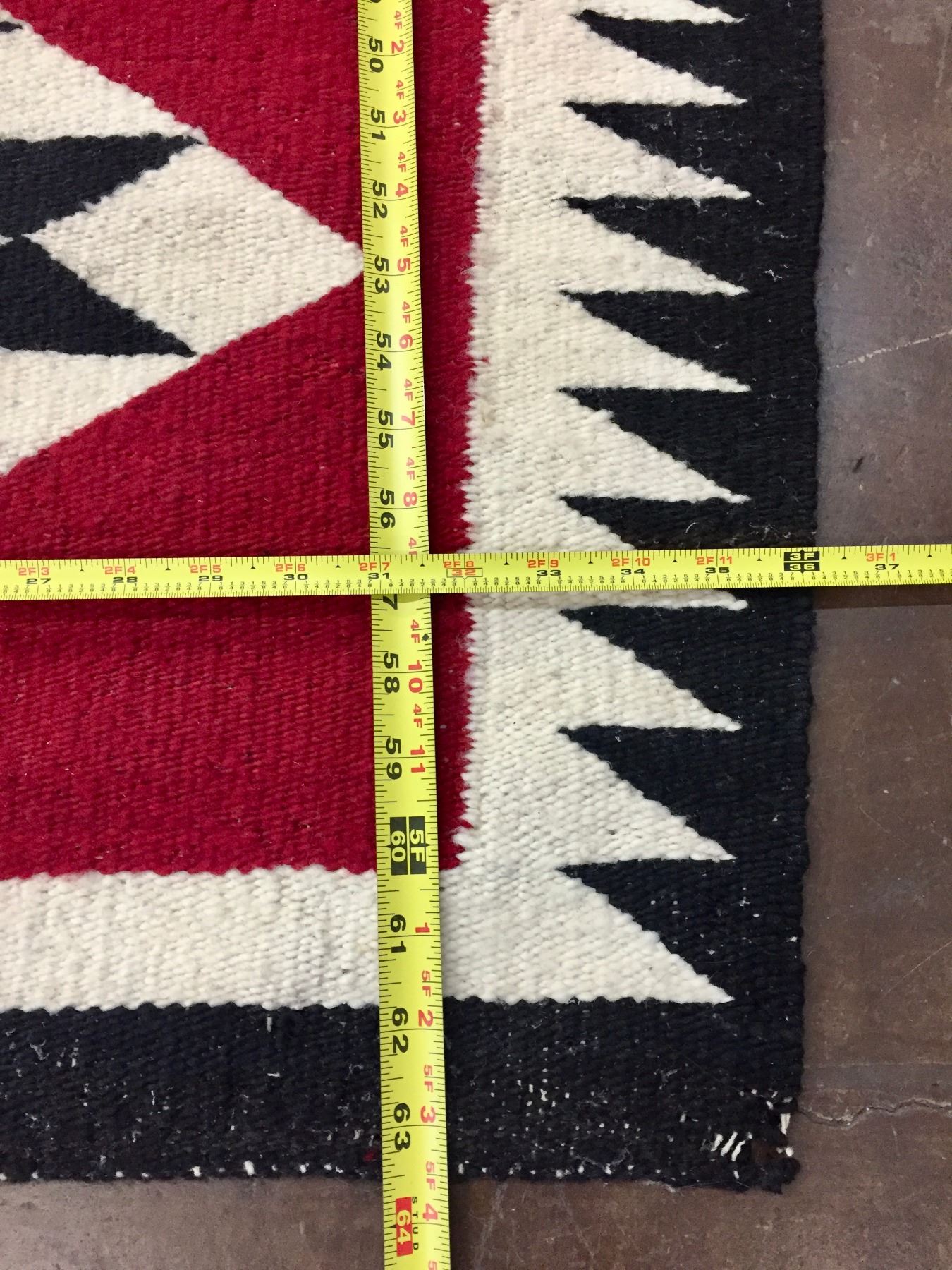 Description: Available for sale in this lot is a vintage Navajo Textile featuring reds, whites, and blacks with geometric designs.                                                                                                            Maker: Unknown Navajo Weaver.                                                                                                                  Approx. Age: Circa mid-century vintage.                                                                                                            Size: 36”w x 63-1/2” long.                                                                                                                                                                                                                                 Condition: Fair for its age, normal wear expected. Is worn in some areas.                                                                                                                Please look closely at the pictures - they are an important part of our description.                                Shipping: There will be a $7 handling / packaging fee for shipping this lot. The actual cost of postage will be added on top of that.
