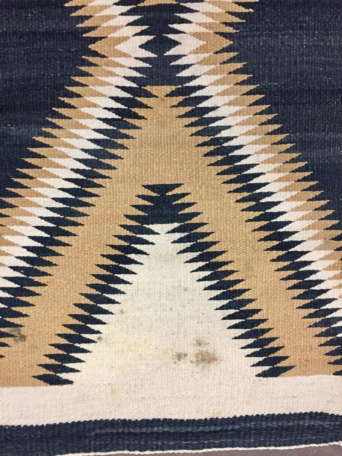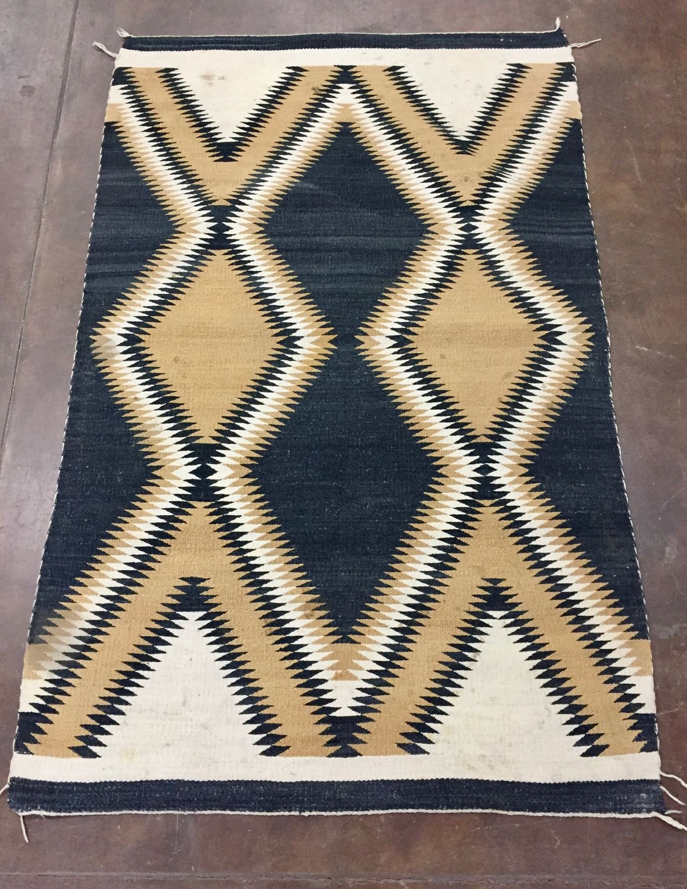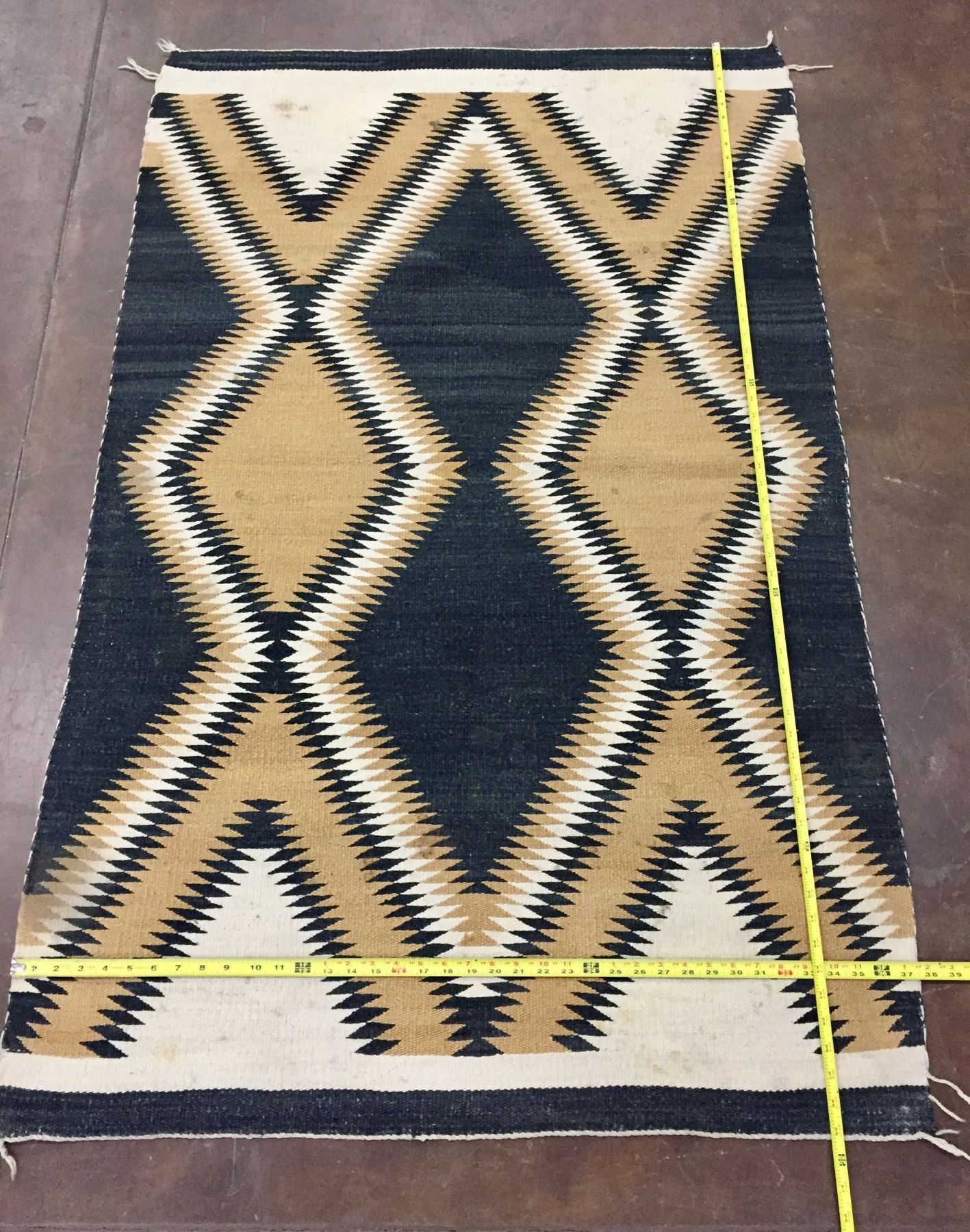 Description: Presented for sale in this lot is a vintage Navajo Textile featuring navy, tans and whites with geometric designs.                                                                                                            Maker: Unknown Navajo Weaver.                                                                                                                   Approx. Age: Circa mid-century vintage.                                                                                                            Size: 37-1/2”w x 59” long.                                                                                                                                                                                                                                   Condition: Pretty good for its age, normal wear expected. There are dirty spots on textile.                                                                                                                              Please look closely at the pictures - they are an important part of our description.                                Shipping: There will be a $7 handling / packaging fee for shipping this lot. The actual cost of postage will be added on top of that.