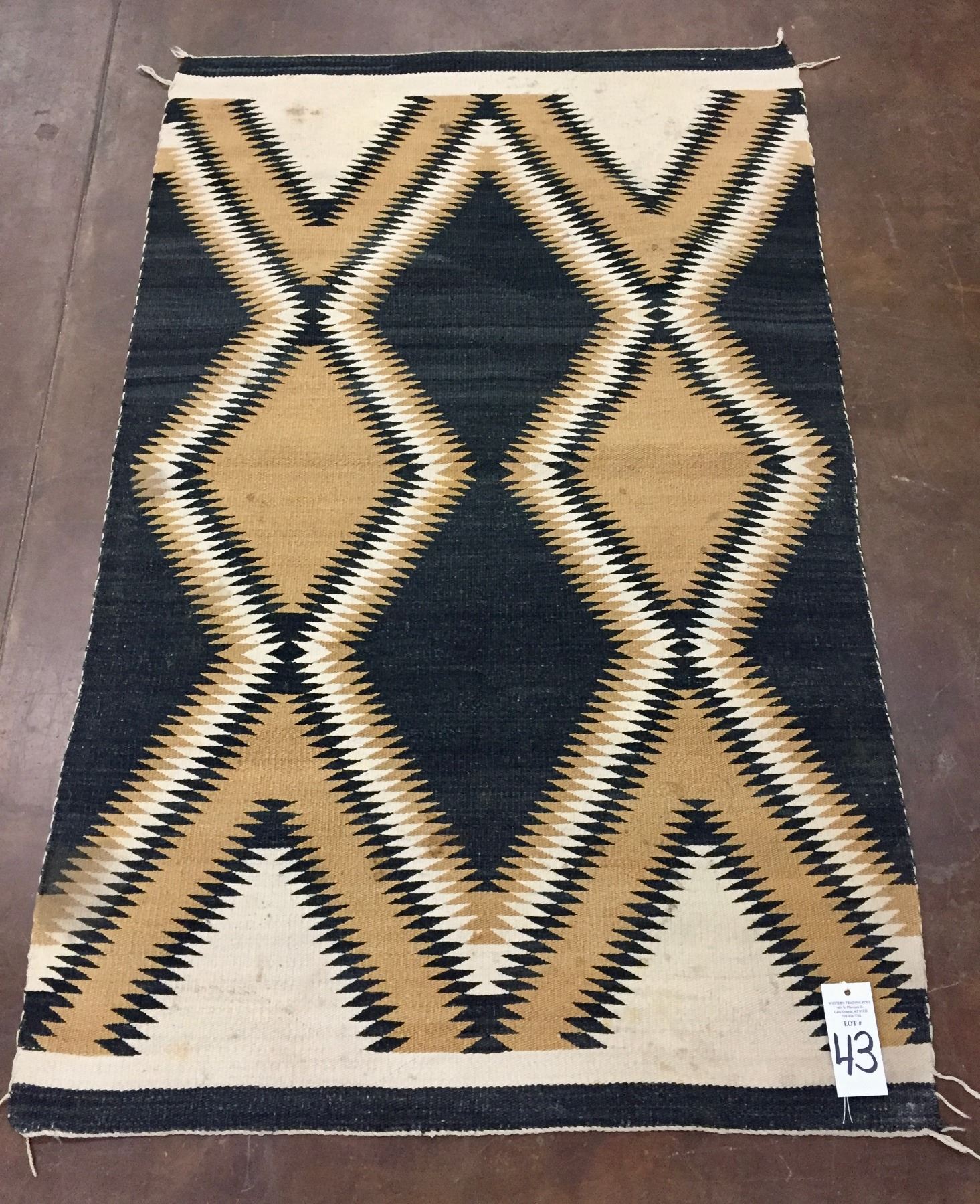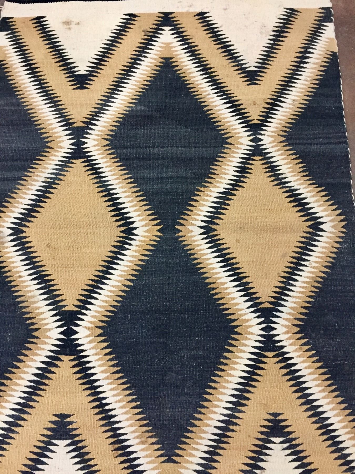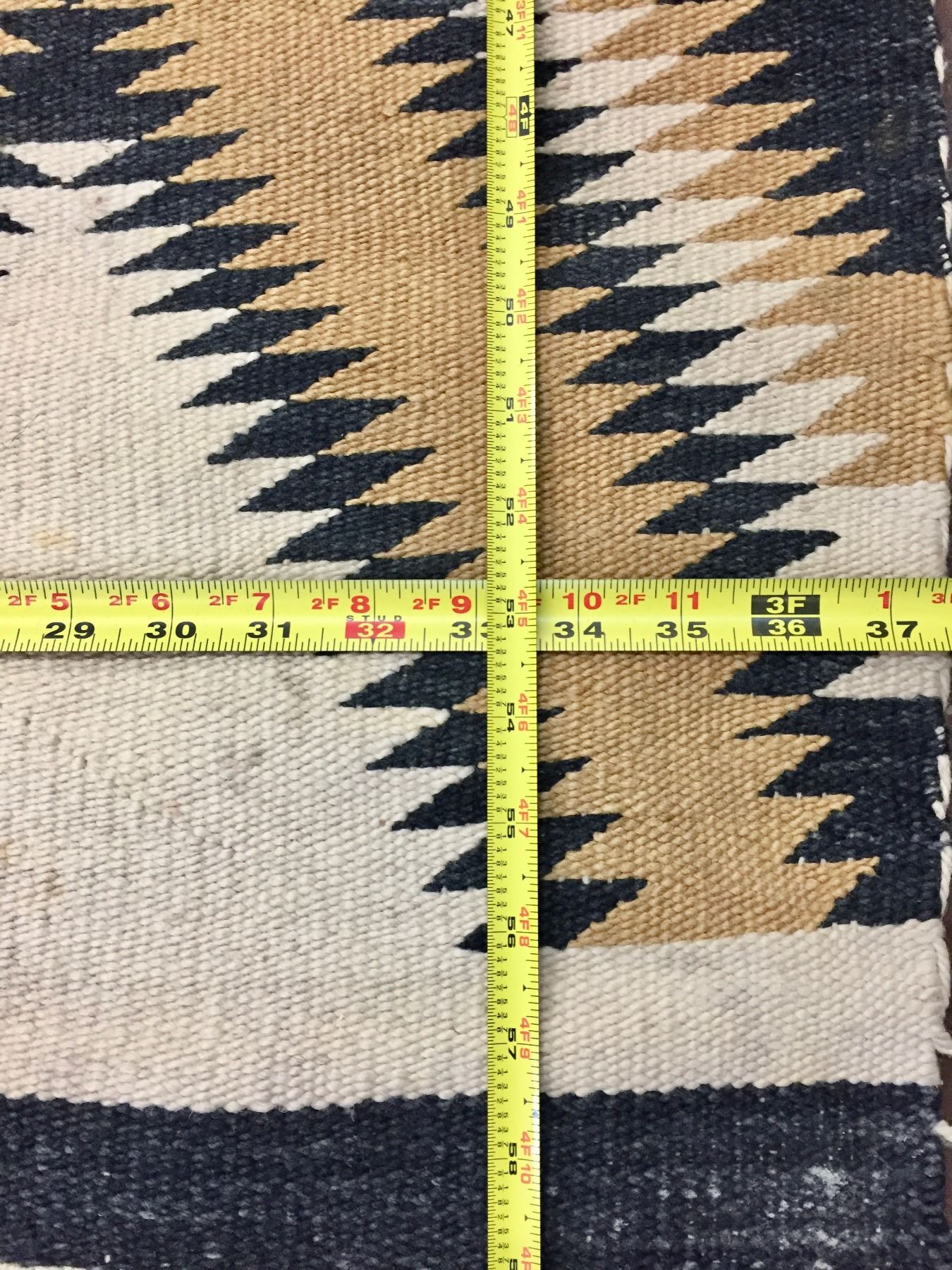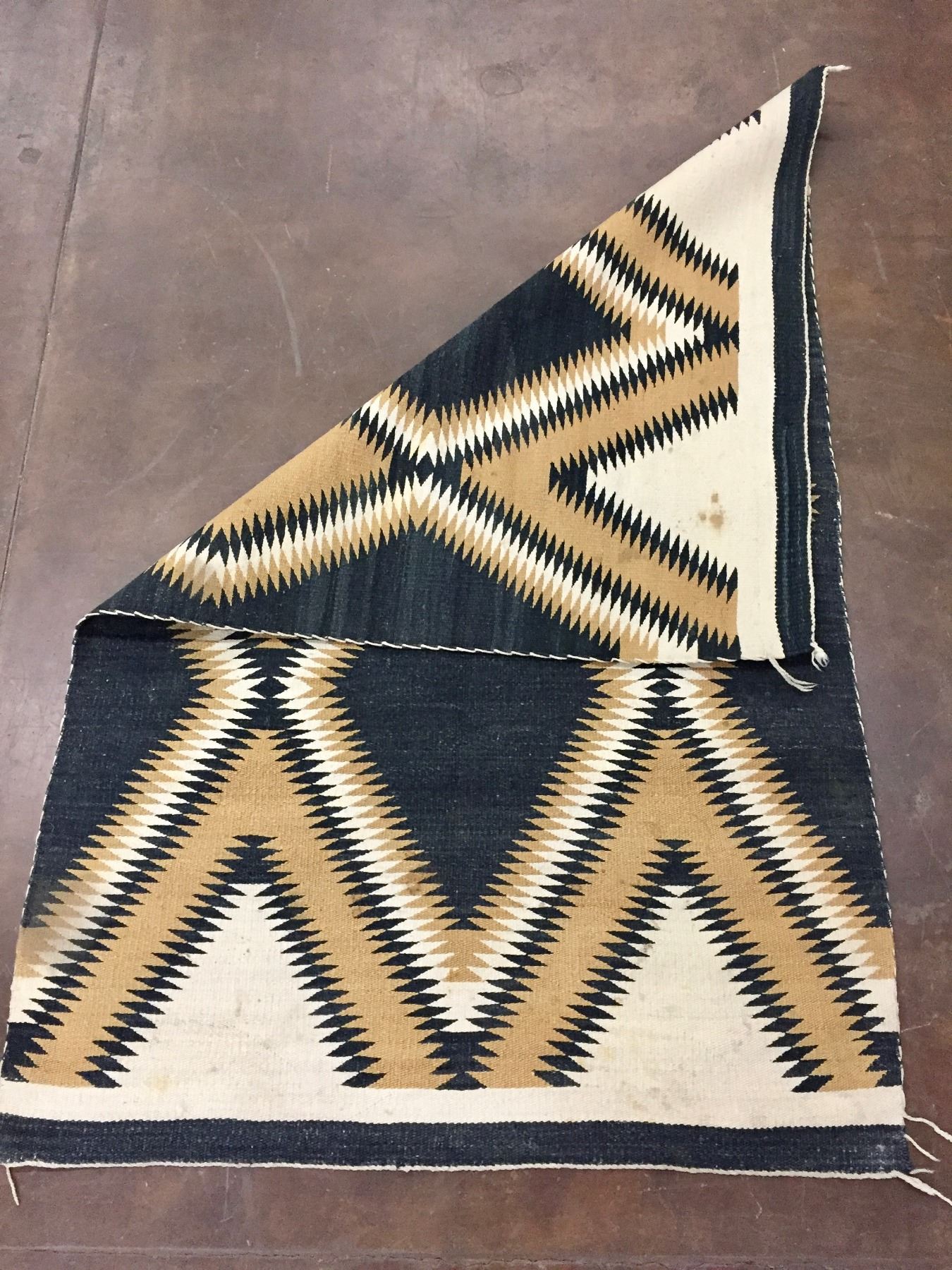 Description: Presented for sale in this lot is a vintage Navajo Textile featuring navy, tans and whites with geometric designs.                                                                                                            Maker: Unknown Navajo Weaver.                                                                                                                   Approx. Age: Circa mid-century vintage.                                                                                                            Size: 37-1/2”w x 59” long.                                                                                                                                                                                                                                   Condition: Pretty good for its age, normal wear expected. There are dirty spots on textile.                                                                                                                              Please look closely at the pictures - they are an important part of our description.                                Shipping: There will be a $7 handling / packaging fee for shipping this lot. The actual cost of postage will be added on top of that.