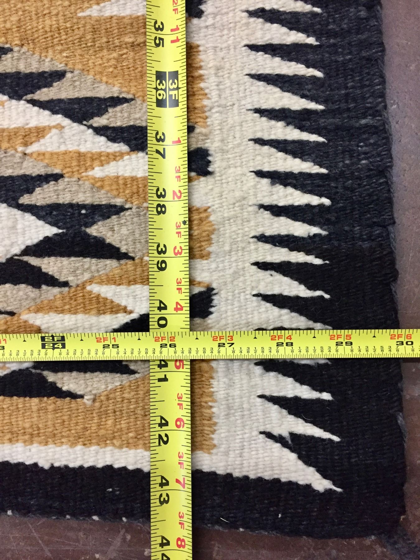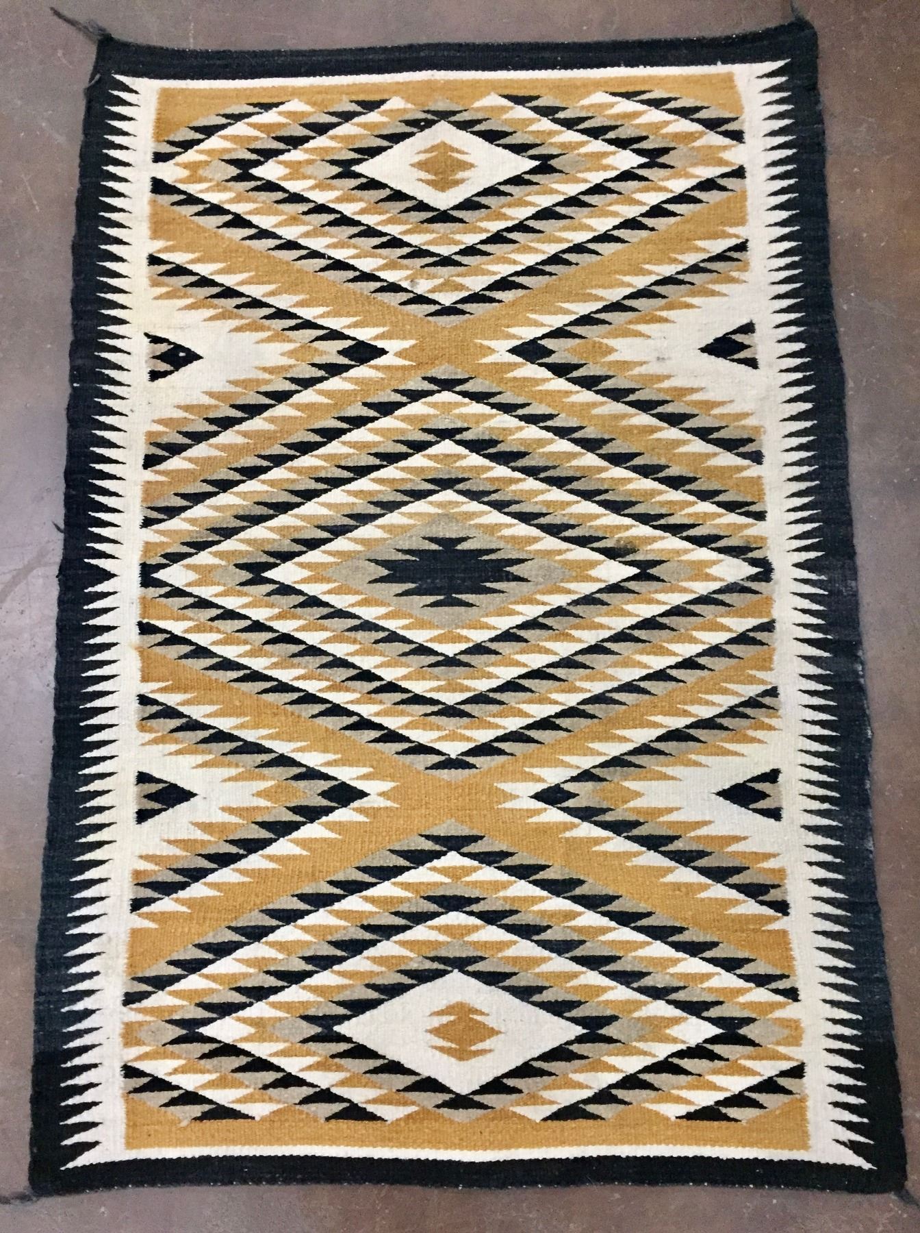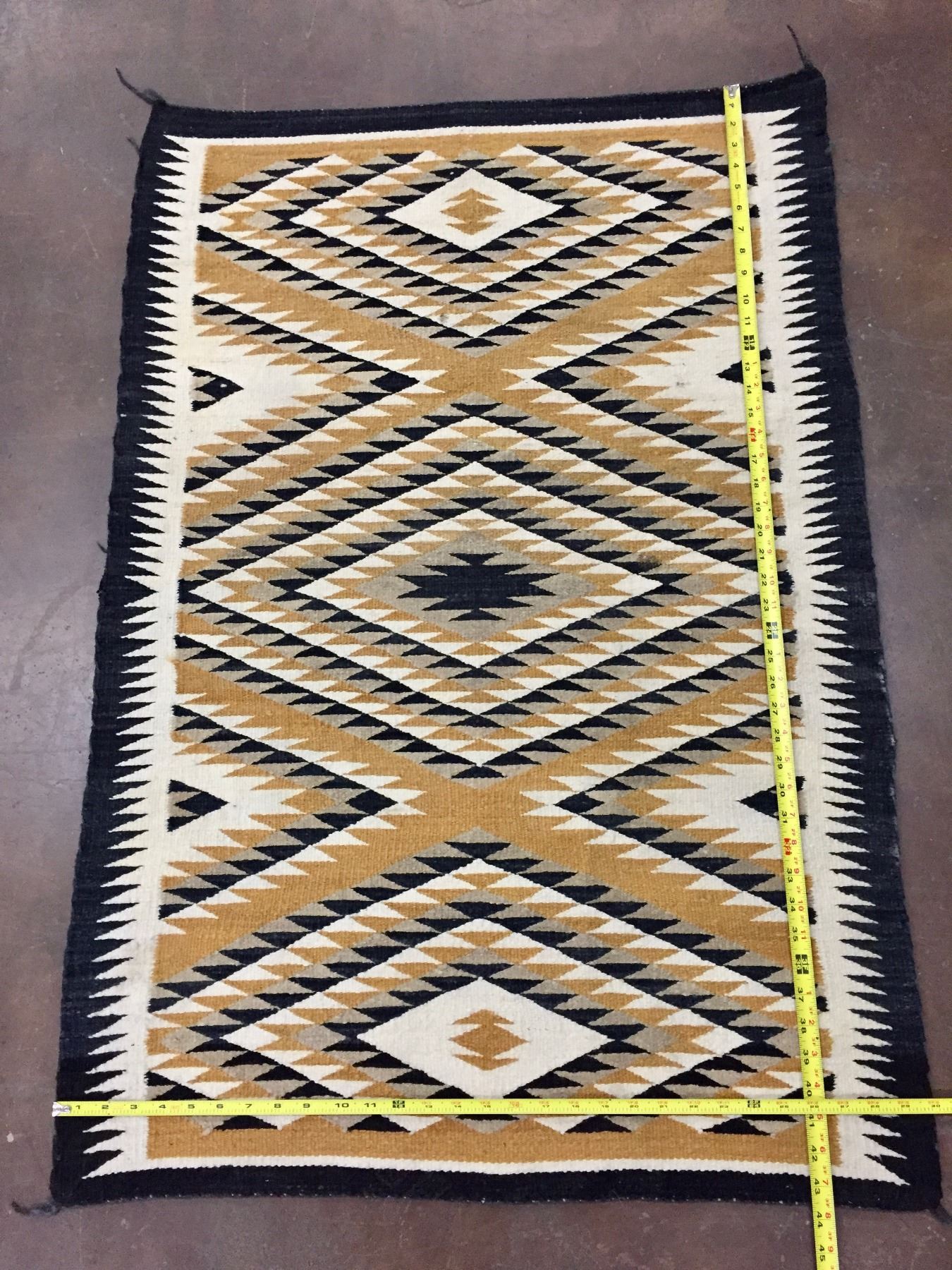 Description: Offered for sale in this lot is a vintage Navajo Textile featuring navy, tans and whites with geometric designs.                                                                                                                 Maker: Unknown Navajo Weaver.                                                                                                                  Approx. Age: Circa mid-century vintage.                                                                                                            Size: 30”w x 43-1/2” long.                                                                                                                                                                                                                                 Condition: Pretty good for its age, wear expected.                                                                                                                Please look closely at the pictures - they are an important part of our description.                                Shipping: There will be a $7 handling / packaging fee for shipping this lot. The actual cost of postage will be added on top of that.