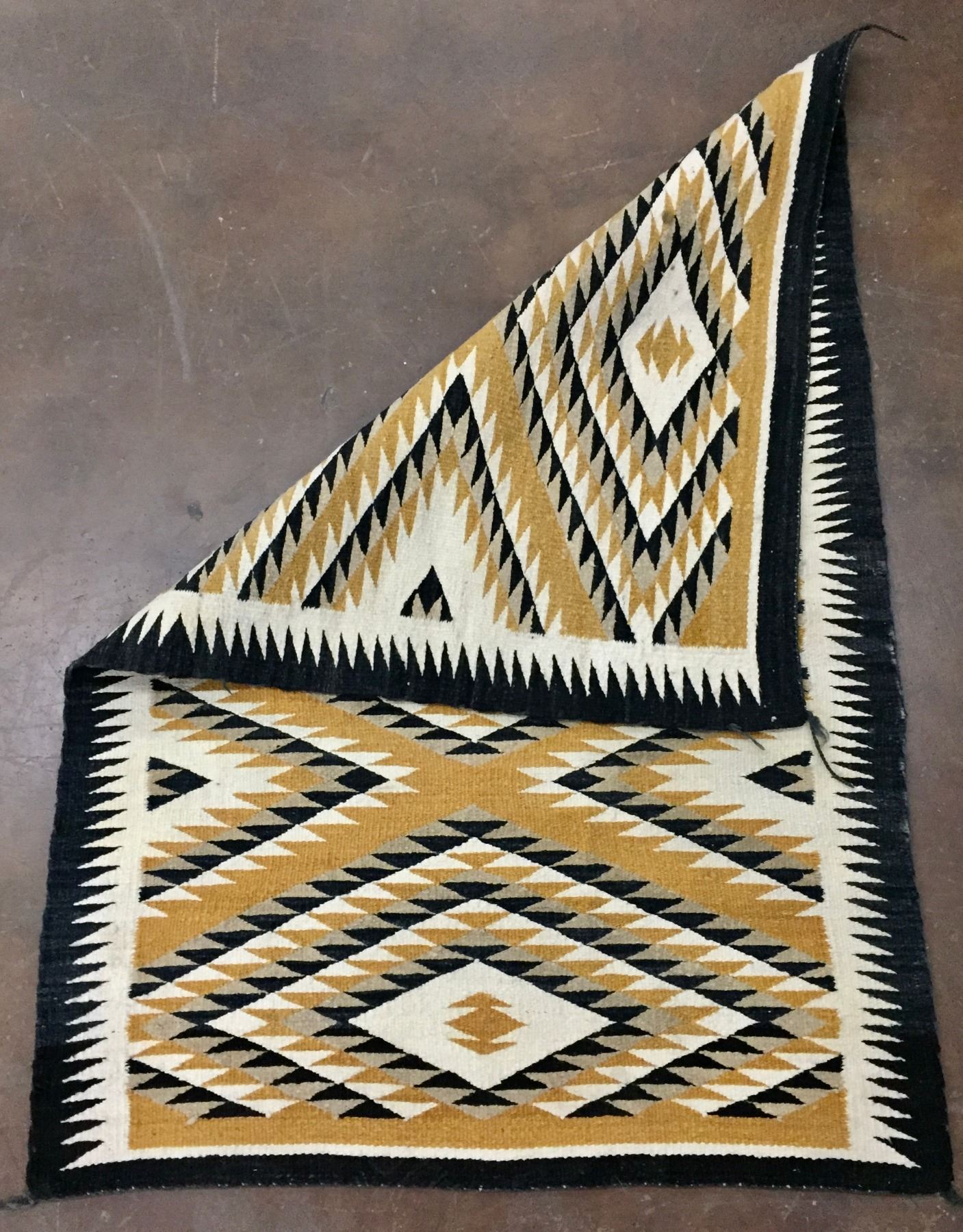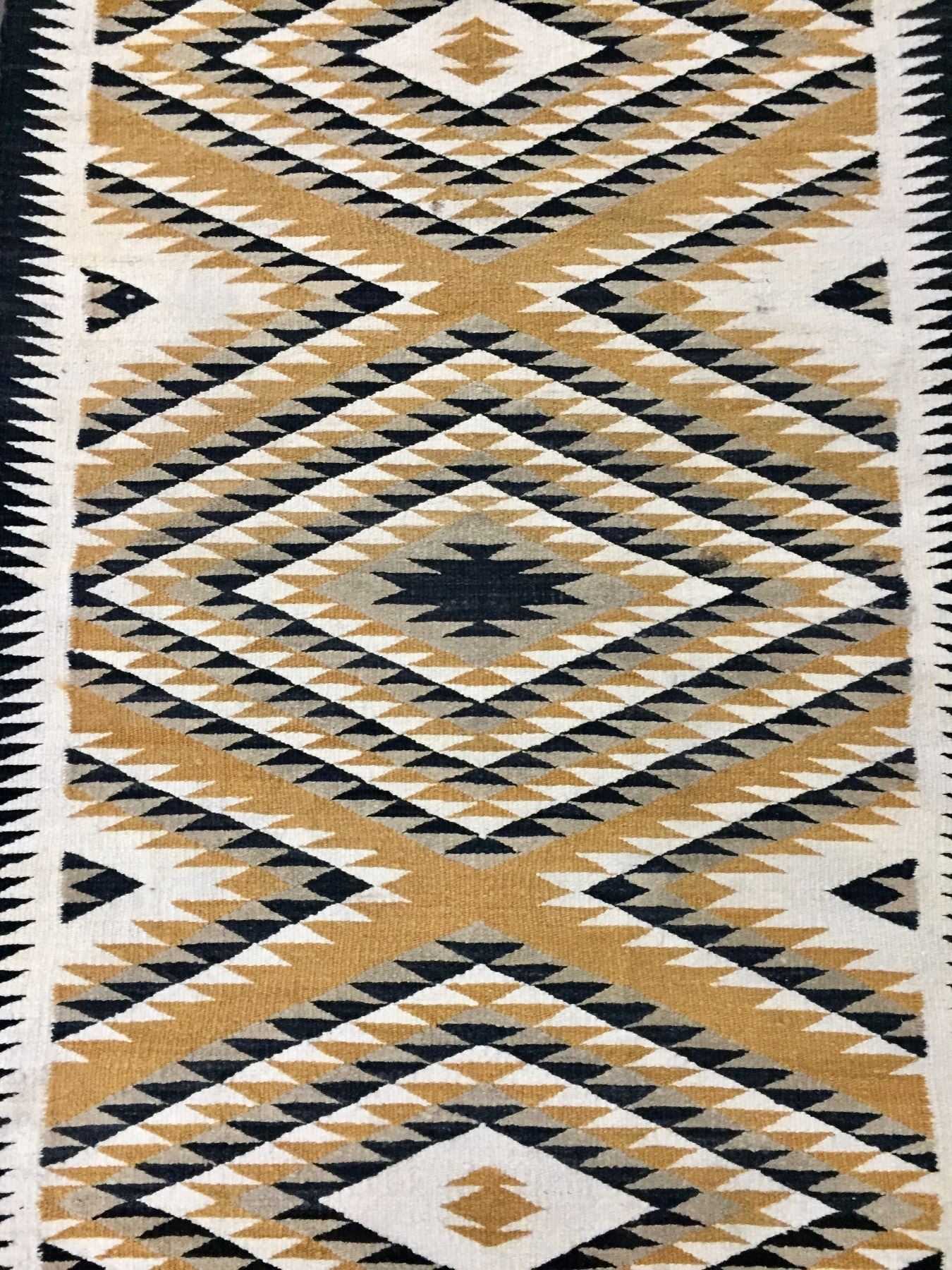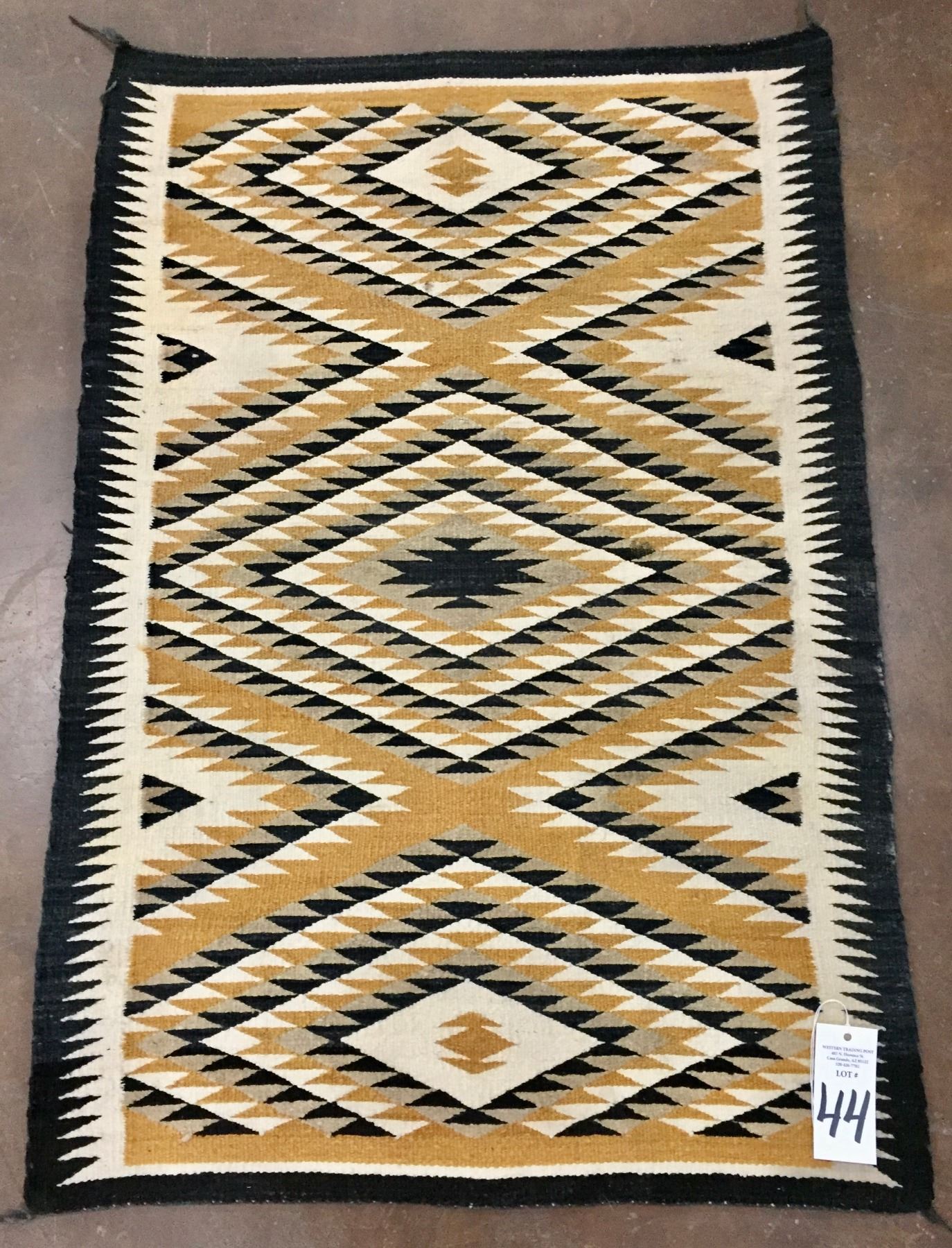Description: Offered for sale in this lot is a vintage Navajo Textile featuring navy, tans and whites with geometric designs.                                                                                                                 Maker: Unknown Navajo Weaver.                                                                                                                  Approx. Age: Circa mid-century vintage.                                                                                                            Size: 30”w x 43-1/2” long.                                                                                                                                                                                                                                 Condition: Pretty good for its age, wear expected.                                                                                                                Please look closely at the pictures - they are an important part of our description.                                Shipping: There will be a $7 handling / packaging fee for shipping this lot. The actual cost of postage will be added on top of that.