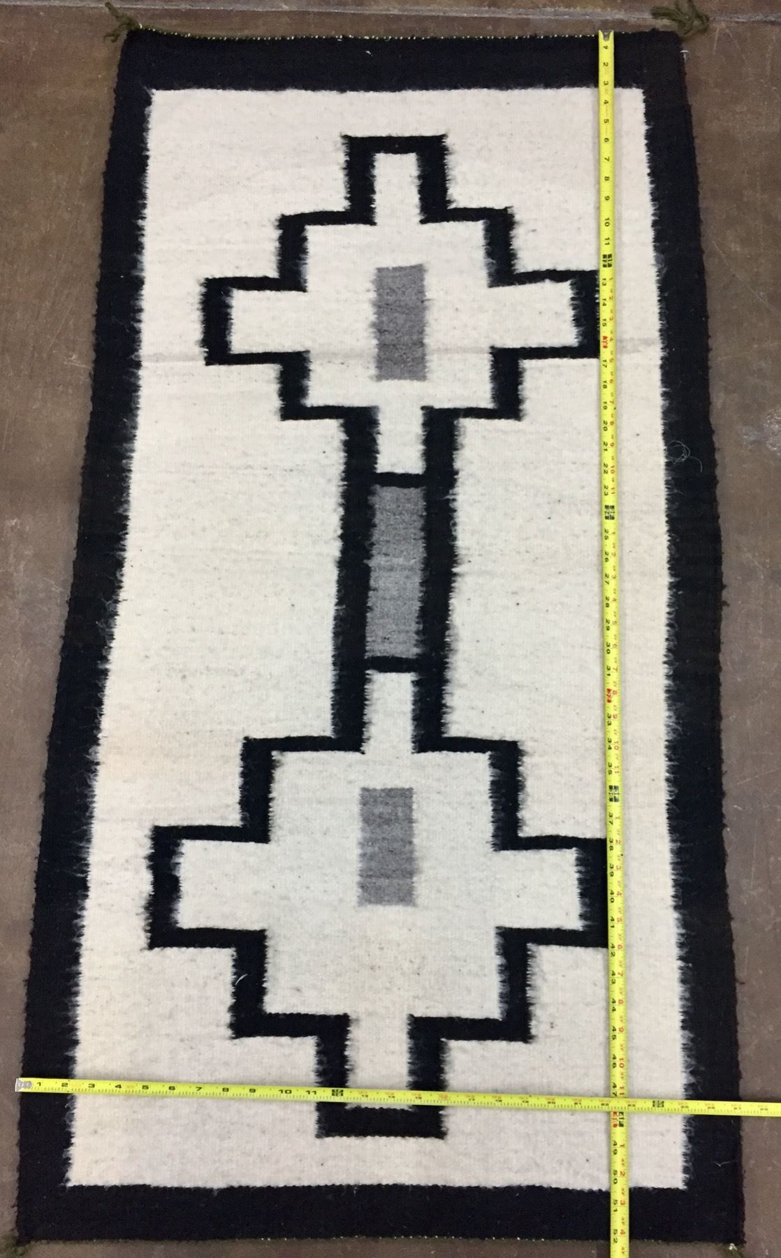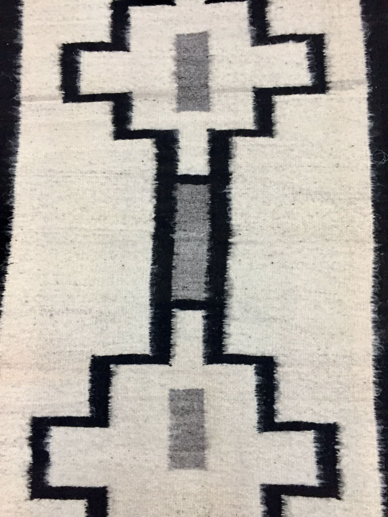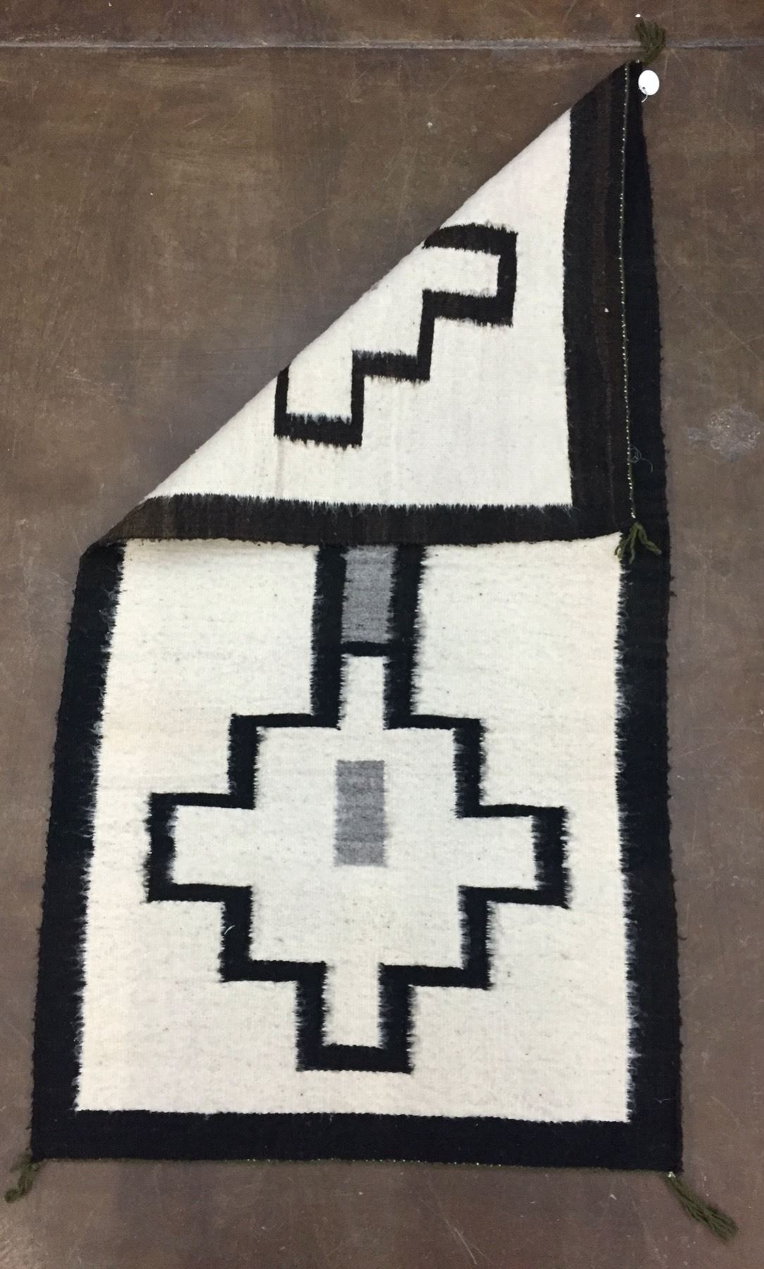 Description: Offered for sale in this lot a nice, vintage Navajo Textile featuring blacks, browns, grays and whites made from hand spun and hand dyed wool. Has cross designs. Maker: Unknown Navajo Weaver. Approx. Age: Circa 1940s. Size: 27”w x 52” long. Condition: Pretty good for its age, normal wear expected. Has minor spots. Please look closely at the pictures - they are an important part of our description. Shipping: There will be a $5 handling / packaging fee for shipping this lot. The actual cost of postage will be added on top of that.