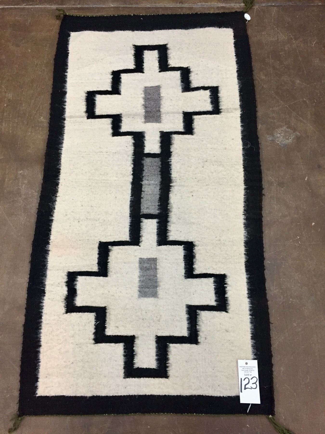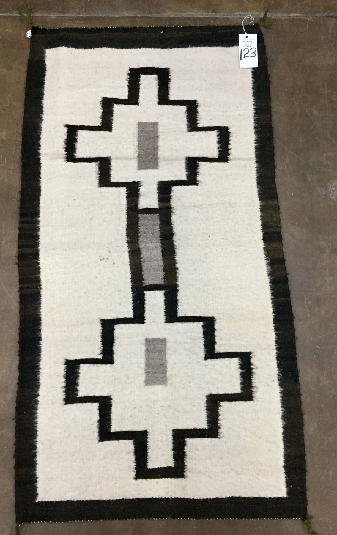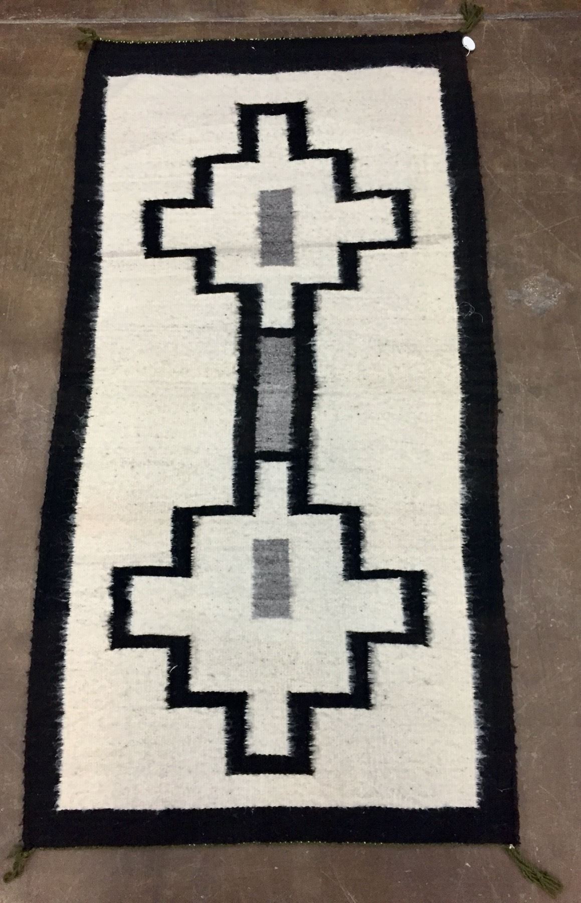 Description: Offered for sale in this lot a nice, vintage Navajo Textile featuring blacks, browns, grays and whites made from hand spun and hand dyed wool. Has cross designs. Maker: Unknown Navajo Weaver. Approx. Age: Circa 1940s. Size: 27”w x 52” long. Condition: Pretty good for its age, normal wear expected. Has minor spots. Please look closely at the pictures - they are an important part of our description. Shipping: There will be a $5 handling / packaging fee for shipping this lot. The actual cost of postage will be added on top of that.