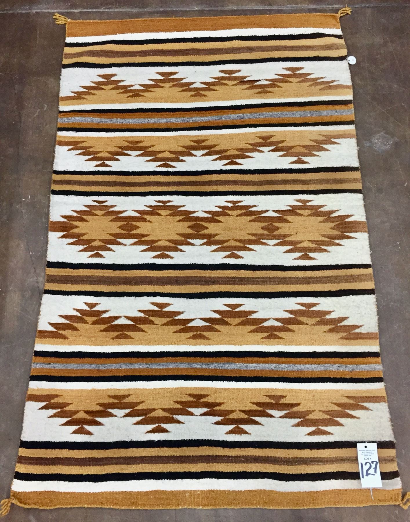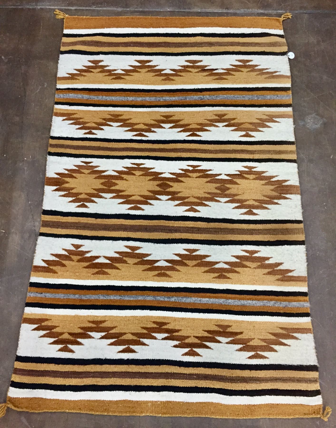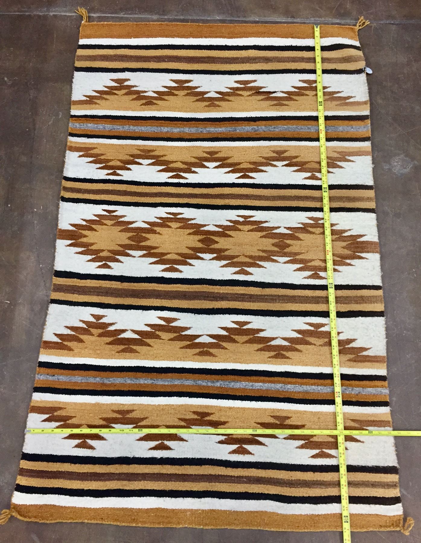 Description: For sale in this lot is a vintage Navajo Textile featuring yellows, browns and whites made from hand spun and hand dyed wool. Maker: Unknown Navajo Weaver. Approx. Age: Circa mid-century. Size: 38-1/2” x 61”. Condition: Good for its age, normal wear and aging expected. Please look closely at the pictures - they are an important part of our description. Shipping: There will be a $5 handling / packaging fee for shipping this lot. The actual cost of postage will be added on top of that.