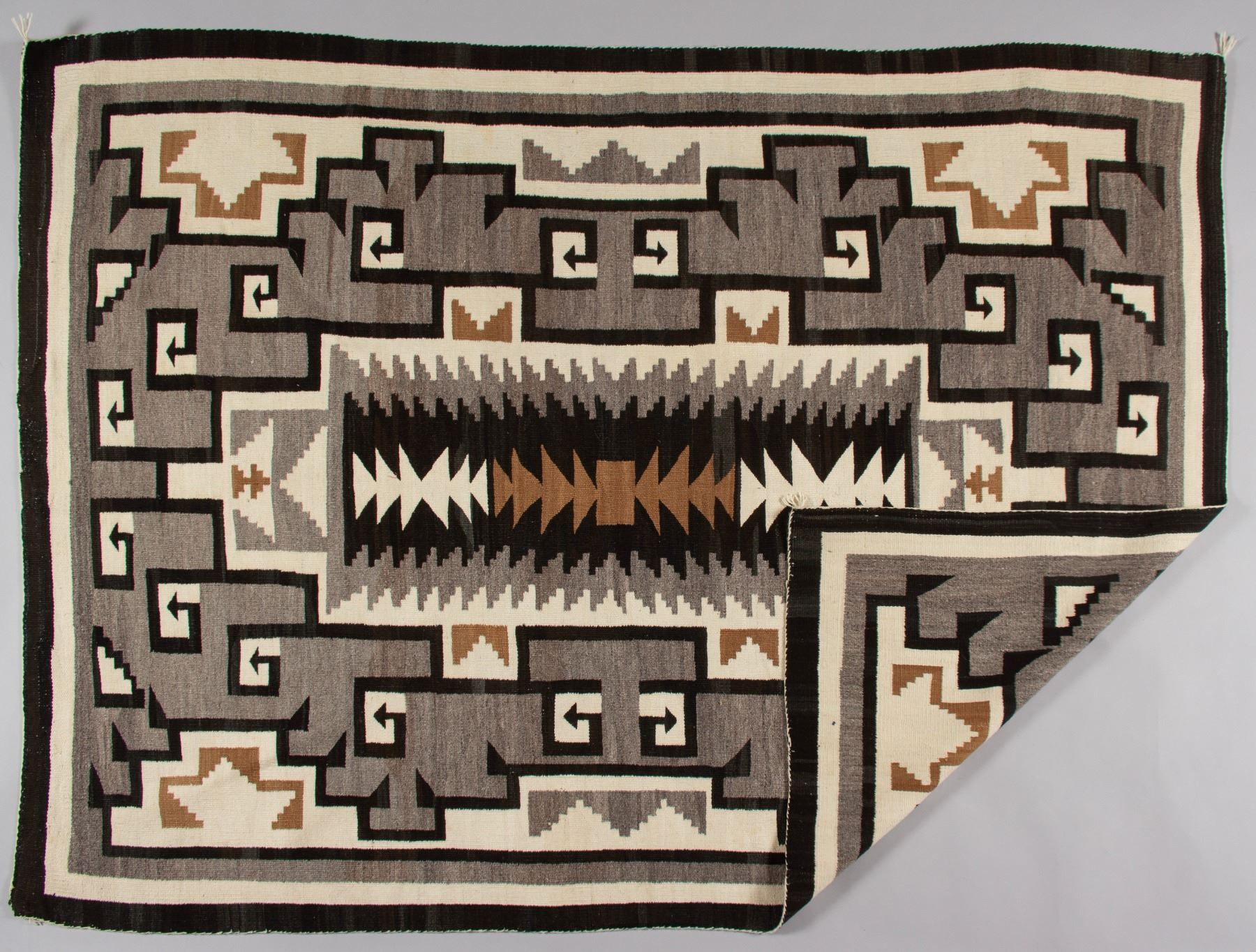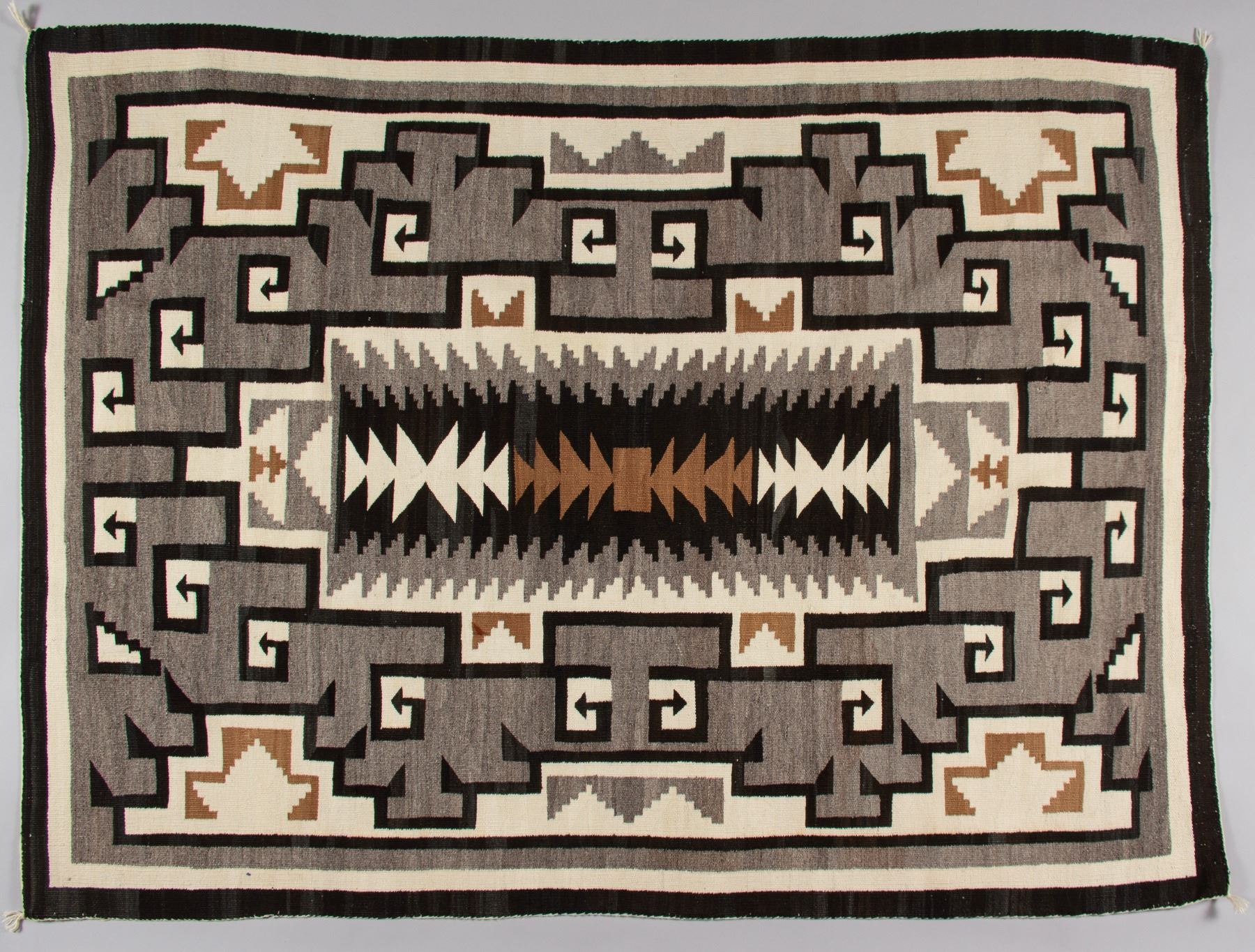 Navajo Two Grey Hills rug showcases the classic regional style revered for its intricate geometric patterns and use of natural, undyed wool. The finely hand-spun wool, characteristic of high-quality Two Grey Hills weavings, creates a tight, dense, and subtle textile. The naturally occuring colors of black, white, and various shades of grey and brown offer a subdued yet sophisticated patette. Large central diamond; HandSpun no dyes.