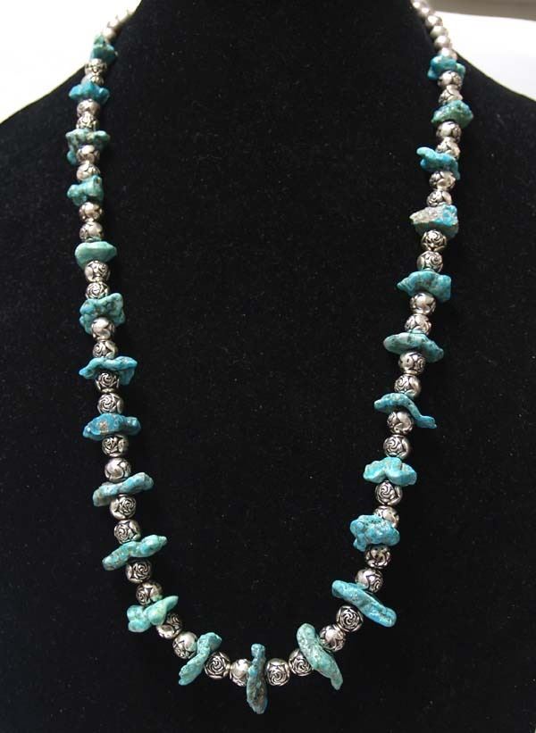 Vintage Beautiful Native American Navajo Turquoise Nugget Necklace, measures 28''L end to end, largest nugget measures 1'', sterling silver hollow beads