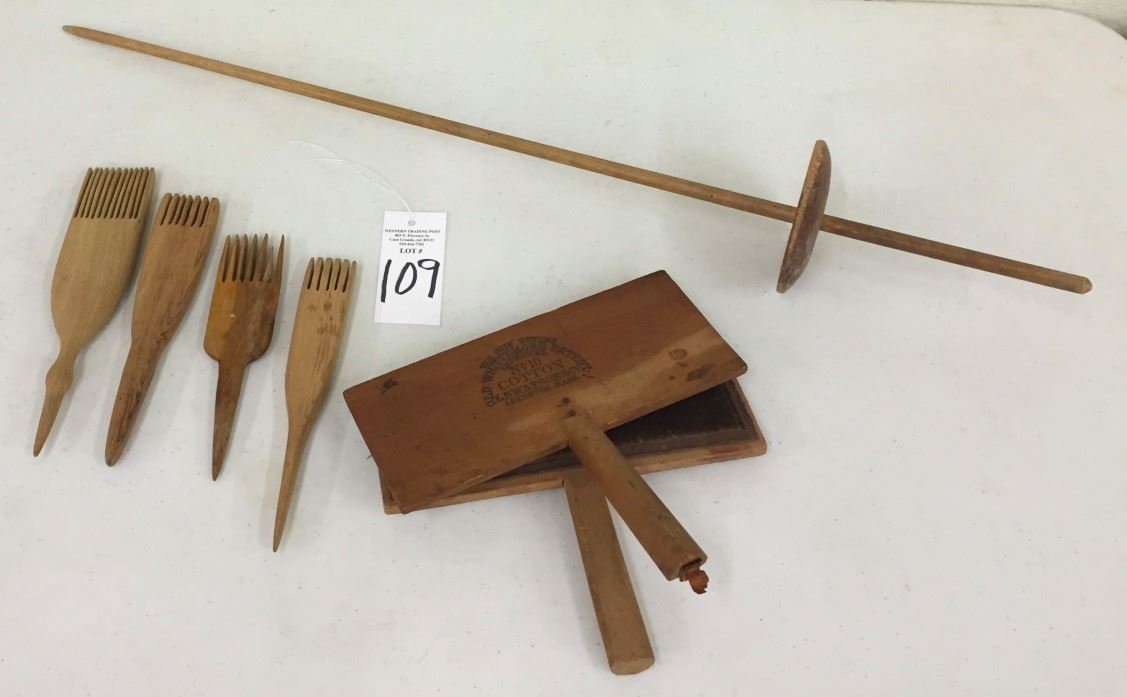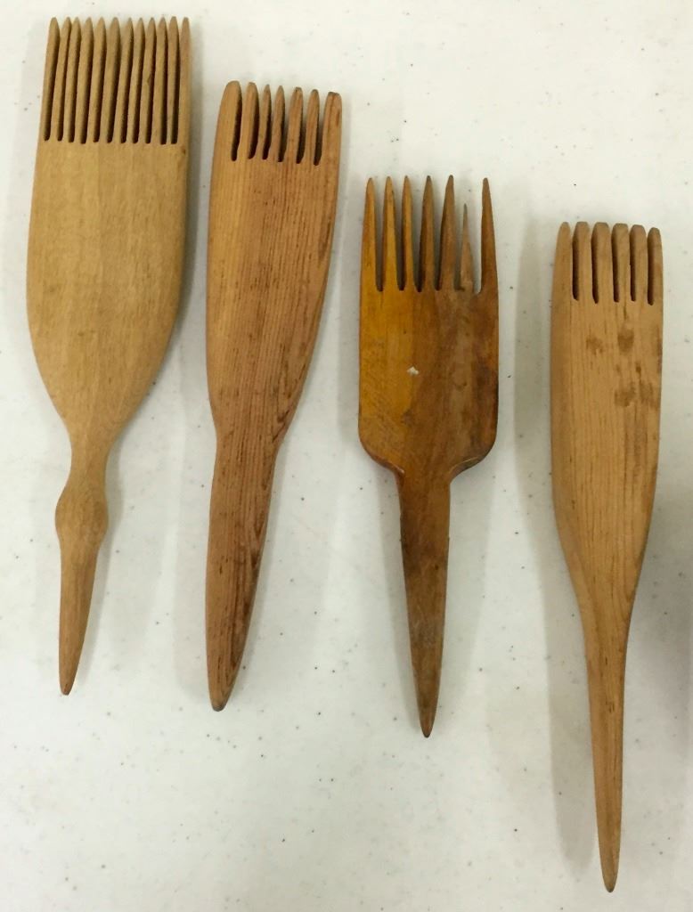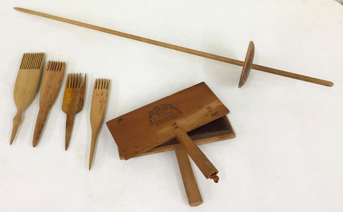 This vintage Navajo weaver's tool set includes several combs, a long spindle rod, and a couple of carding brushes. Please look closely at the pics as they are an important part of our description. Shipping: There will be a $7 handling / packaging fee for shipping this lot. The actual cost of postage will be added on top of that.