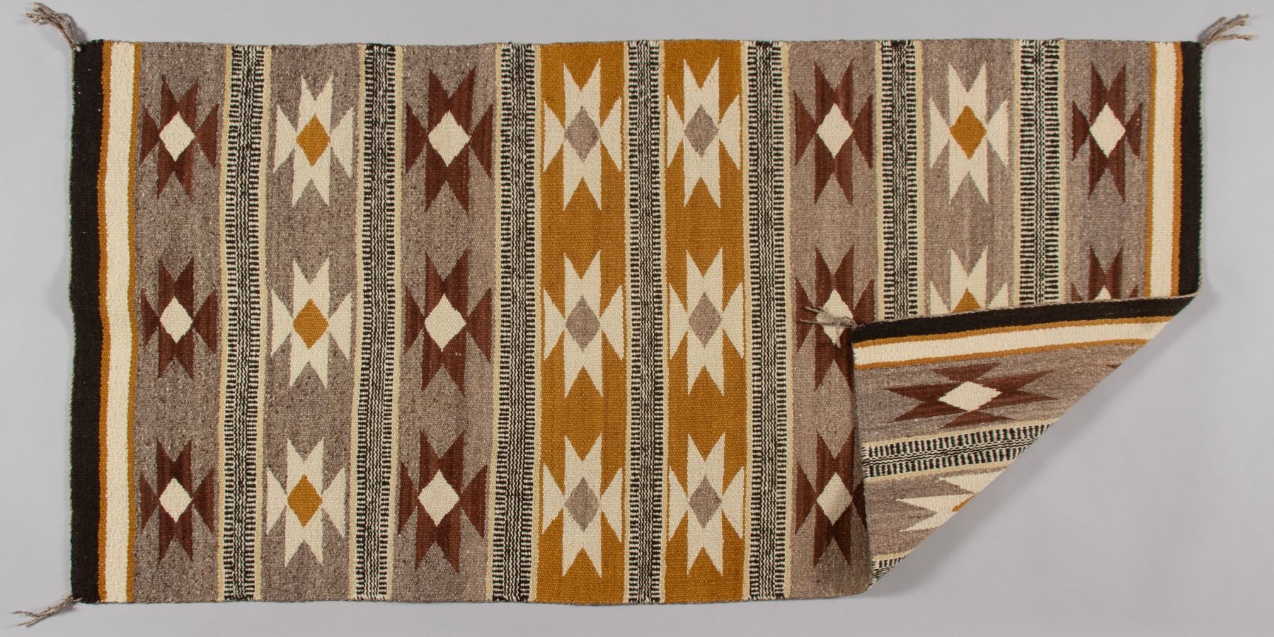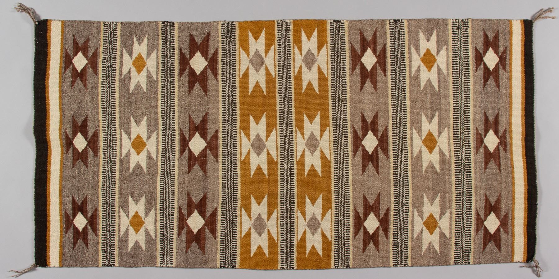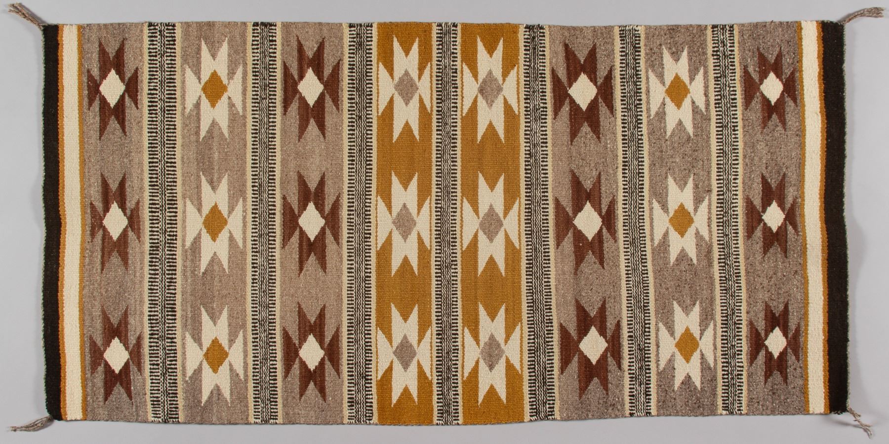 A beautiful, hand-woven Navajo textile, identified by its classic banded pattern and natural color palette as a Wide Ruins regional style rug. This piece showcases traditional geometric motifs, including repeated stepped-diamond and hourglass patterns, in horizontal bands. Hand-spun wool with natural and likely vegetal-dyed yarns in rich earth tones of brown, gray, cream, black, and a distinct gold/mustard yellow hue. This is a wonderful example of Southwest Native American art, highly prized by collectors for its fine weave, traditional design, and beautiful use of color.