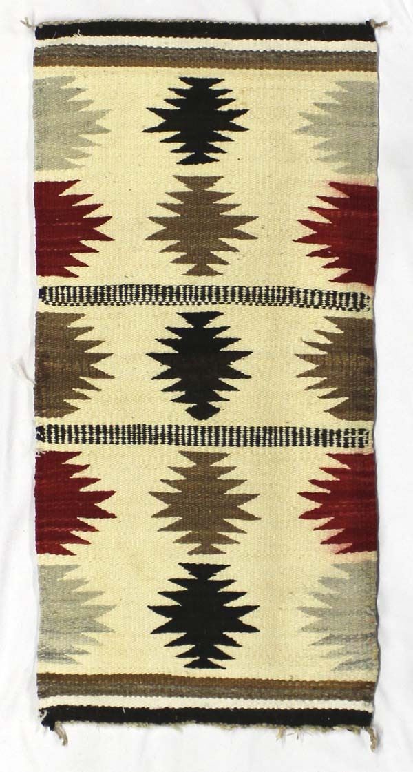 Vintage Native American Navajo Wool Textile Rug, measures 17'' x 36'', 4 tassels intact, selvage damage on one end