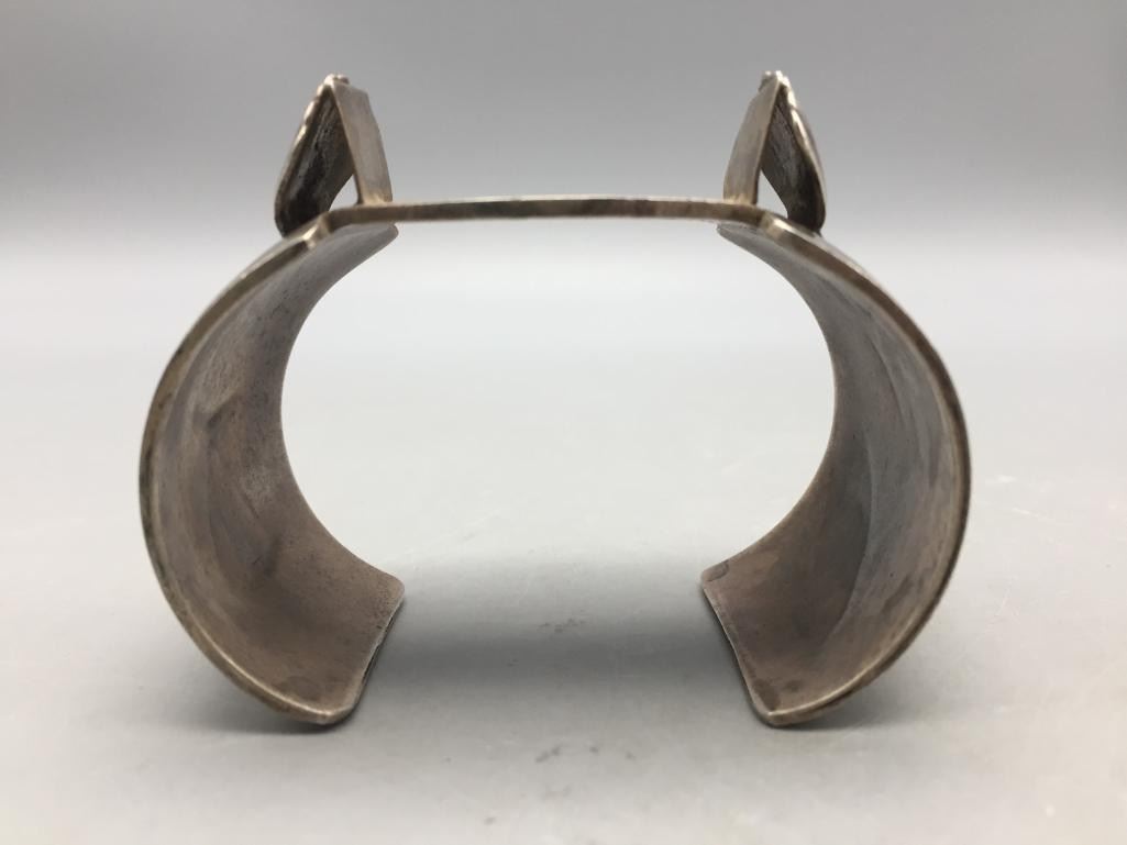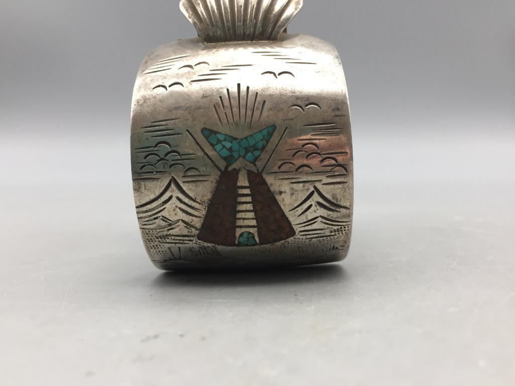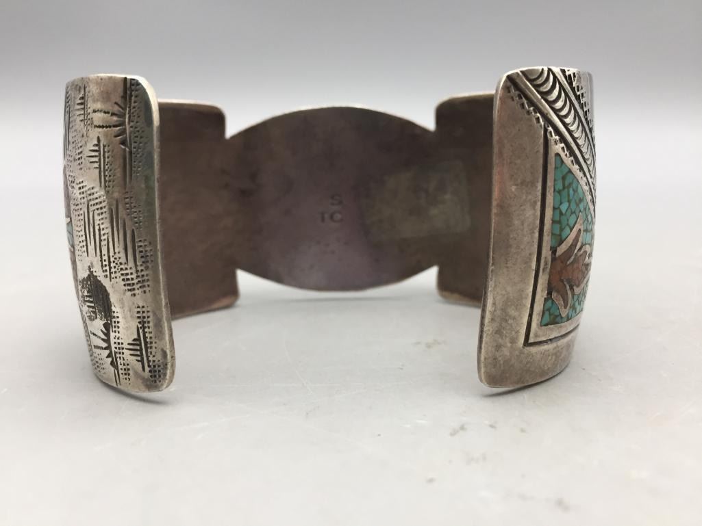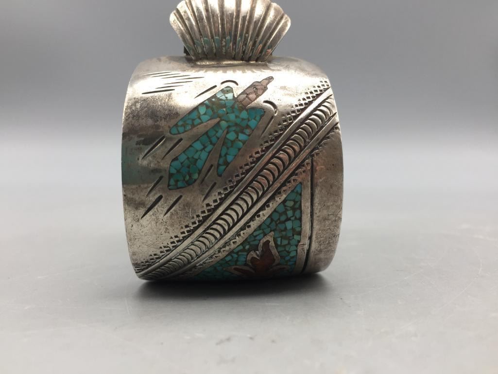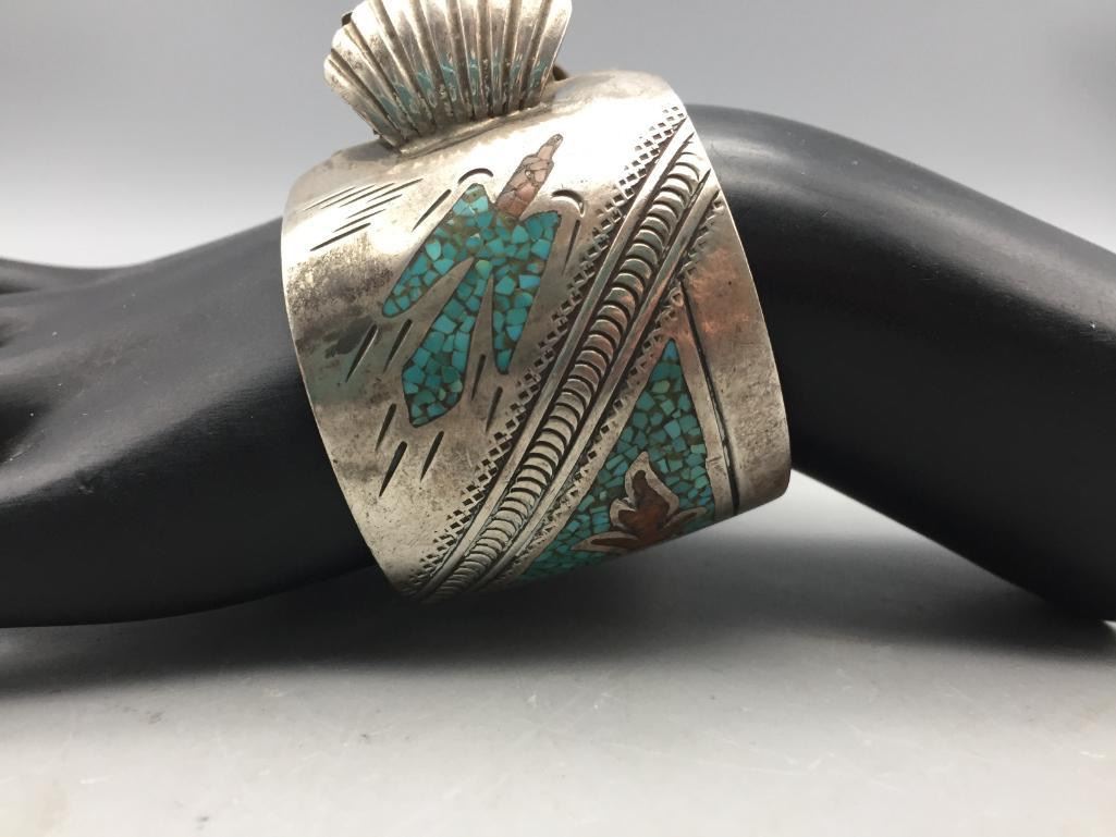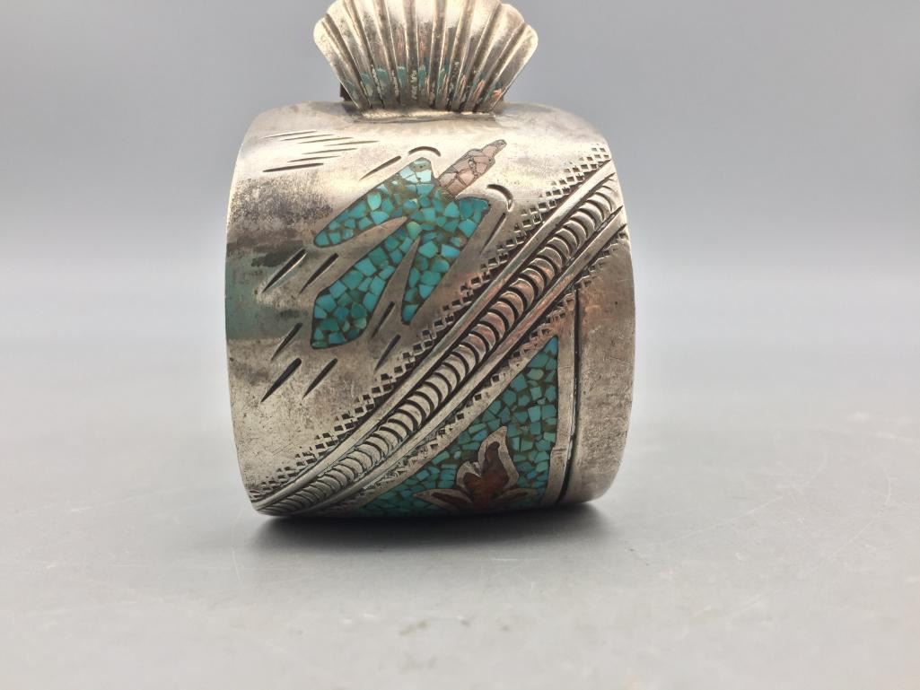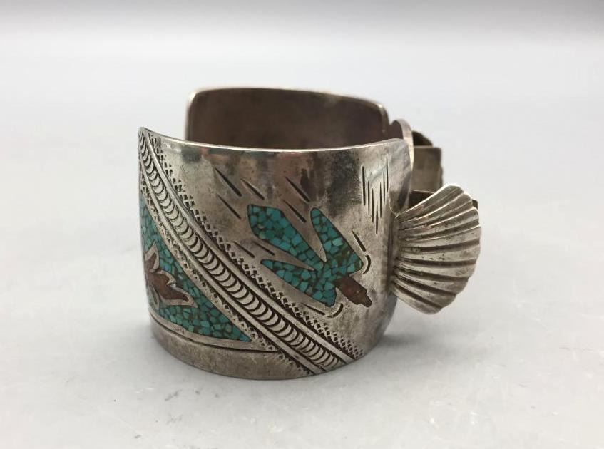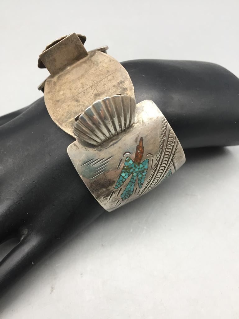 Offered for sale in this lot is a vintage turquoise and coral chip inlay Navajo watch bracelet in sterling silver. This bracelet looks like it is a variation of a Tommy Singer's hallmark. It appears to be in unused condition, like it never had a watch face in it. Maker: Believed to be one of Tommy Singer's hallmarks (and it looks like his early work). Size: Measures 6 inches inside plus a 1-1/2 inch opening, fits a 7-1/2 inch wrist. Width is 1-1/4 at the widest. Age: Circa 1970s. Please look closely at the pictures - they are an important part of our description. Shipping: There will be a $5 handling / packaging fee for shipping this lot. The actual cost of postage will be added on top of that.