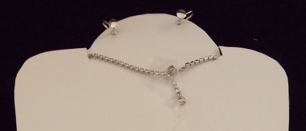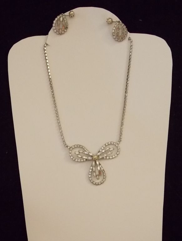 Costume Jewelry Necklace and Ear Ring set with Clear Rhinestones from the '60s. Comes as shown in Photos. Case for display only and is not included.