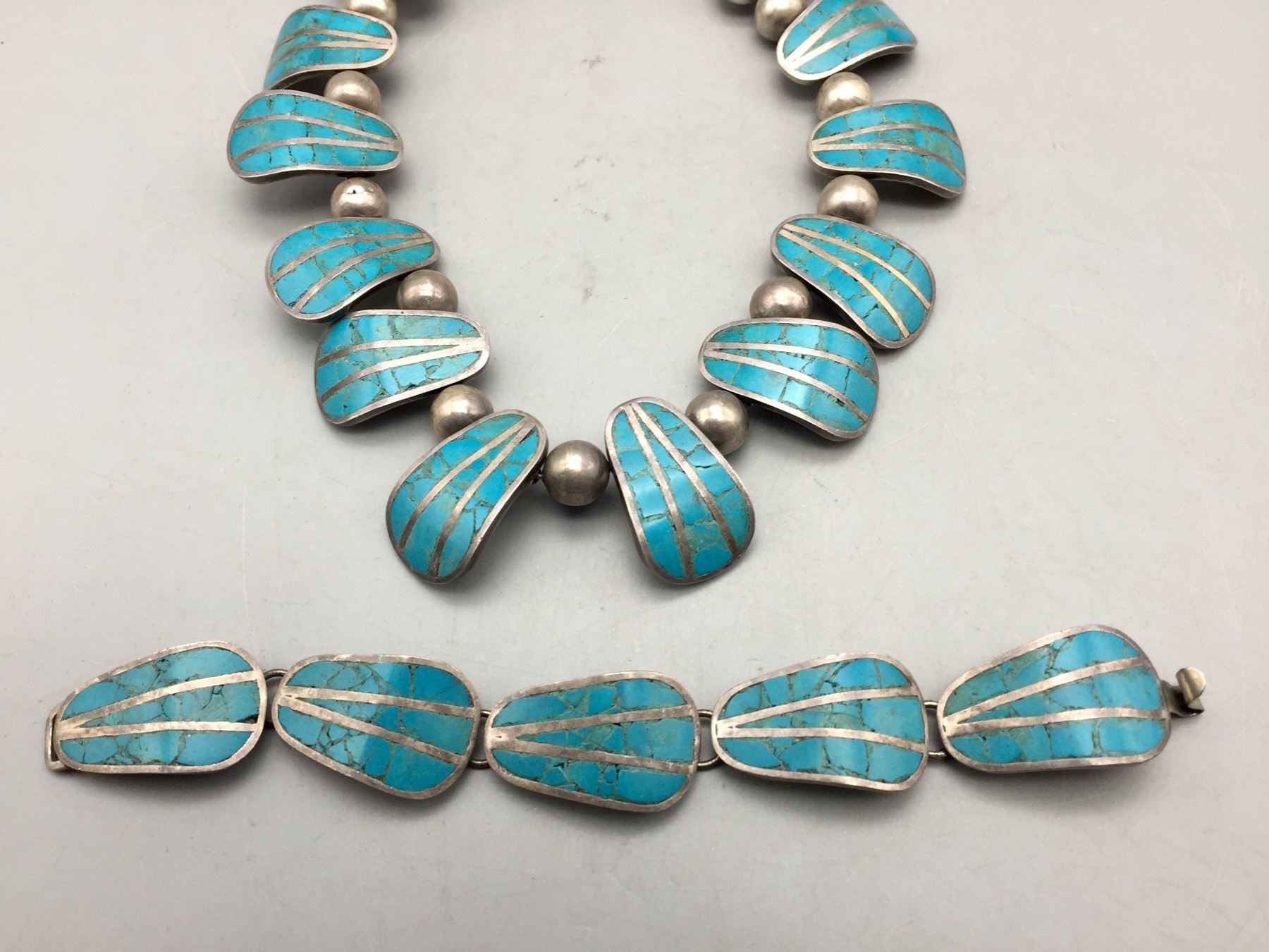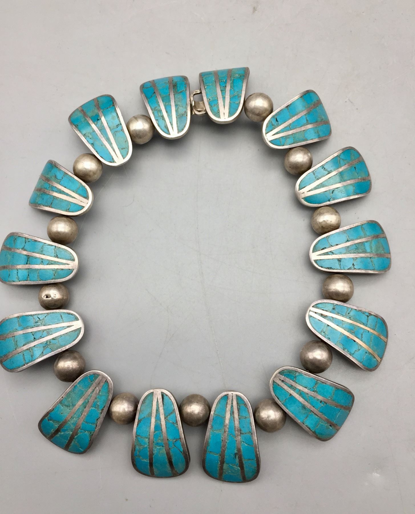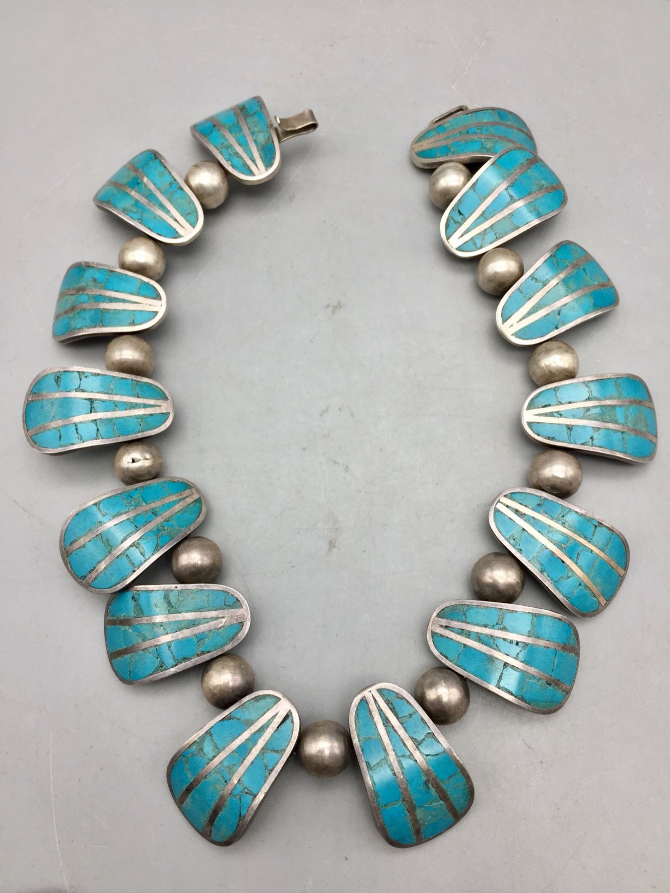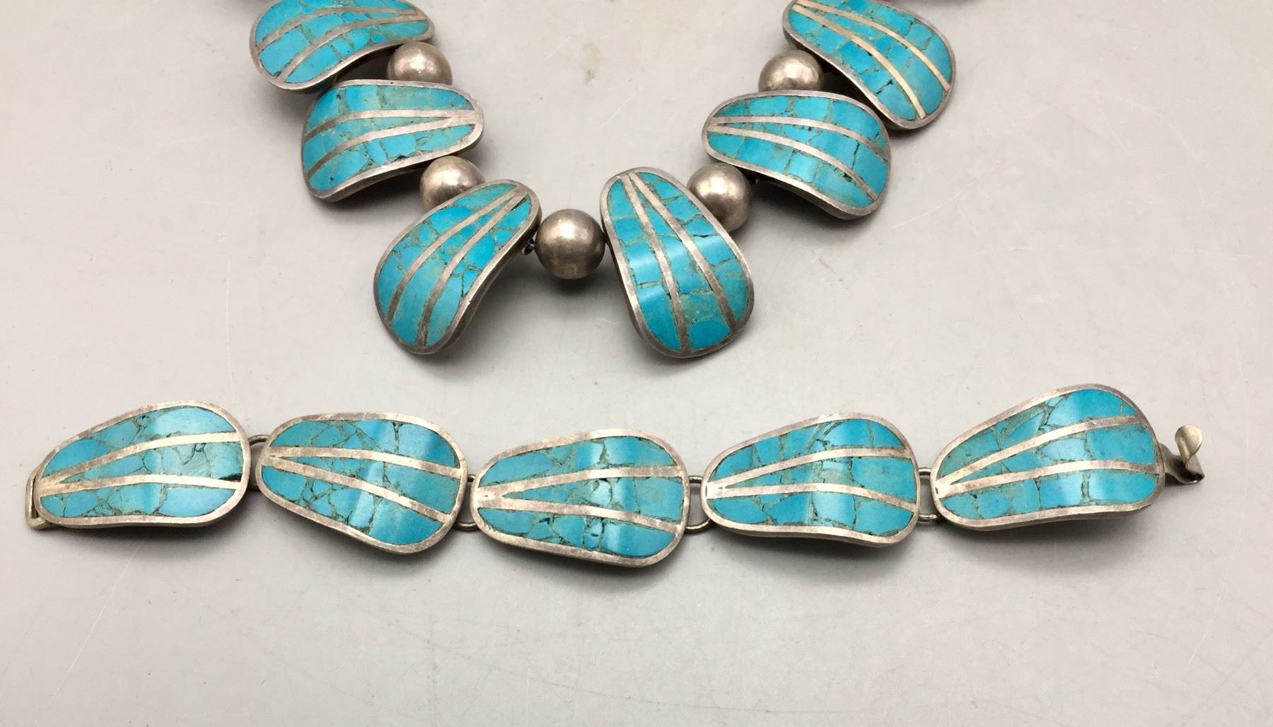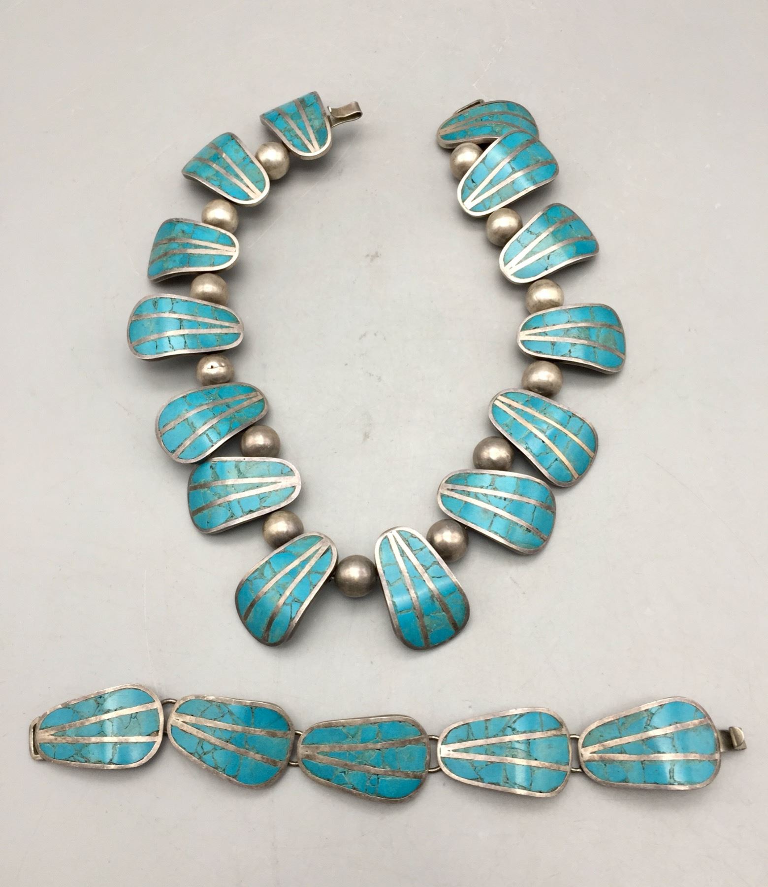Description: Presented for sale in this lot is a beautiful turquoise choker style necklace and a link bracelet set. Has beautiful inlay design silver tabs with handmade beads in between. It is marked, Guaranteed Sterling. Maker: It is Mexican Hallmarked and the initials appear to be FMS. Approx. Age: Vintage. Size: Bracelet is 7-1/4†long X 7/8†wide. Necklace fits a 13†neck. Combined weight is 158.8 grams. Condition: Good for its age, normal wear expected. Please look closely at the pictures - they are an important part of our description. Shipping: There will be a $5 handling / packaging fee for shipping this lot. The actual cost of postage will be added on top of that.