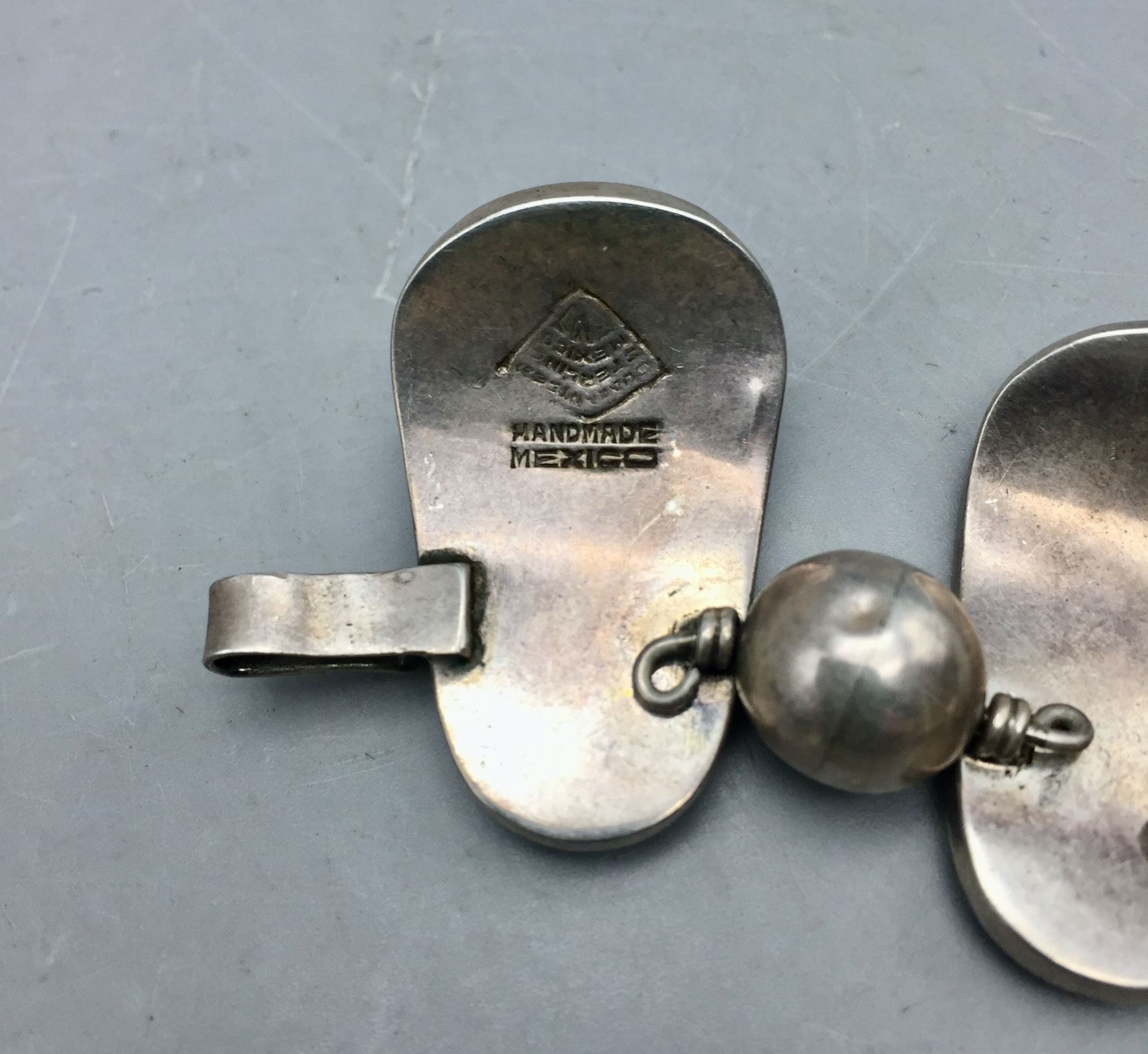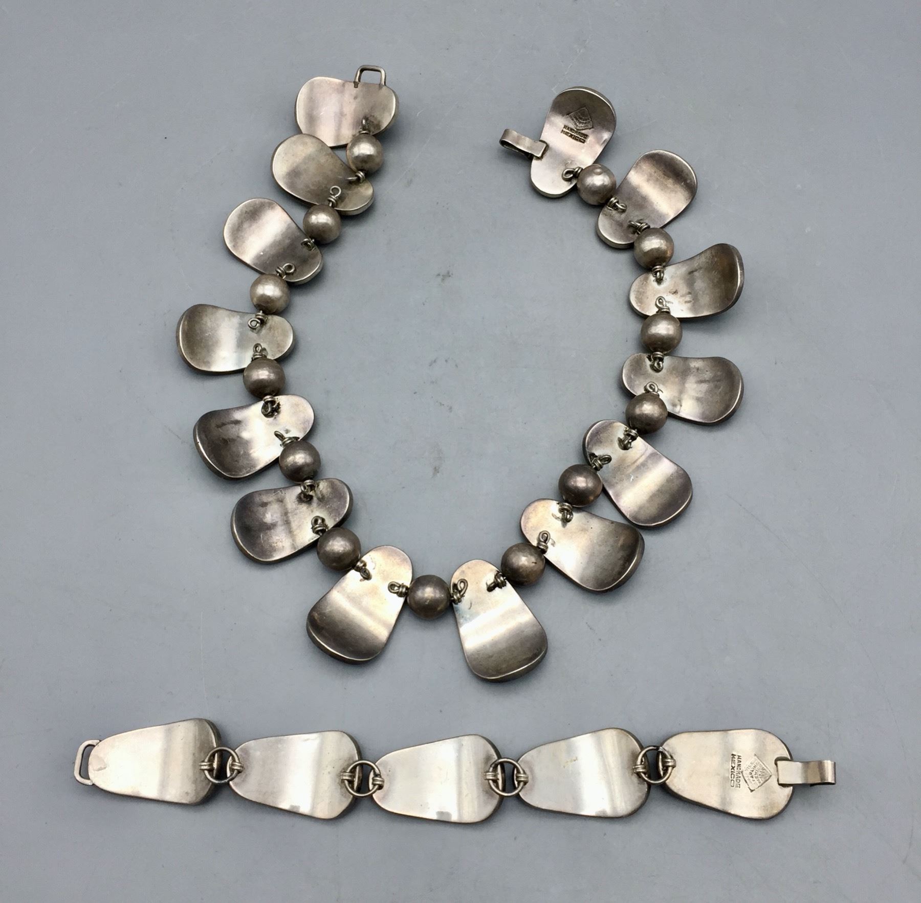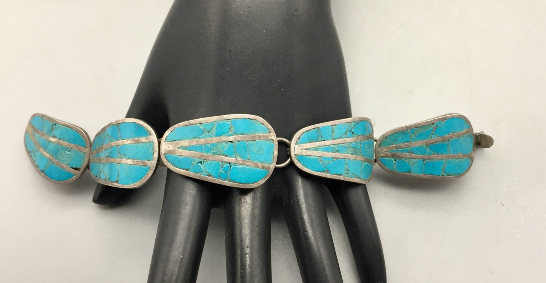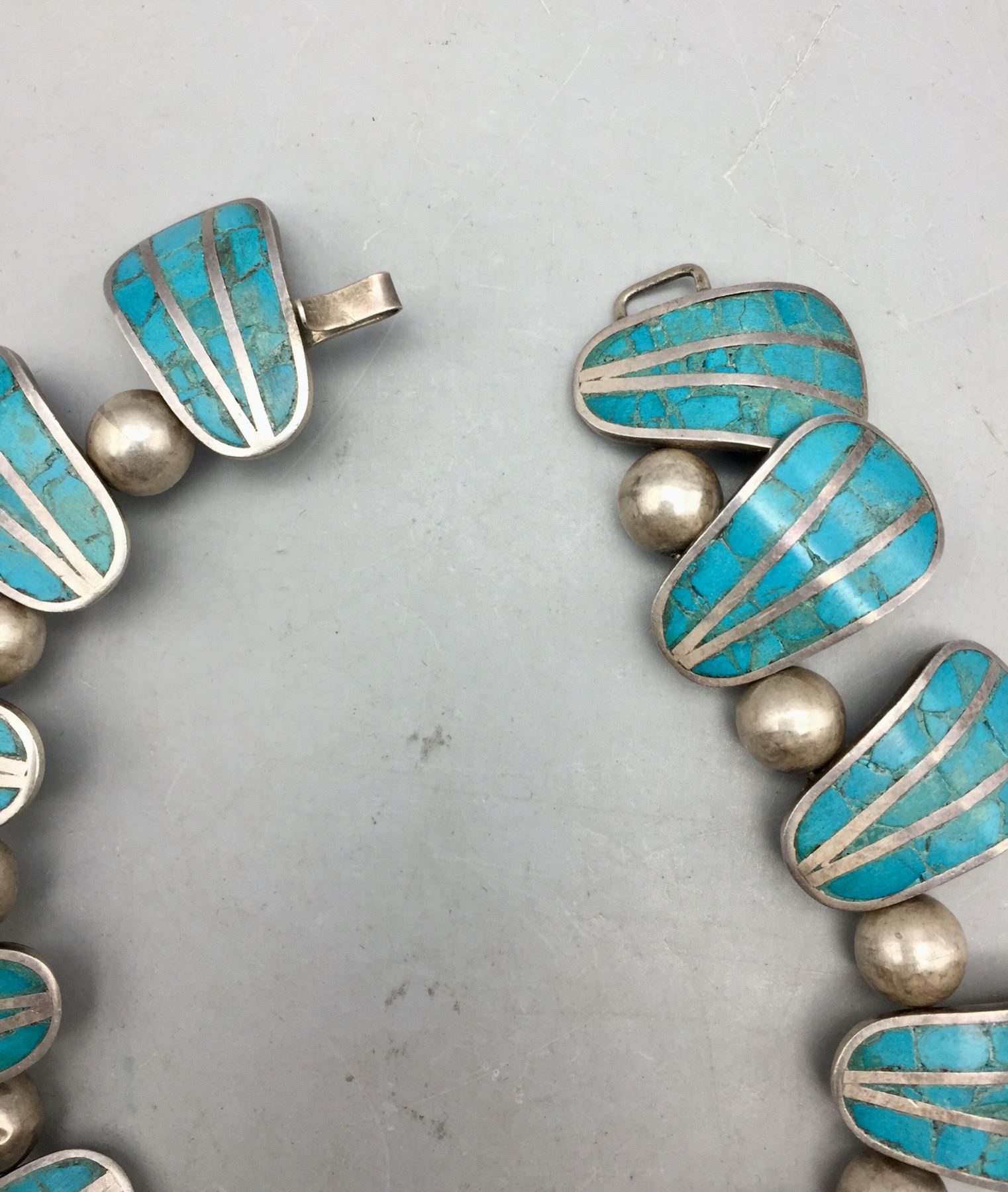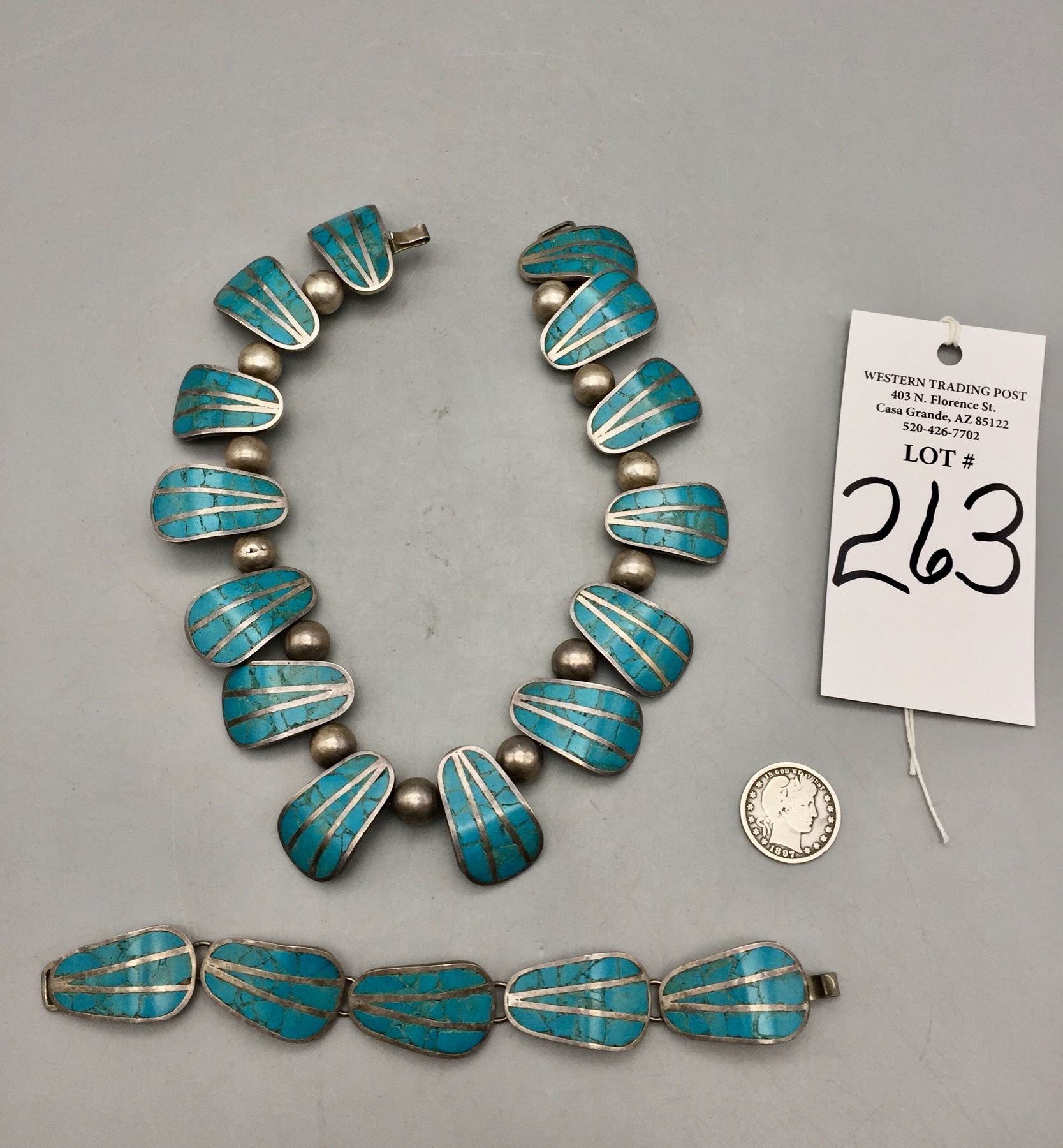 Description: Presented for sale in this lot is a beautiful turquoise choker style necklace and a link bracelet set. Has beautiful inlay design silver tabs with handmade beads in between. It is marked, Guaranteed Sterling. Maker: It is Mexican Hallmarked and the initials appear to be FMS. Approx. Age: Vintage. Size: Bracelet is 7-1/4†long X 7/8†wide. Necklace fits a 13†neck. Combined weight is 158.8 grams. Condition: Good for its age, normal wear expected. Please look closely at the pictures - they are an important part of our description. Shipping: There will be a $5 handling / packaging fee for shipping this lot. The actual cost of postage will be added on top of that.