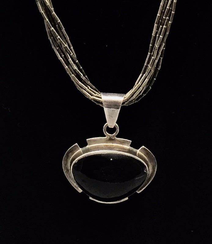 Maker: Unknown. Approx. Age: Vintage. Size: Fits 24” around the neck and the pendant is 1.75” long. Weighs 62g. Condition: Vintage good, normal wear expected. Additional Info: Sterling where applicable. 10 strands of liquid silver. Please look closely at the pictures - they are an important part of our description. Shipping: There will be a $5 handling / packaging fee for shipping this lot. The actual cost of postage will be added on top of that.
