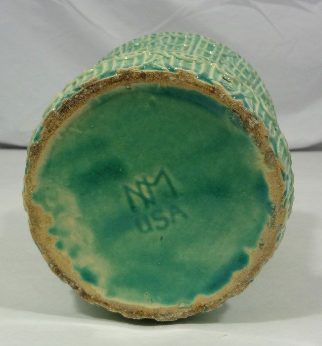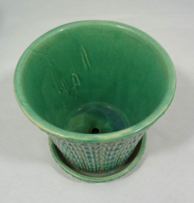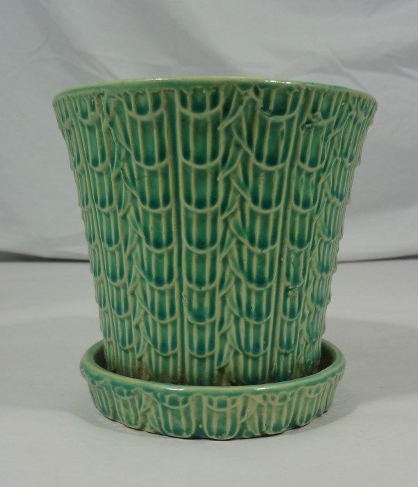 Vintage N McCoy Flowerpot with attached saucer in turquoise blue with fish scale pattern. Marked NM on base. No chips or cracks, approximately 7" tall. A similar piece was found in Warman's "McCoy Pottery" book on page 94. Est Value $20.00-30.00.