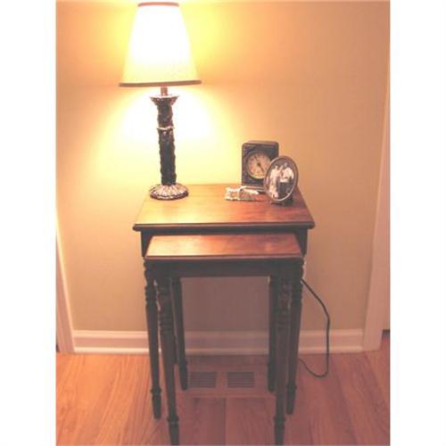 <P>Two tables which are made of walnut I believe. One table nests into the other. Both have dainty but classicly turned legs. I don not know the age of these tables, but they are 20th century.