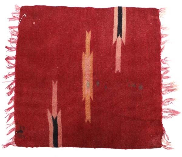 Vintage New Mexico Chimayo Wool Textile, measures 18'' square, fringed on both ends, some staining and minor moth damage in a few spots