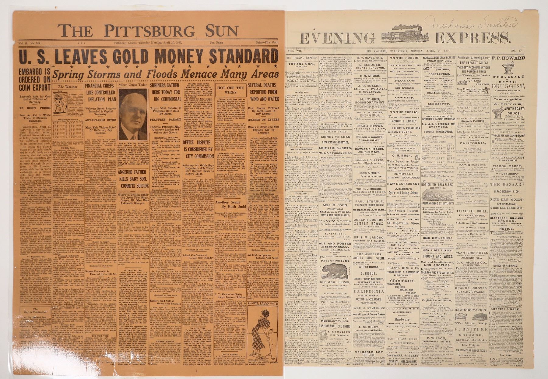 Two vintage newspaper pages. First, is from the Evening Express of Los Angeles, dated Monday, April 27, 1874. It's from an inside section and features several ads pushing everything from furniture to ales and porters. There's also an announced Sheriff's Sale.