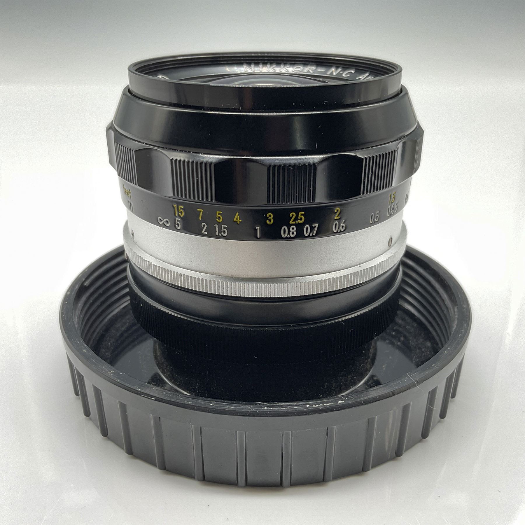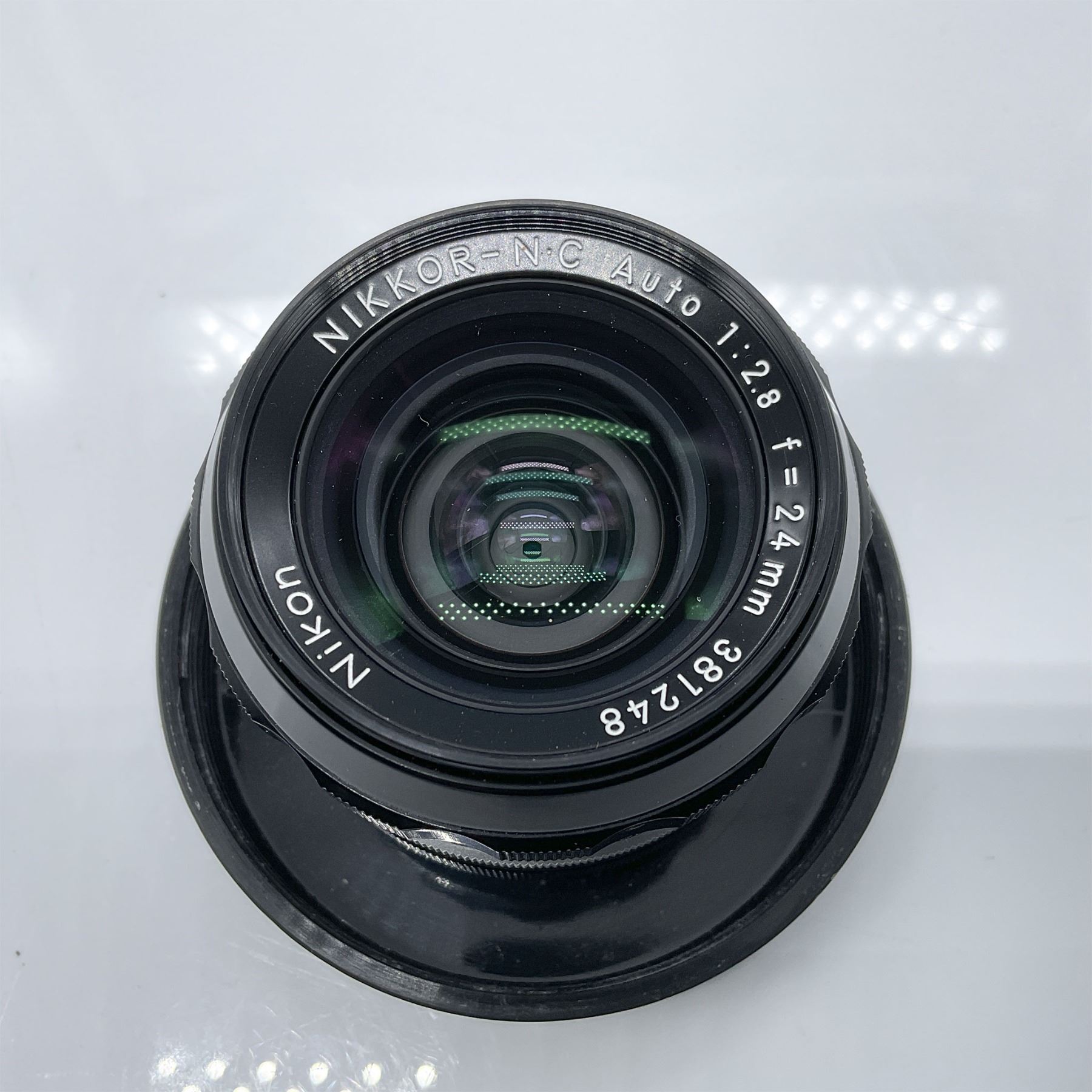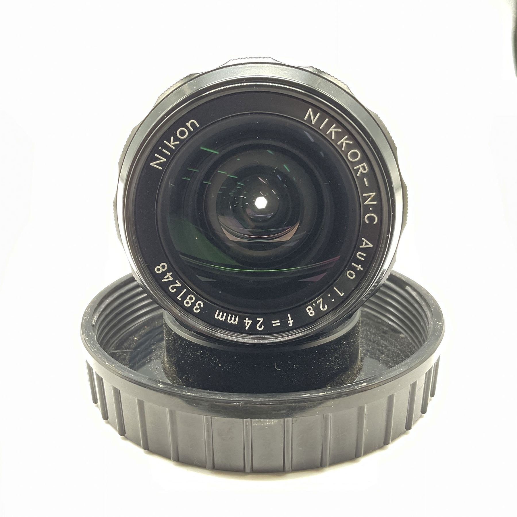 Vintage Nikon Nikkor-NC Auto 24mm f/2.8 wide-angle lens, serial number 381248, made in Japan. This lens features a 52mm filter thread, precise aperture control, and multi-coated optics for superior image quality. Includes the original plastic Nikon display case and front lens cap. Measures approximately 2.75"H when extended. A highly collectible and functional piece for photography enthusiasts and Nikon collectors alike.