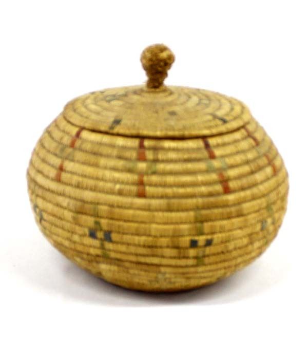 Antique/Vintage Native American Northwest Coast Alaskan Lidded Basket, measures 7'' x 8'', the finial on the lid is damaged, multi-toned