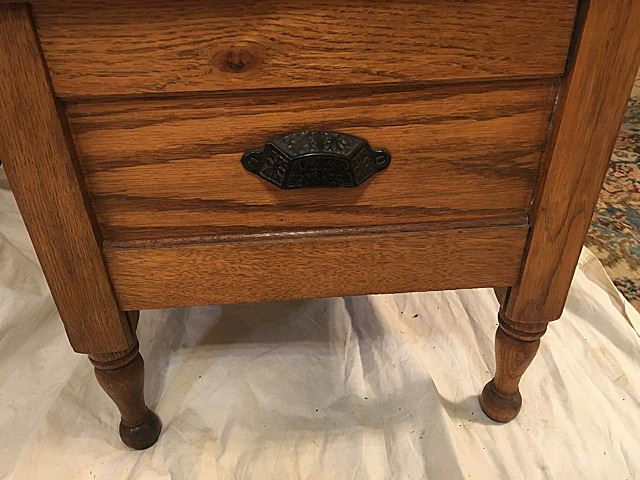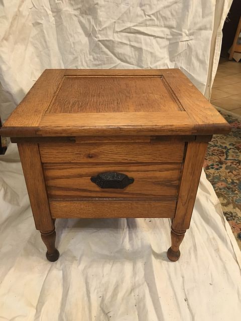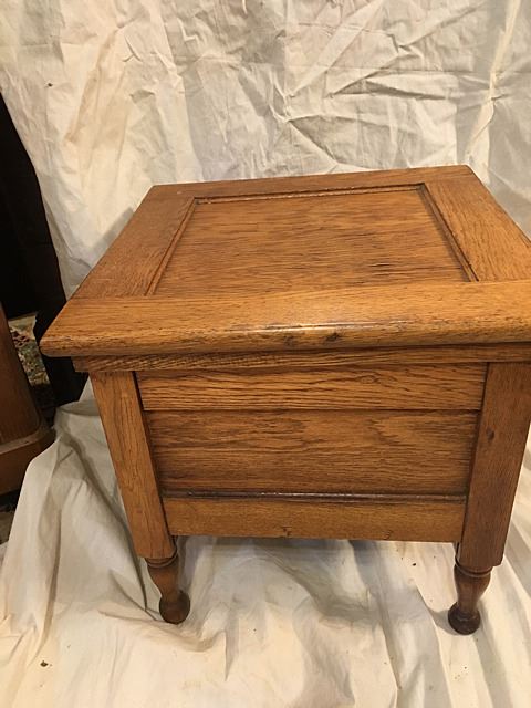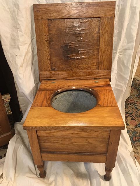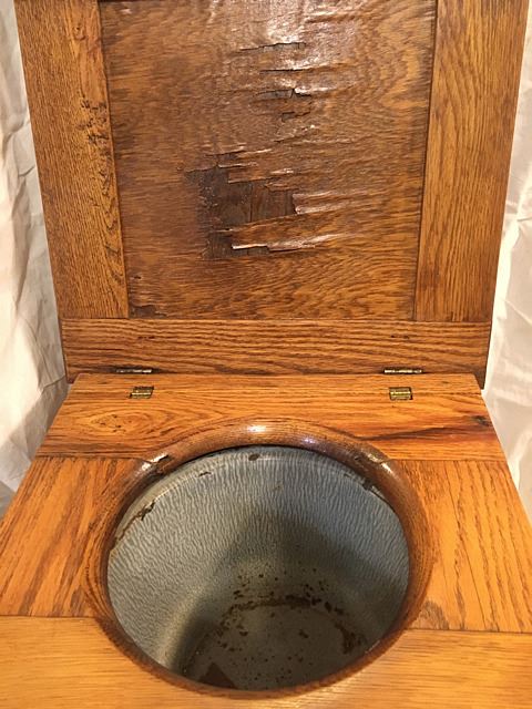 Vintage oak commode, portable with handles, bucket still there, still in all together with closing lid.