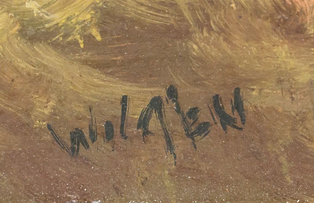 Oil on board, framed. Featuring a man standing on a dirt path between two red-roofed houses. Signed "Wolken" near the bottom left. Label on verso reads "GENUINE ORIGINAL OIL PAINTING". 20 x 25 cm (7.75 x 10 inches), framed size: 30 x 35 cm (12 x 14 inches).