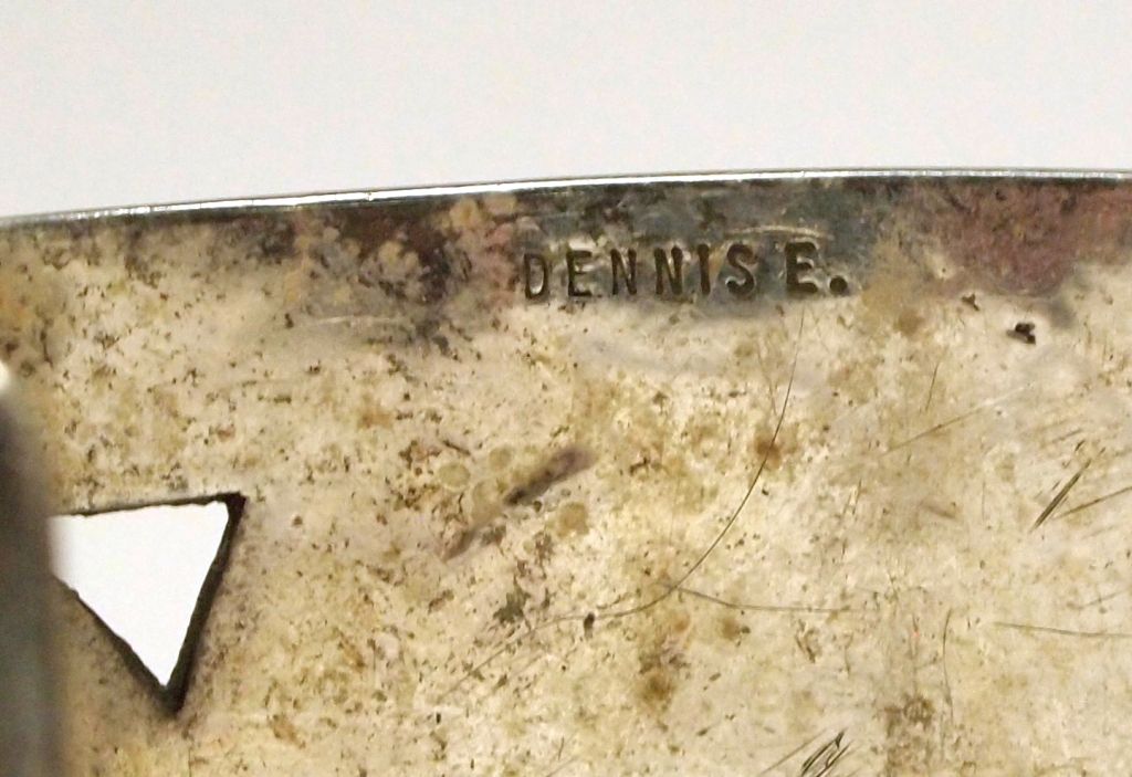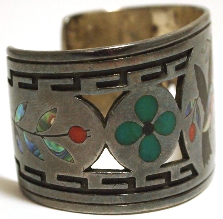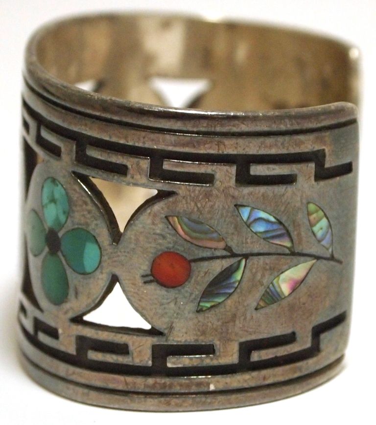 Measures 4-3/4" around with a 1-1/4" gap, 1-3/8" wide. This is a very old piece, one of the first Dennis ever made (not even signed with Nancy). Stones present: Abalone, Mother of Pearl, Turquoise, Green Turquoise, Coral.