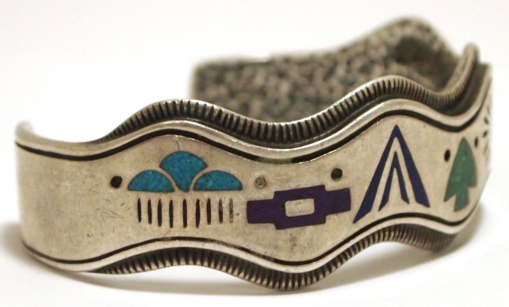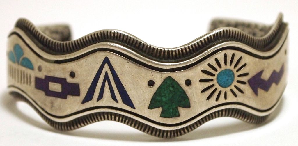 Vintage Old Pawn Multi-Stone Inlay Sterling Silver Cuff Bracelet