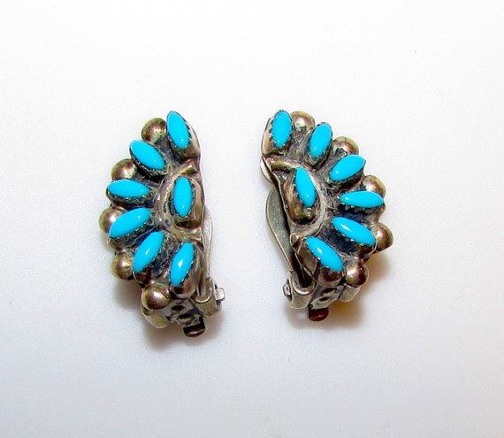 For your consideration is this exquisite Old Pawn Native American Zuni sterling silver turquoise cluster clip on earrings in wonderful vintage condition. This fabulous pair features a traditional Zuni design in sterling silver accented with Sleeping Beauty mine turquoise cluster design. The earrings are unmarked as all Old Pawn jewelry and have been tested for silver content. Measures about 3/4" long. Stunning example of vintage Native American art to add to any collection!