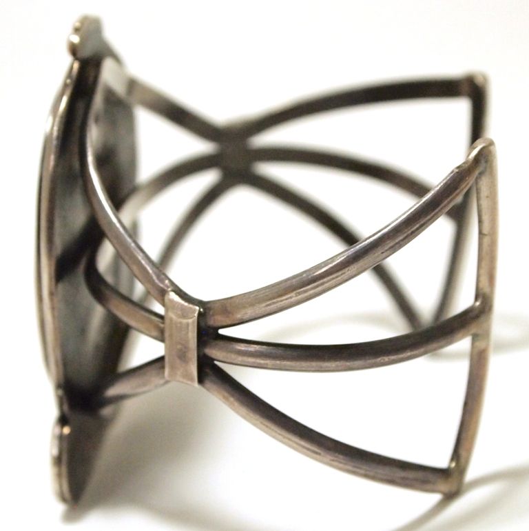 Measures 5-3/8" around with a 1-1/8" gap, 2-1/4" wide. Stones present: Mother of Pearl, Onyx, Amber, Turquoise. Inlay measures 1-1/2" tall by 1-1/8" wide.