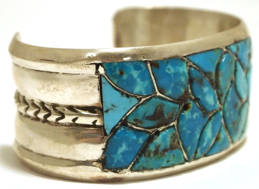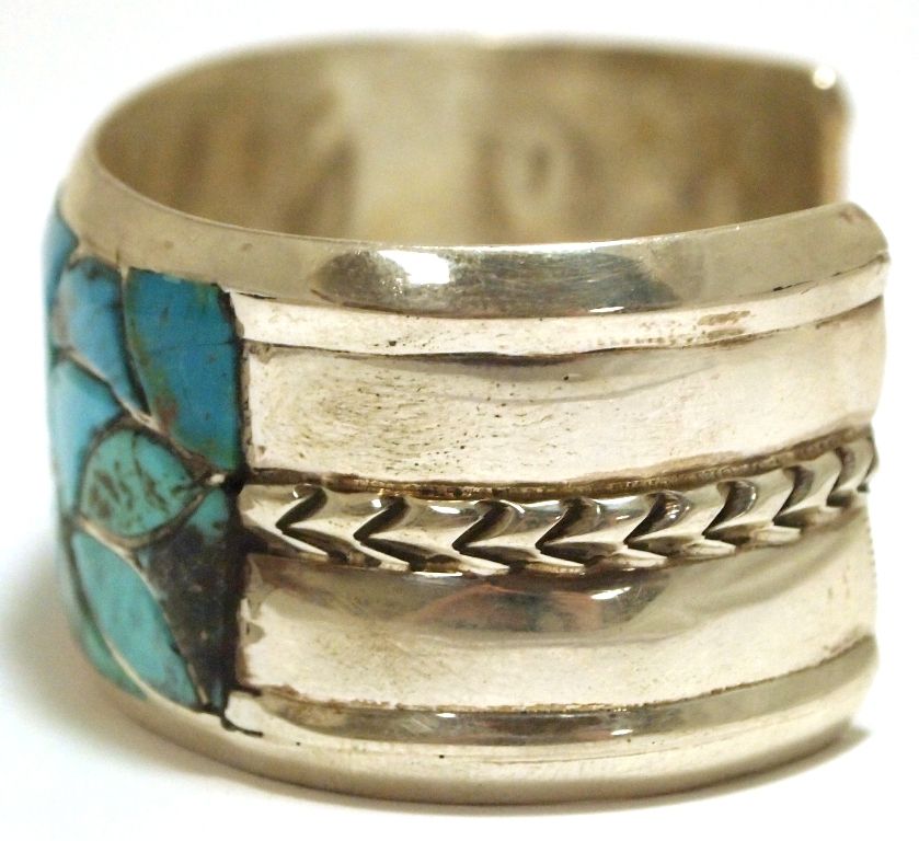 Vintage Old Pawn Zuni Turquoise Inlay Sterling Silver Cuff Bracelet - ALH